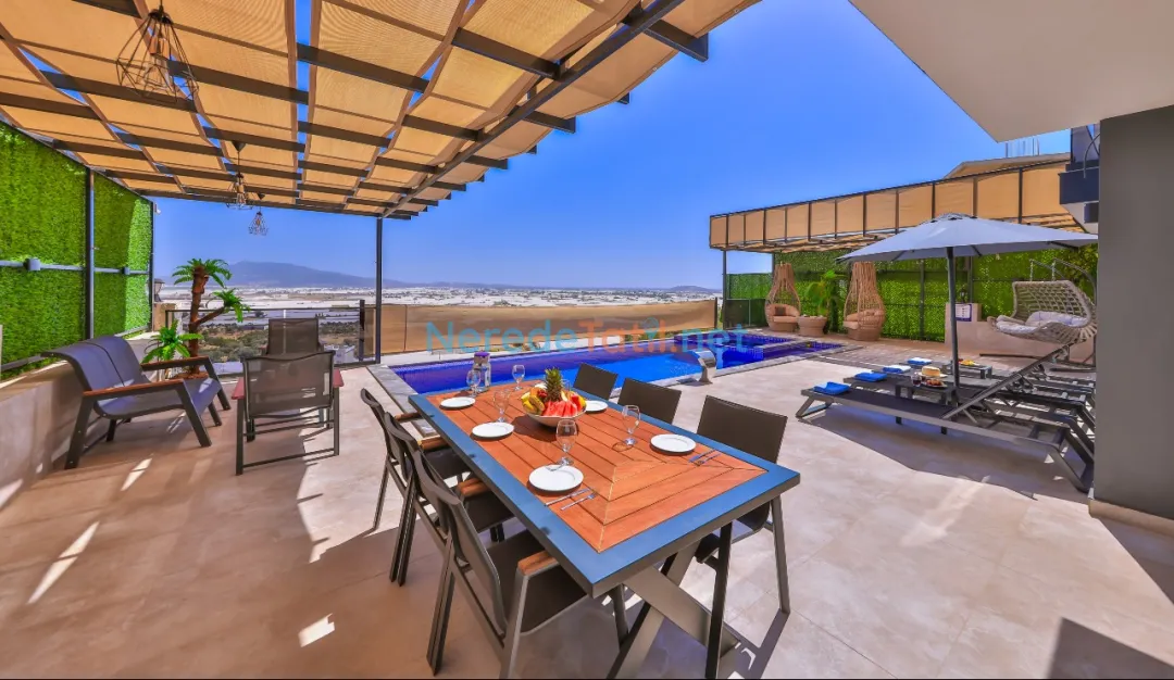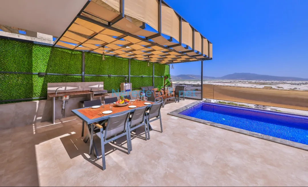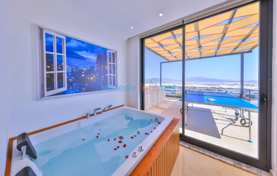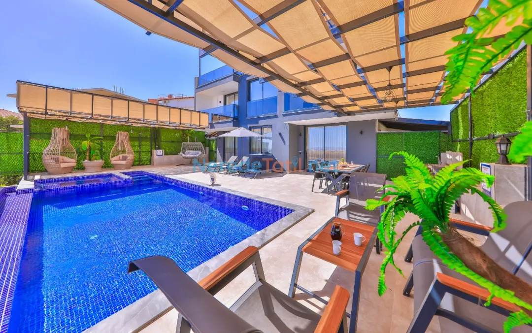 Villanın özel havuzu 3.55 metre genişliğinde ve 10 metre uzunluğunda olup, 1.5 metre derinliğiyle yüzme keyfini doyasıya yaşatır. Havuzun korunaklı yapısı ise muhafazakar tatile uygun bir ortam sunar. Dinlenmek isteyenler için jakuzi mükemmel bir tercih olacaktır.