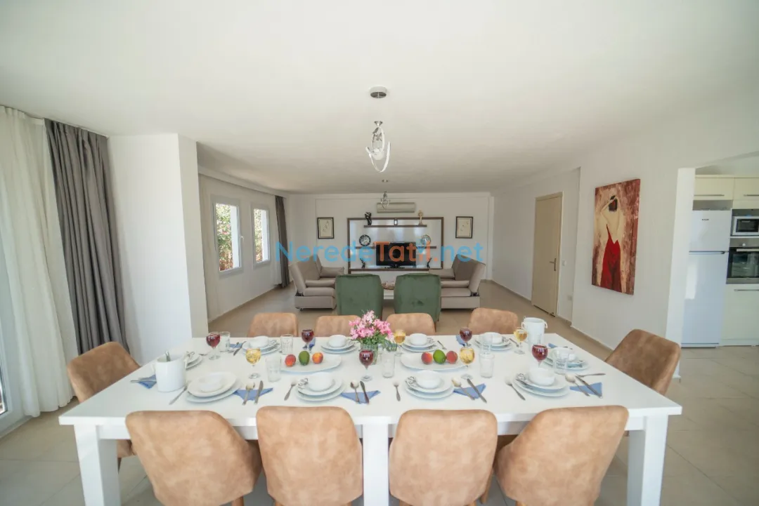 Villanın iç mekanları lüks ve modern bir tarzda dekore edilmiş olup, konforunuz için her şey düşünülmüştür. Tatil boyunca BBQ - Mangal, ütü, saç kurutma makinesi gibi olanaklar da mevcuttur. Araçla seyahat eden misafirler için otopark imkanı da bulunmaktadır.