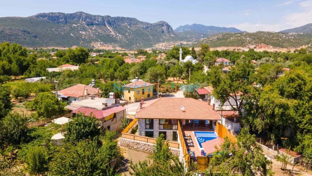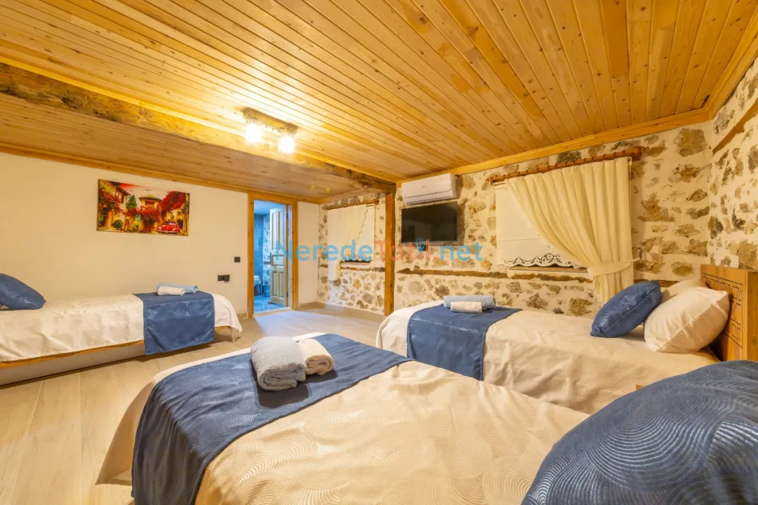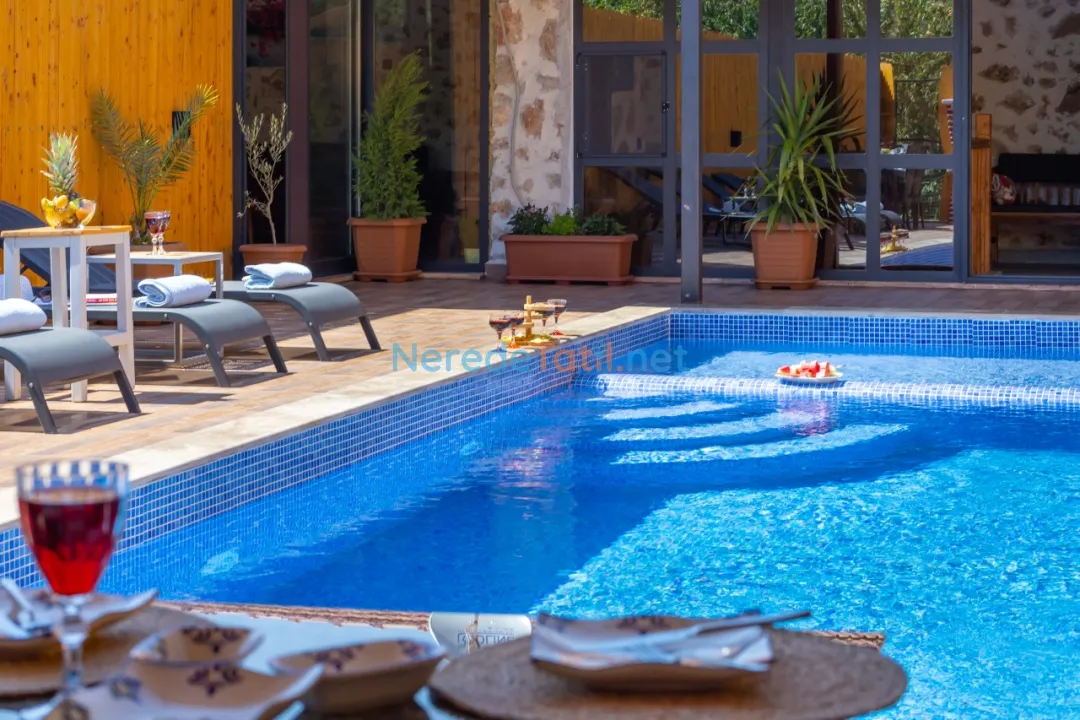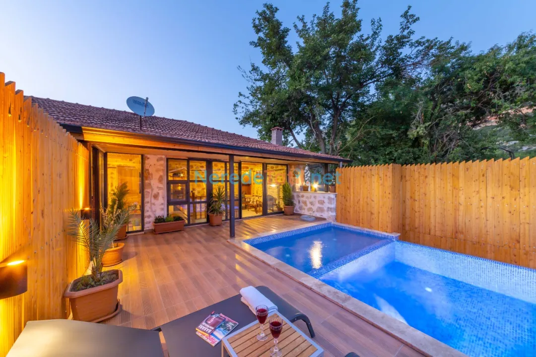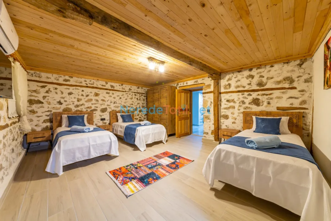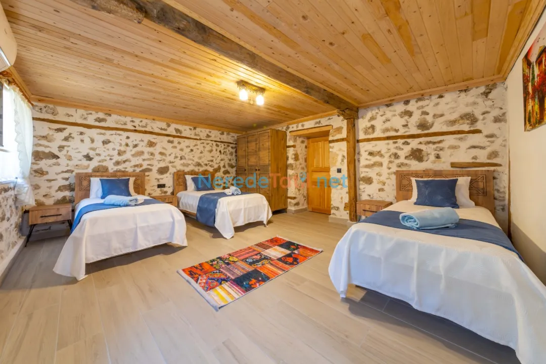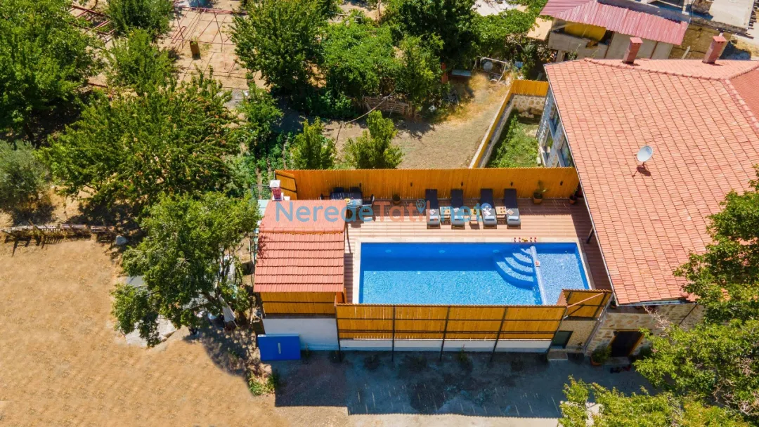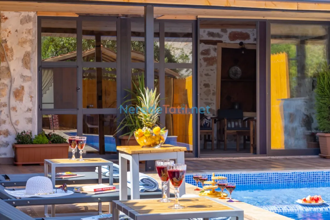 Bezirgan'da yer alan bu eşsiz villa, doğa manzarası ve özel havuzlu tasarımı ile büyüleyici bir tatil deneyimi sunuyor. Villa, 3 yatak odası ve her biri en-suite olan 3 banyo ile 7 kişiye kadar konaklama imkanı sunar. Çift kişilik iki yatak ve üç tek kişilik yatakla donatılan odalar, her misafirin konforunu ön planda tutuyor.