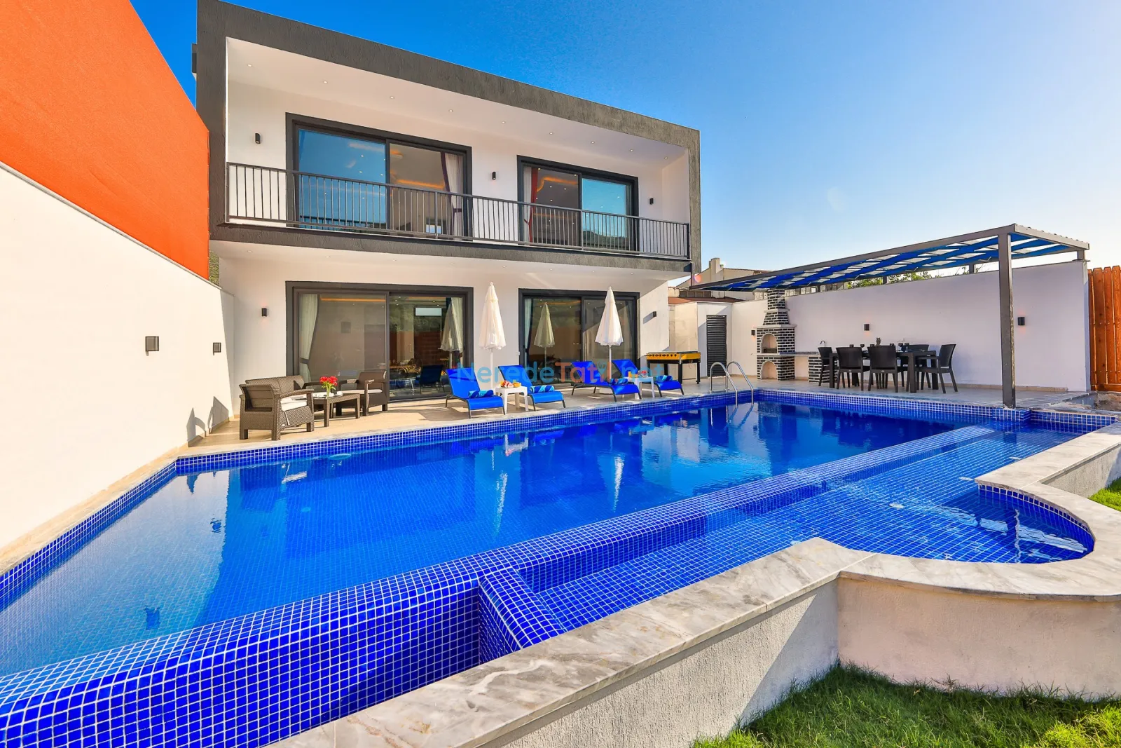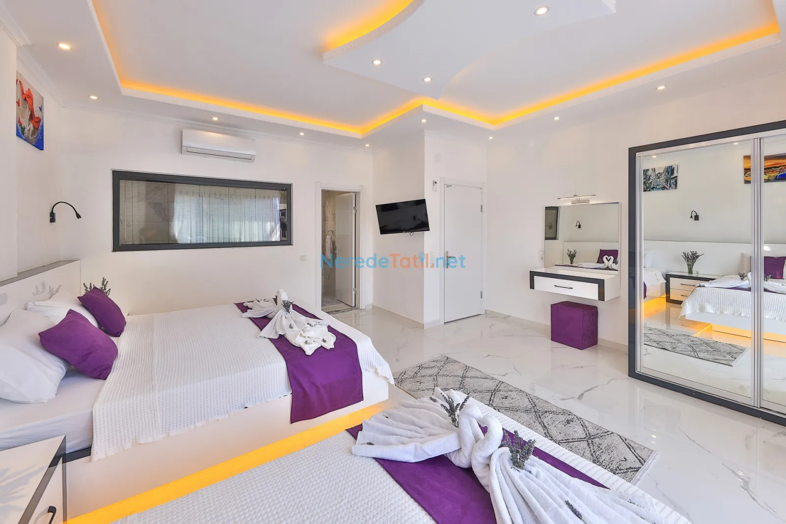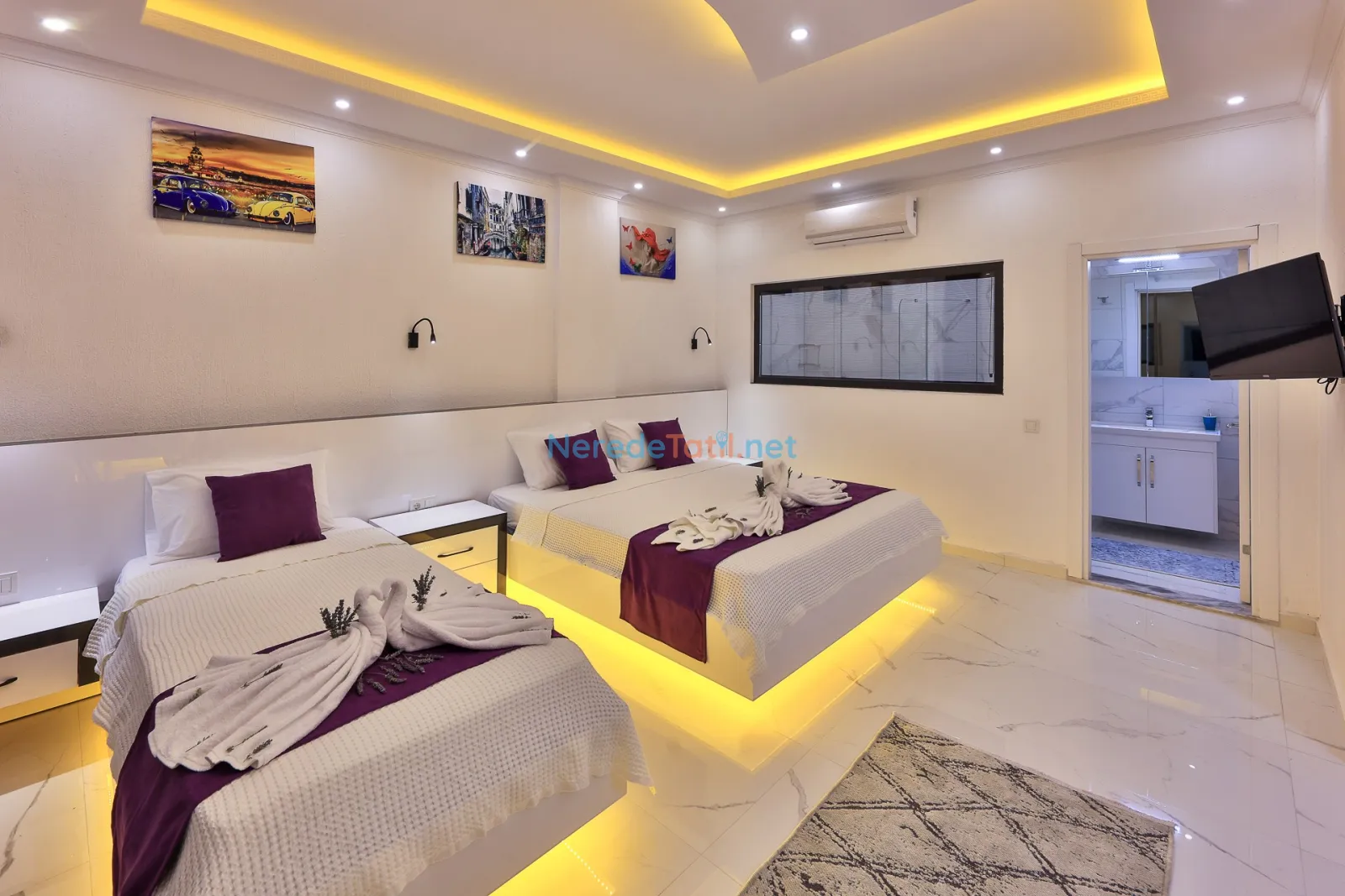Villamız beş kişilik kapasiteye sahip olup, iki yatak odası ve iki banyosu ile rahat bir konaklama imkanı sunmaktadır. Odalarda iki çift kişilik ve bir tek kişilik yatak bulunmaktadır. Geniş ve modern iç mekan tasarımıyla evinizin konforunu aratmayacak bir yaşam alanı sunulmaktadır.