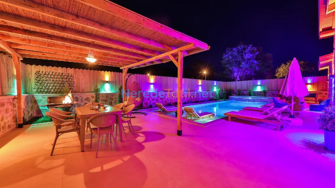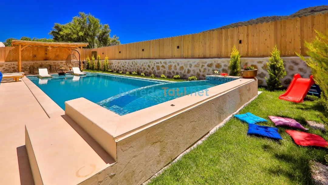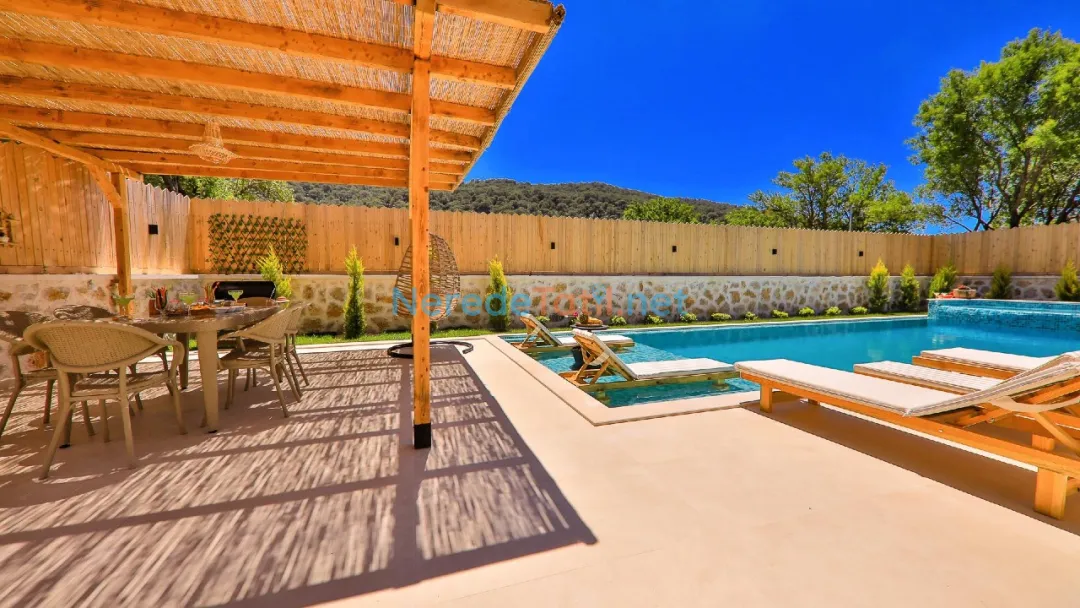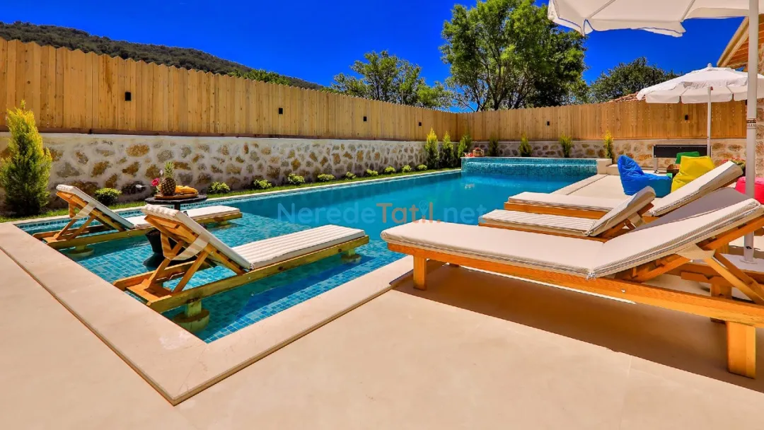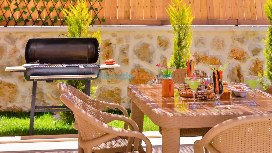 Misafirler, özel ve korunaklı havuzun tadını çıkarabilir. Havuzun büyüklüğü 4 metre en, 10 metre boy ve 1.55 metre derinliğiyle geniş bir yüzme alanı sunar. Doğa manzaralı terasta, sevdiklerinizle keyifli anlar geçirebilir ve barbekü yapabilirsiniz.
