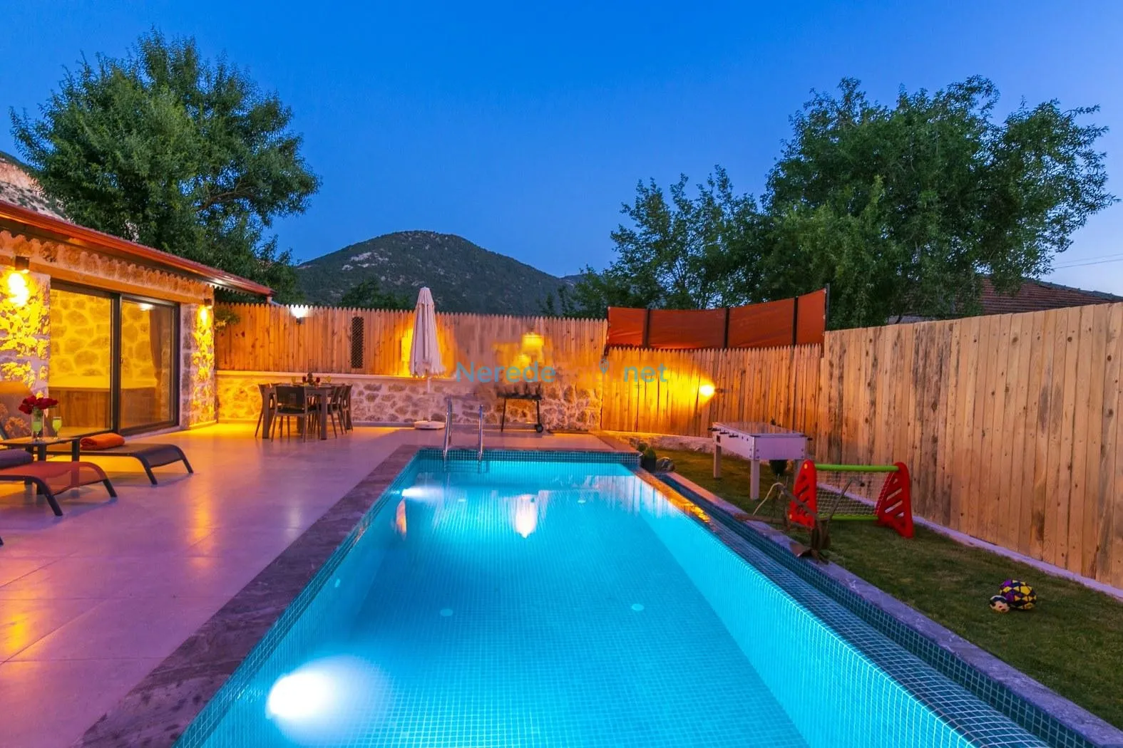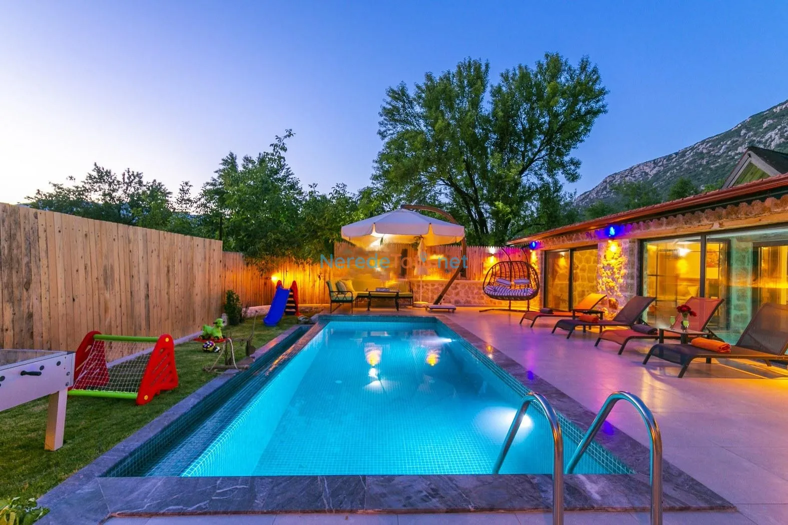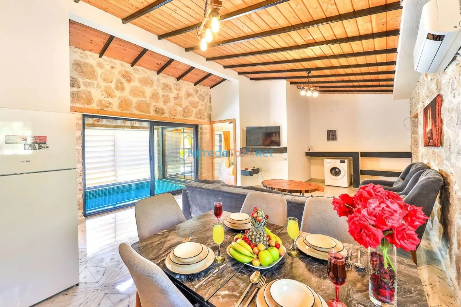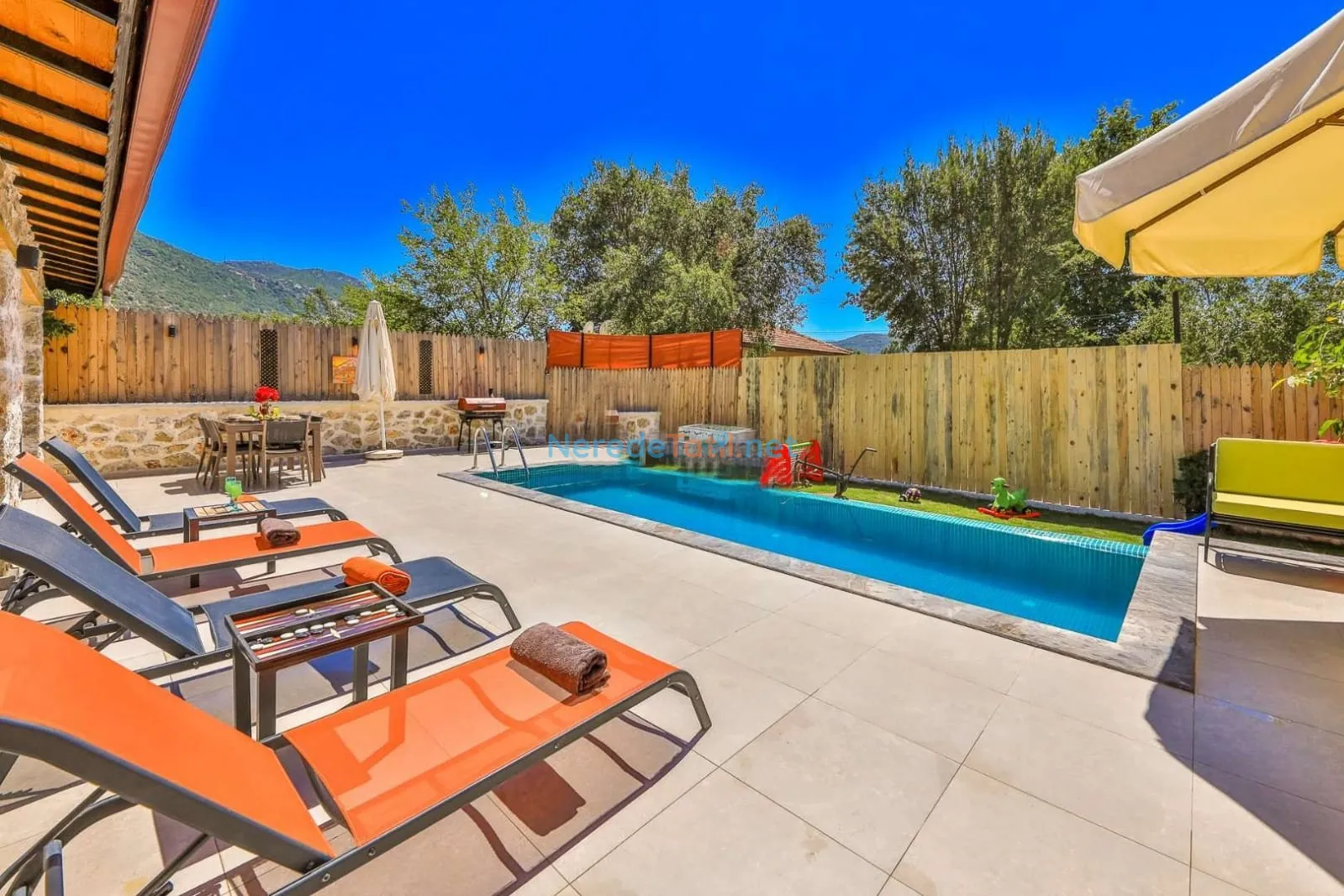 Villanın kapalı ve ısıtmalı havuzu, her mevsim konforlu yüzme imkanı sunarken, jakuzi ise günün yorgunluğunu atmak için mükemmel bir fırsat sağlıyor. Tatiliniz boyunca BBQ - Mangal alanında keyifli anlar yaşayabilir, doğa manzarası eşliğinde huzurlu zamanlar geçirebilirsiniz.