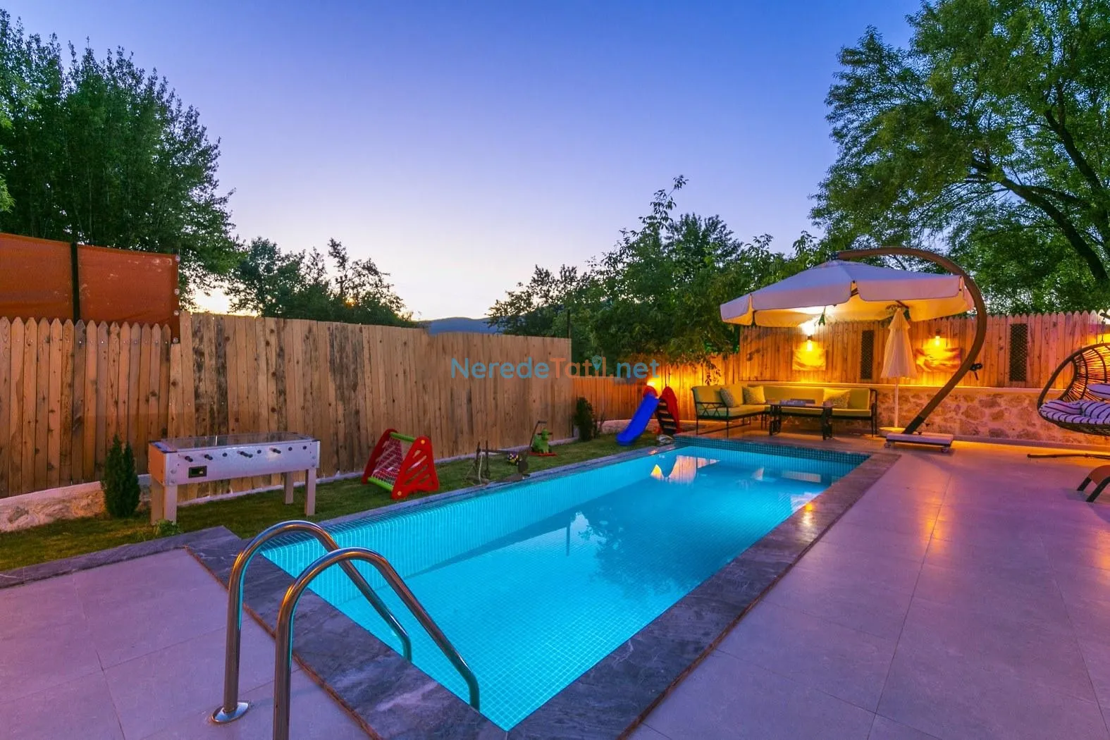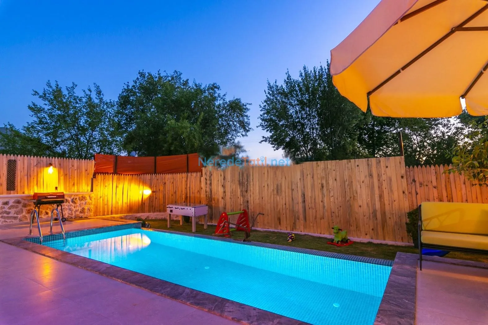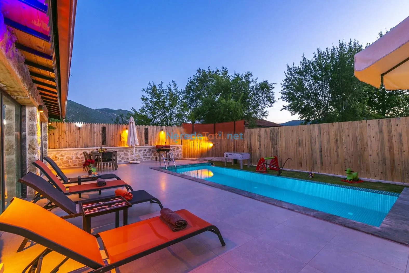 Hamam ve oyun alanı gibi ek olanaklarla zenginleştirilmiş olan villa, langırt gibi eğlenceli aktiviteler sunarak tatilinizi daha keyifli hale getiriyor. Ayrıca, bahçeli ortamı ve otopark imkanı ile size ve sevdiklerinize konforlu bir konaklama deneyimi vaat ediyor.