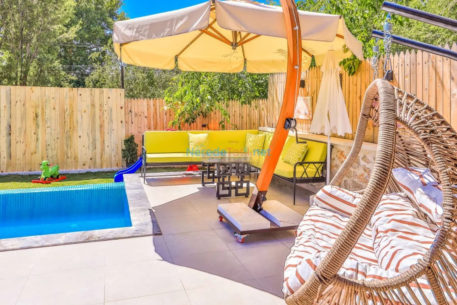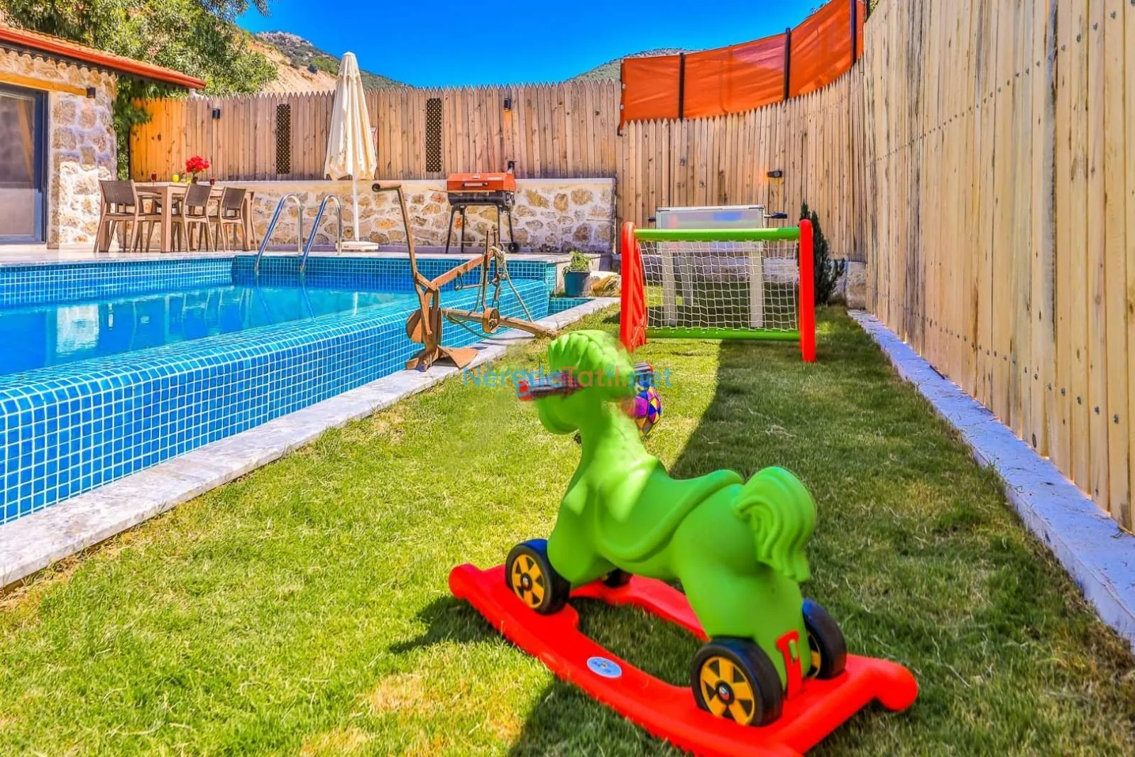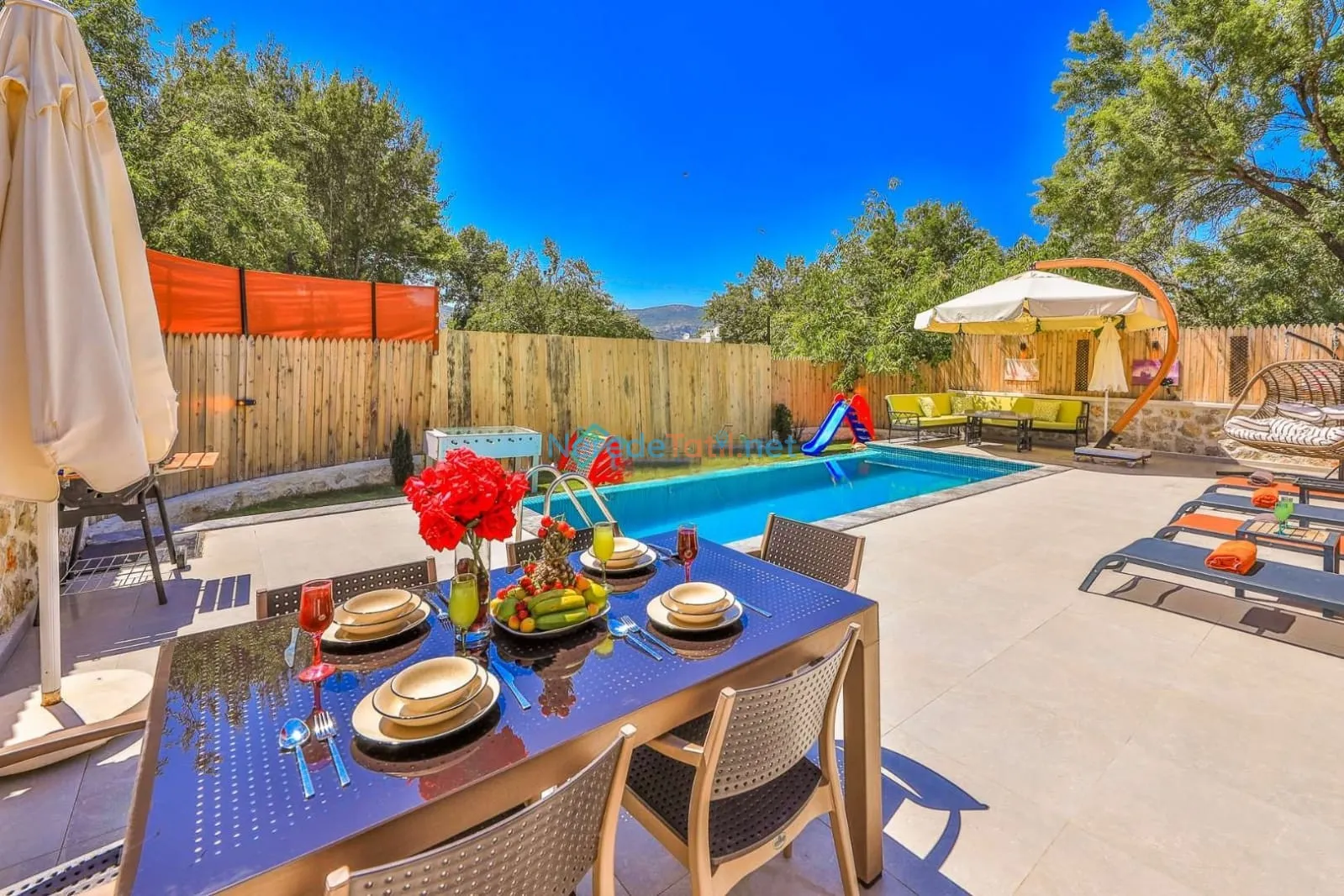 Hamam ve oyun alanı gibi ek olanaklarla zenginleştirilmiş olan villa, langırt gibi eğlenceli aktiviteler sunarak tatilinizi daha keyifli hale getiriyor. Ayrıca, bahçeli ortamı ve otopark imkanı ile size ve sevdiklerinize konforlu bir konaklama deneyimi vaat ediyor.