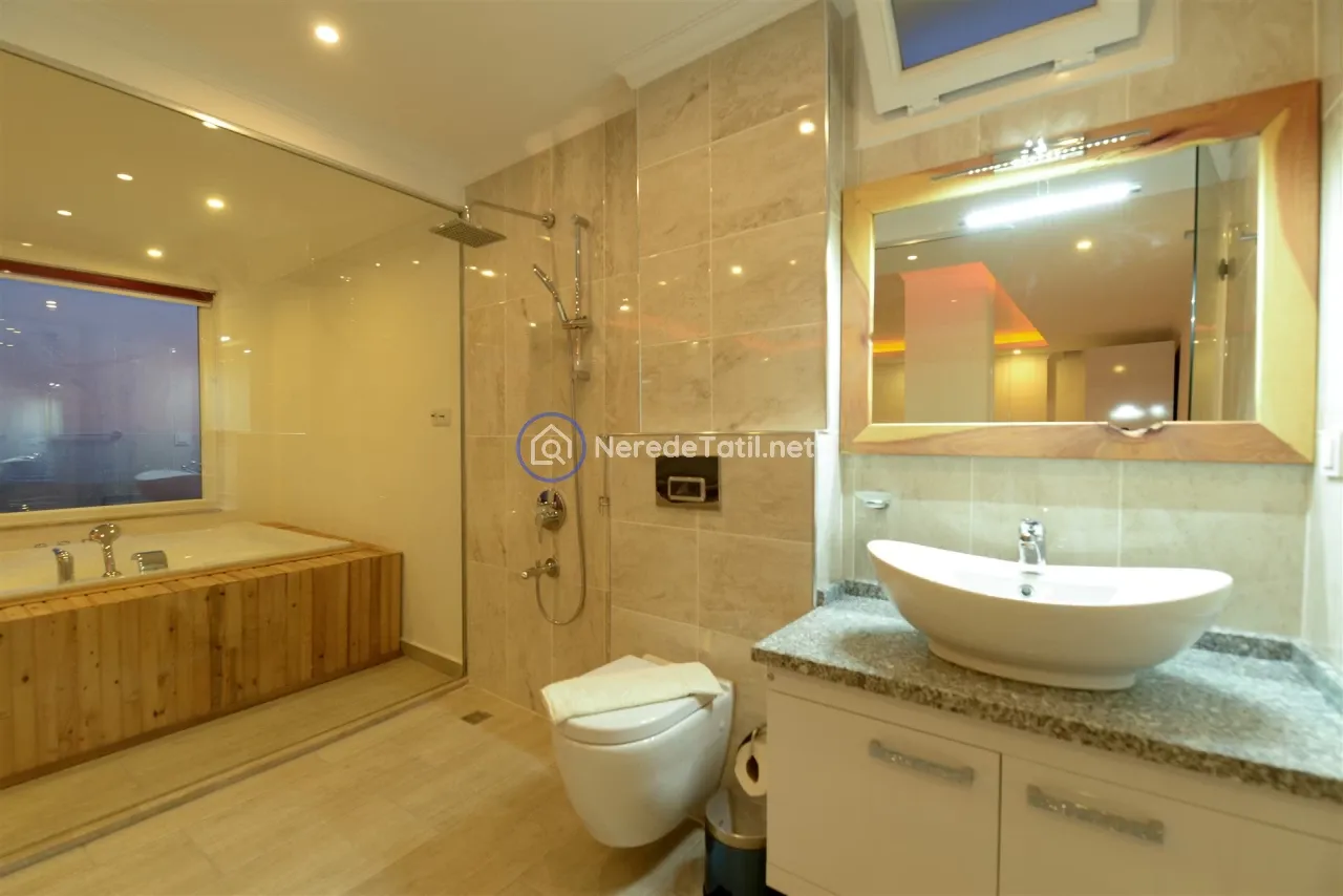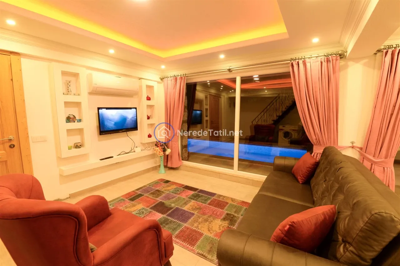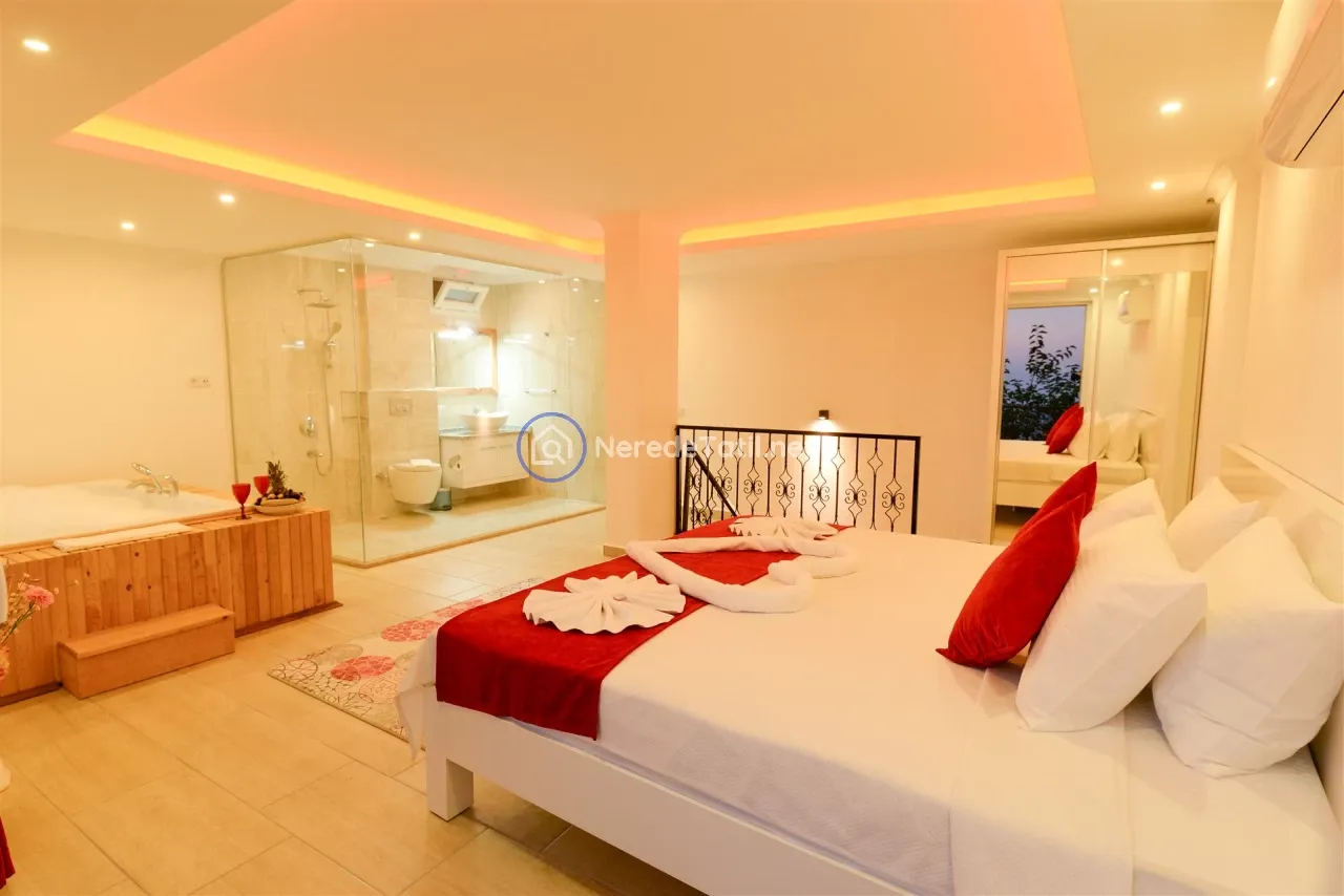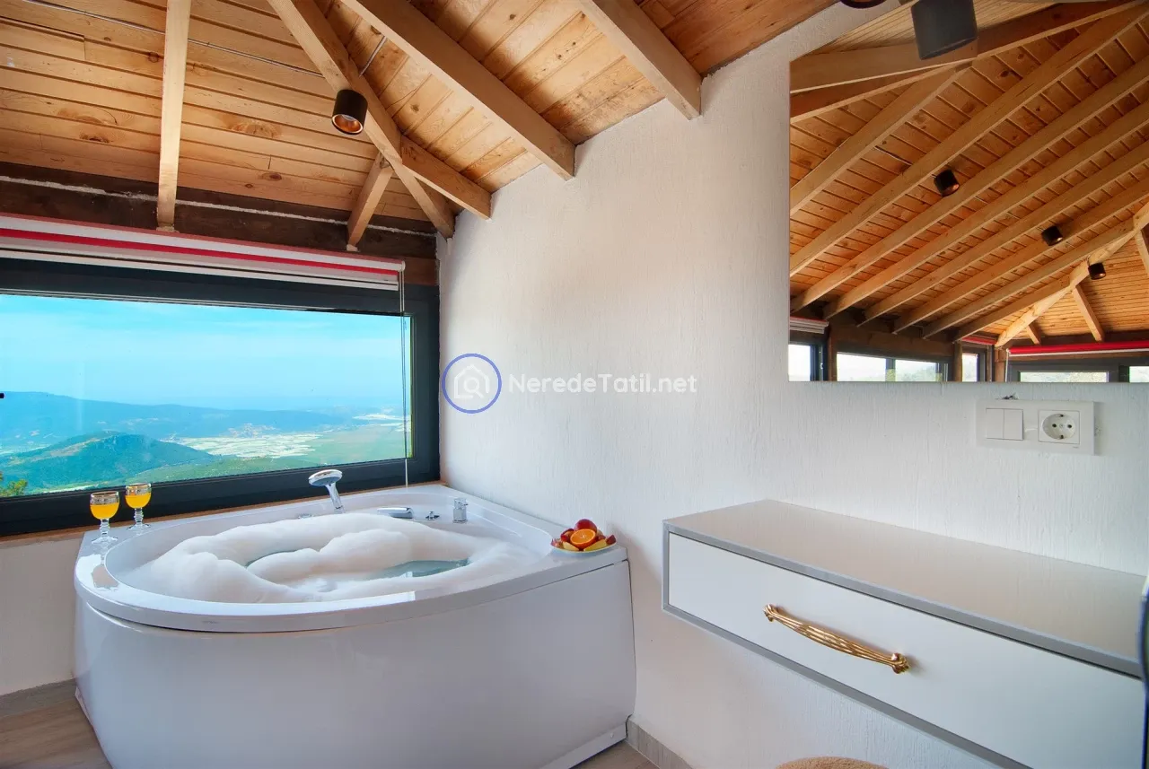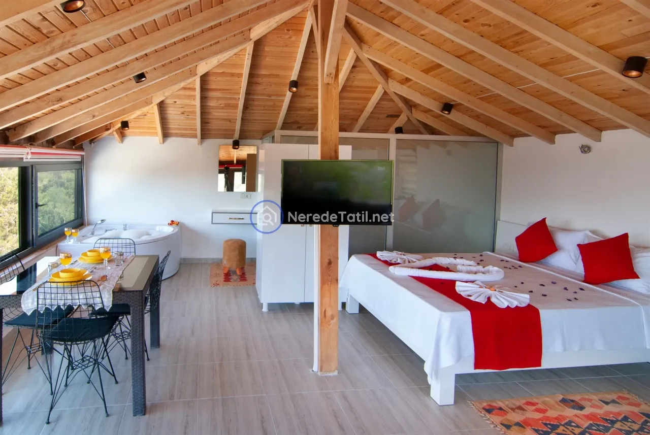 Üzümlü'nün huzurlu ve doğal ortamında yer alan bu lüks villa, konuklarına unutulmaz bir tatil deneyimi sunuyor. Muhafazakar villalar kategorisinde yer alan bu mekan, özel ve korunaklı havuzu ile mahremiyetinize önem verir. Havuzun eni 3 metre, boyu 7.5 metre ve derinliği 1.45 metredir. Doğa ve deniz manzarası eşliğinde, jakuzide rahatlayarak günün yorgunluğunu atabilirsiniz.