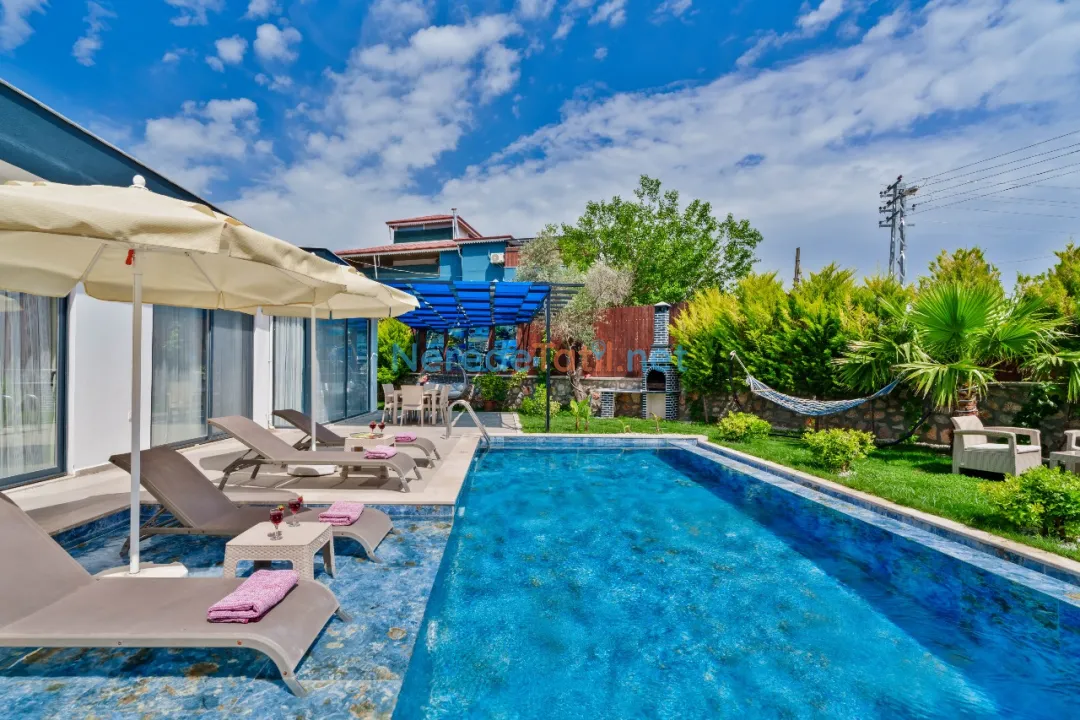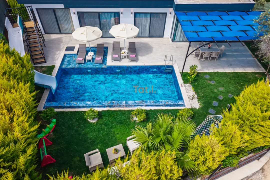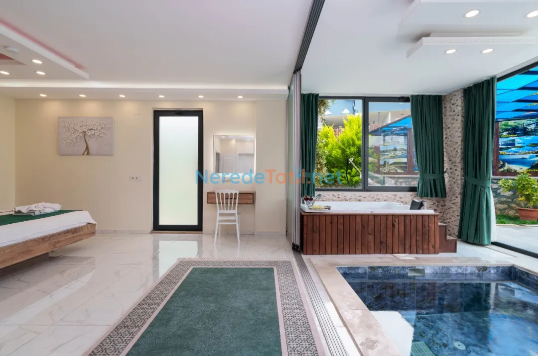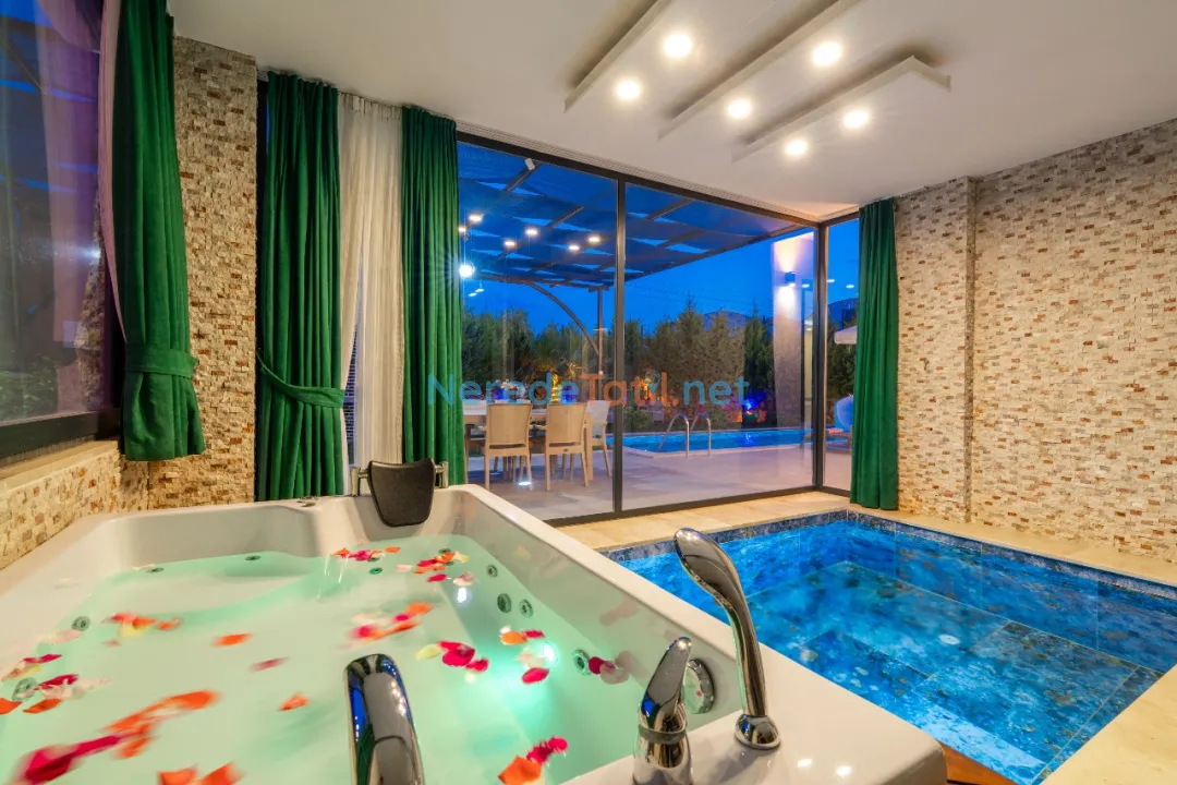 Bu villa, doğanın kalbinde yer alarak doğa manzaralı bir tatil sunar. Özel havuz (3.5m x 8.5m, 1.5m derinlik) ve kapalı havuz (2.2m x 3m, 1m derinlik) ile her mevsim yüzme keyfini çıkarabilirsiniz. Ayrıca, havuzların korunaklı olması, muhafazakar tatil tercih eden misafirler için özel bir avantaj sunar.