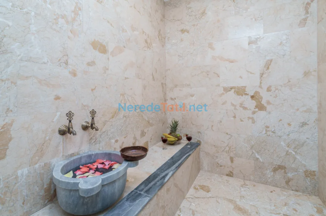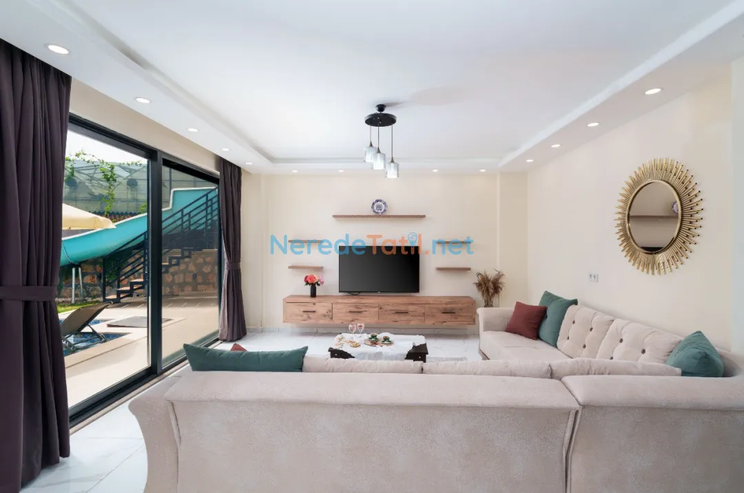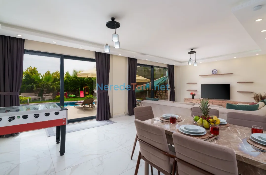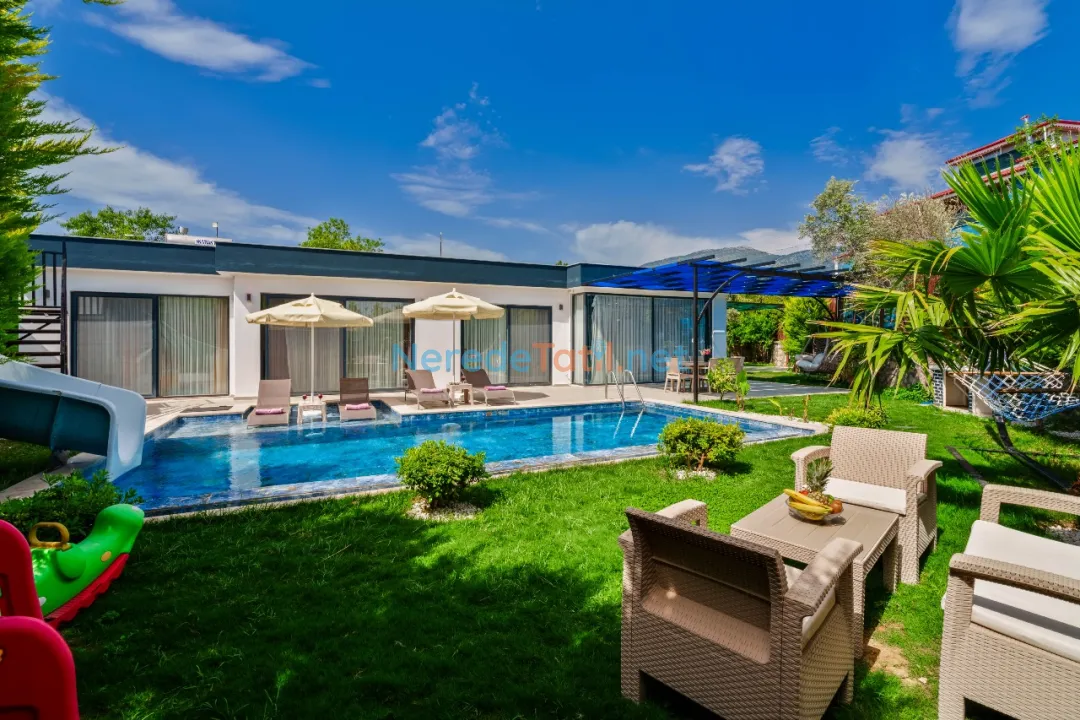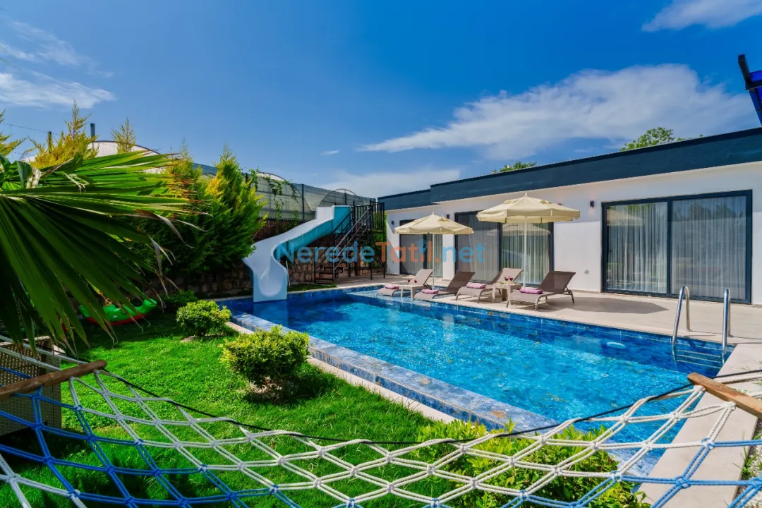Bu villa, doğanın kalbinde yer alarak doğa manzaralı bir tatil sunar. Özel havuz (3.5m x 8.5m, 1.5m derinlik) ve kapalı havuz (2.2m x 3m, 1m derinlik) ile her mevsim yüzme keyfini çıkarabilirsiniz. Ayrıca, havuzların korunaklı olması, muhafazakar tatil tercih eden misafirler için özel bir avantaj sunar.
