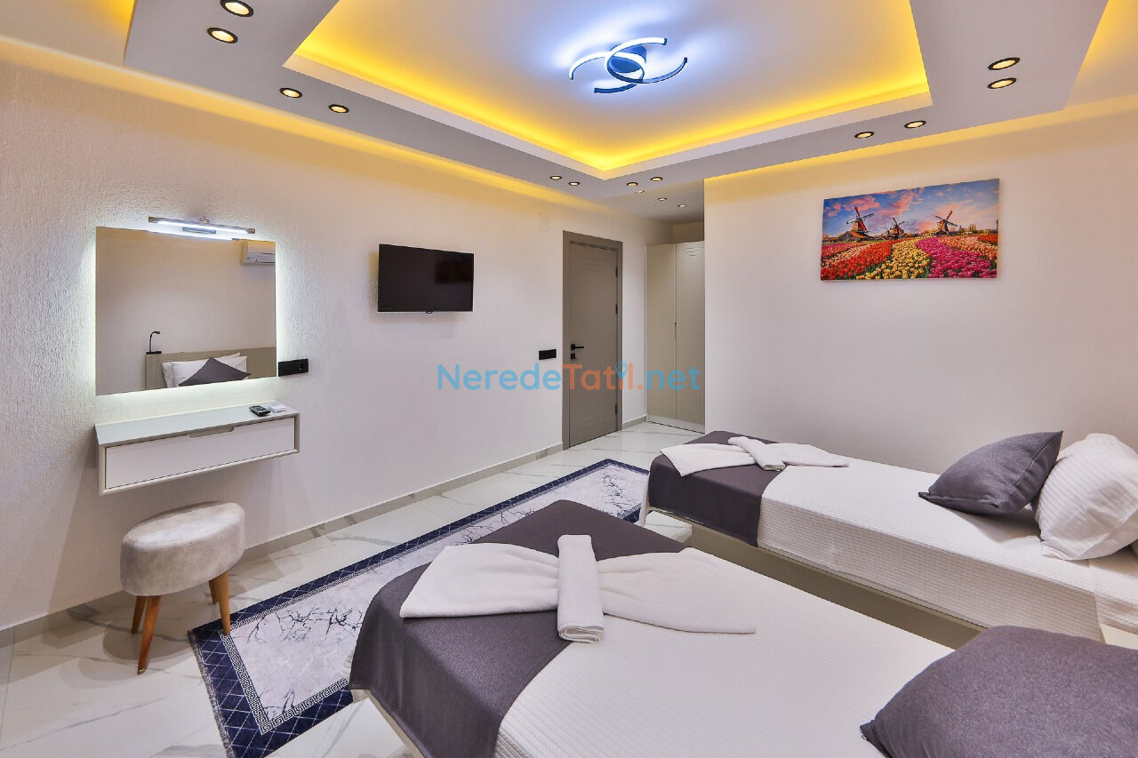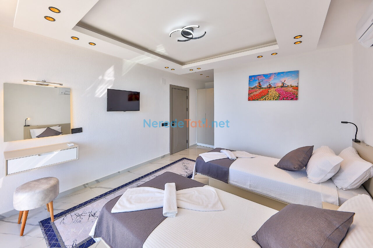 Akbel bölgesinde konumlanmış, lüks ve konforlu villa, tatilde ihtiyacınız olan her şeyi sunmaktadır. Villamız, 6 kişilik konaklama kapasitesi ile misafirlerini ağırlamaktadır. İçerisinde 3 yatak odası ve her yatak odasına ait 3 banyo bulunmaktadır. İki çift kişilik yatak ve iki tek kişilik yatak düzeniyle rahat bir uyku deneyimi sunmaktadır.