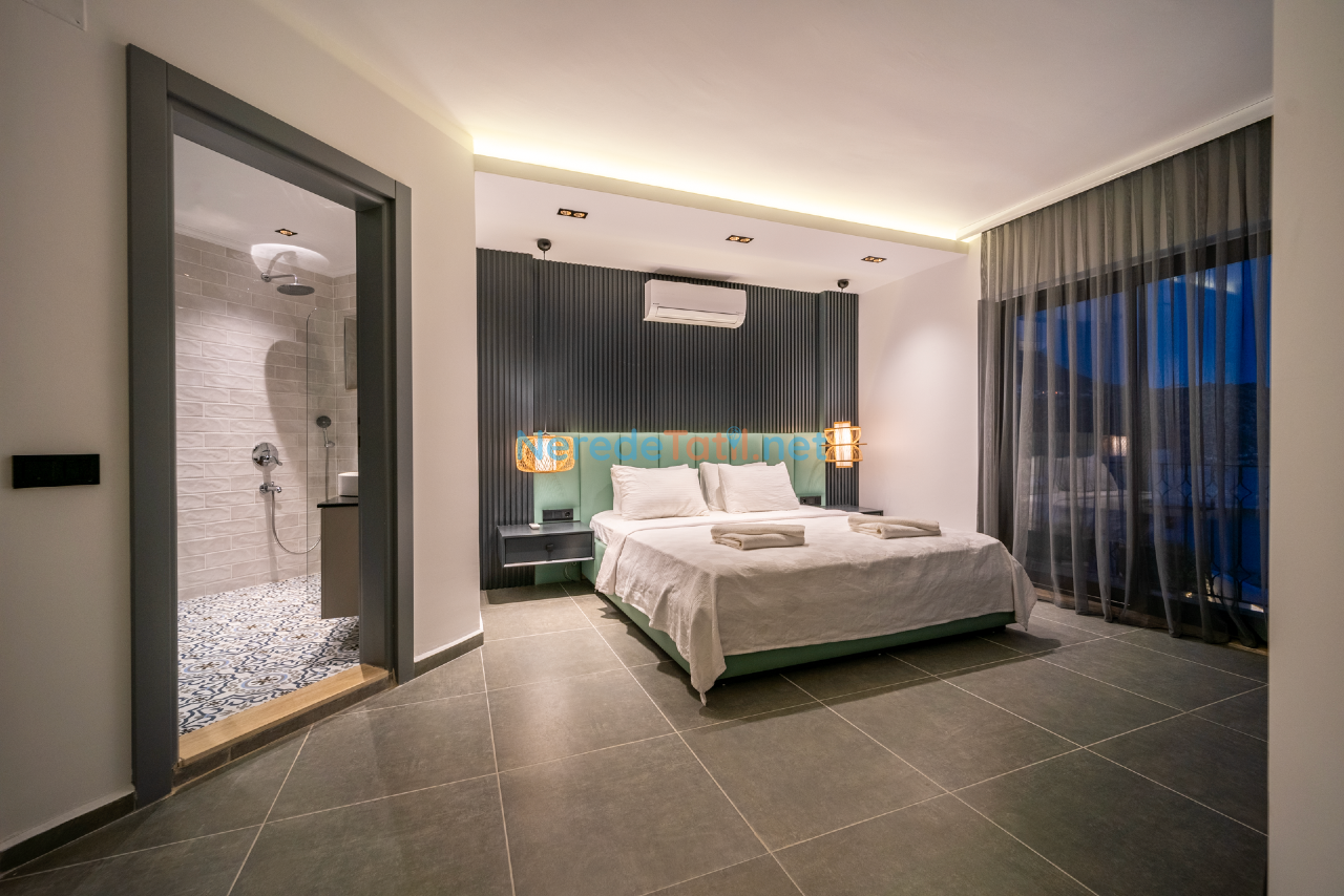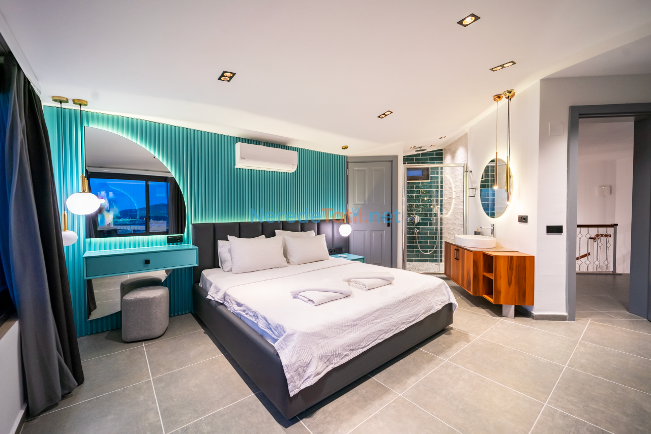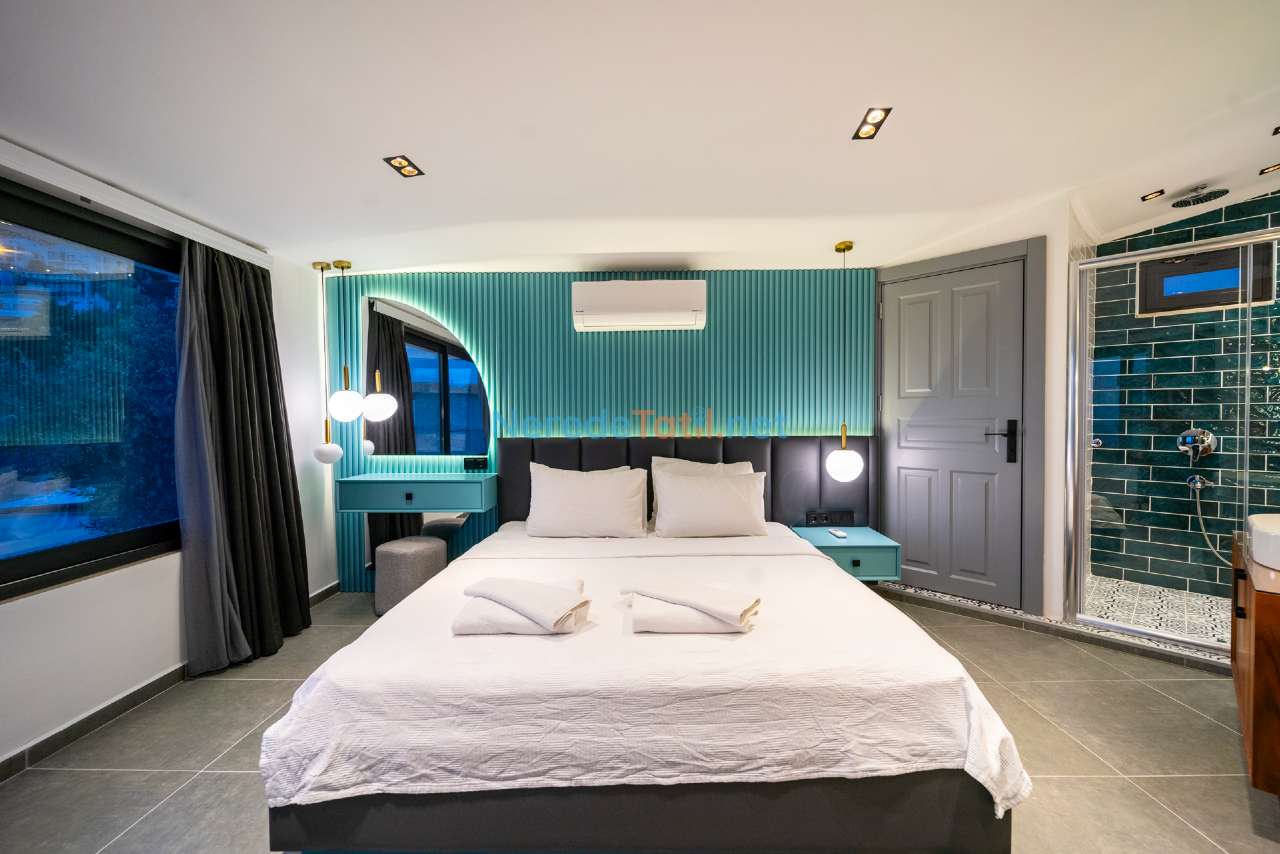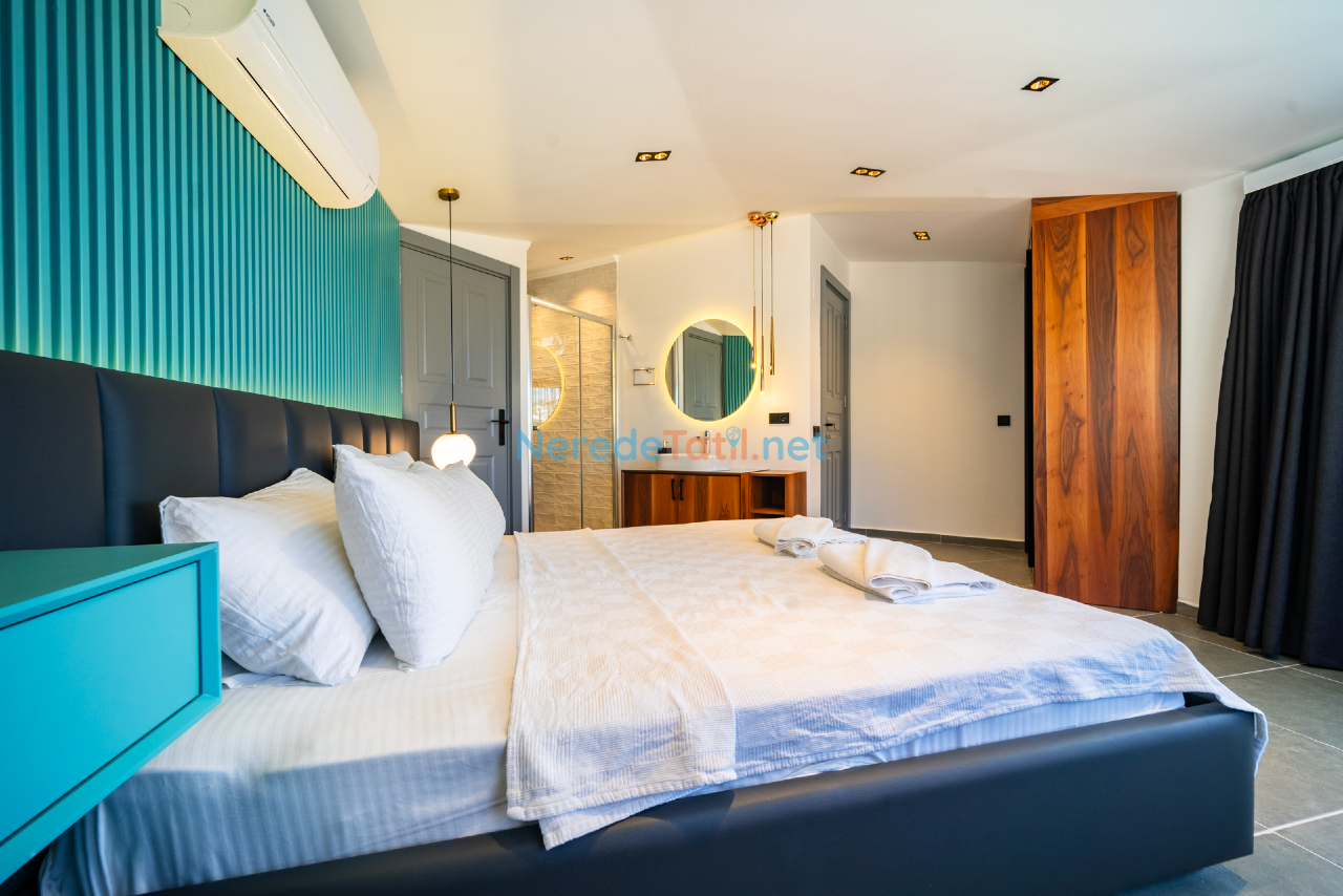 Kalkan'ın eşsiz doğasında konumlanmış bu lüks villa, konfor ve rahatlığı bir arada sunmaktadır. Toplamda 9 kişilik kapasitesi olan villa, dört yatak odası ve dört banyo ile misafirlerine geniş ve ferah bir konaklama imkanı sunar. Her odada bulunan çift kişilik yataklar ve ek bir tek kişilik yatak, tüm konuklar için rahat bir uyku deneyimi sağlar.