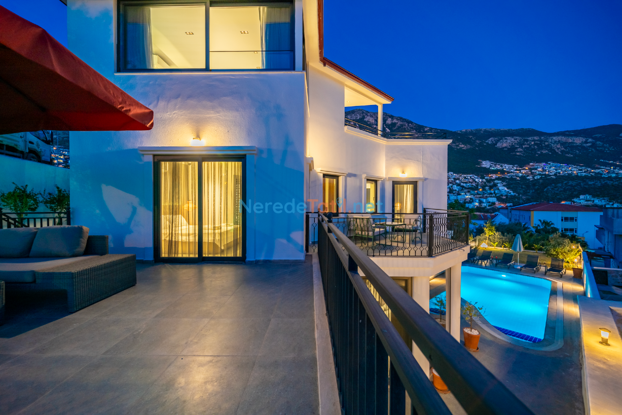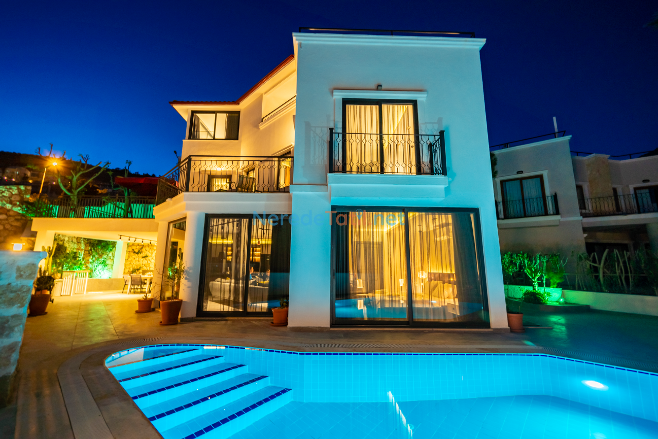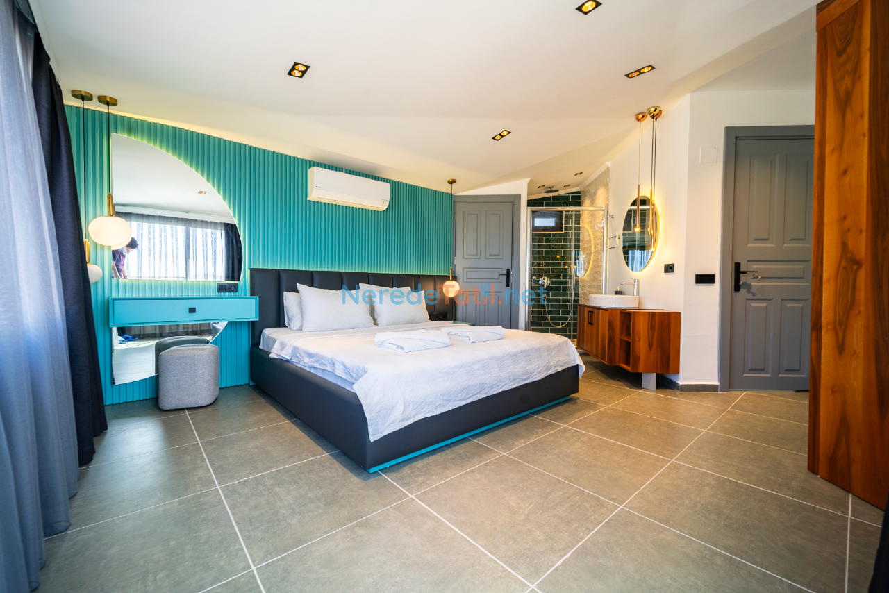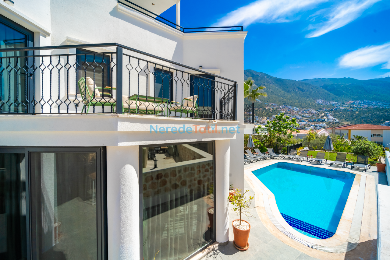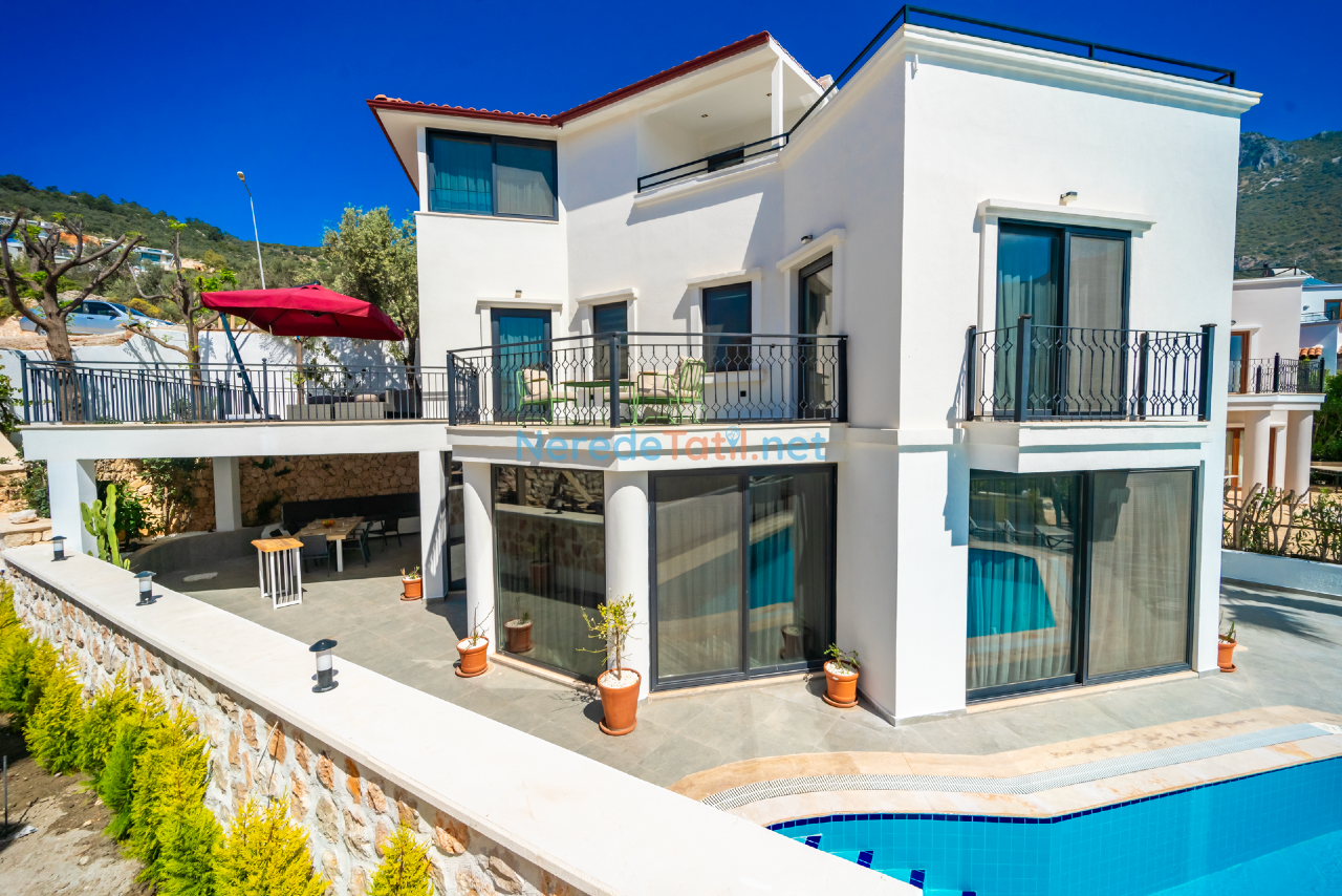 Kalkan'ın eşsiz doğasında konumlanmış bu lüks villa, konfor ve rahatlığı bir arada sunmaktadır. Toplamda 9 kişilik kapasitesi olan villa, dört yatak odası ve dört banyo ile misafirlerine geniş ve ferah bir konaklama imkanı sunar. Her odada bulunan çift kişilik yataklar ve ek bir tek kişilik yatak, tüm konuklar için rahat bir uyku deneyimi sağlar.