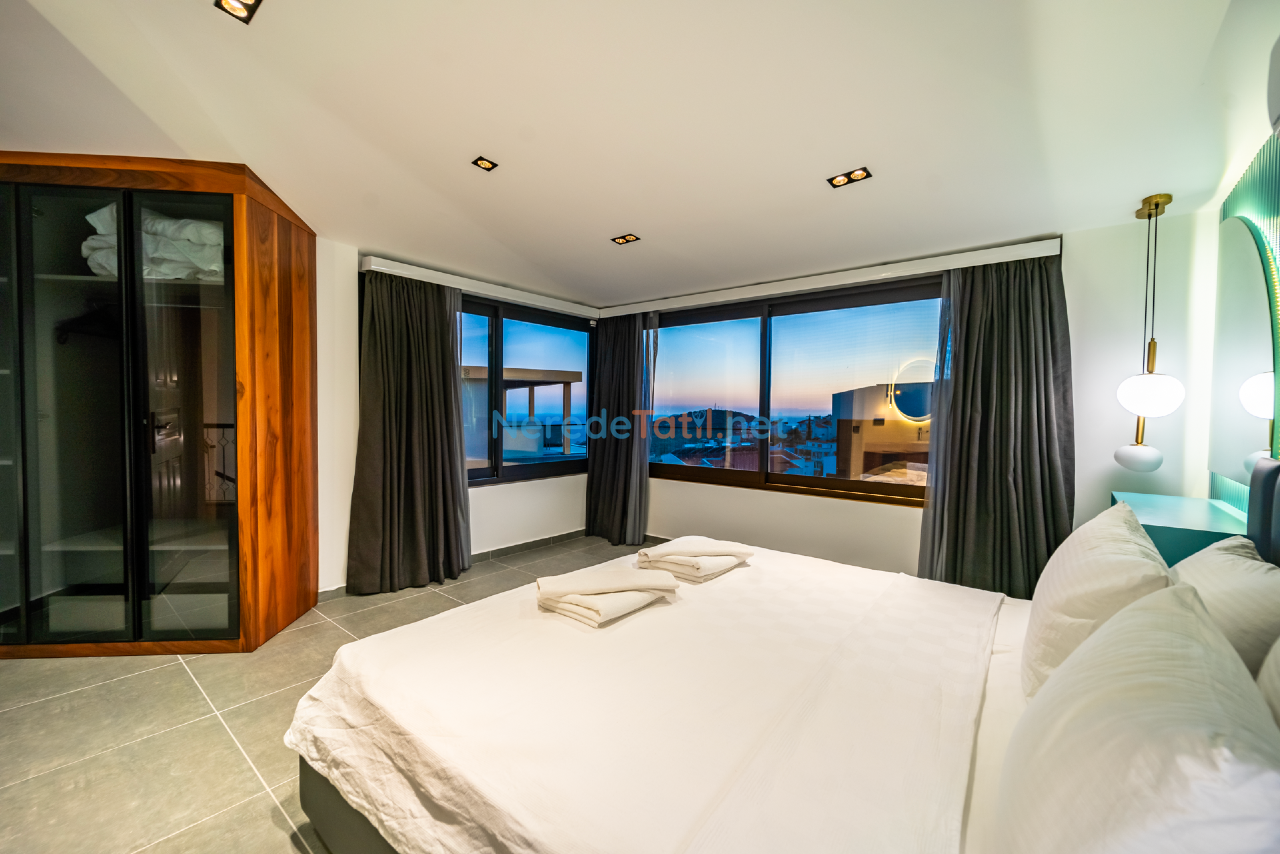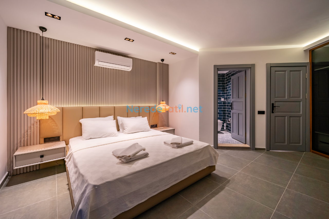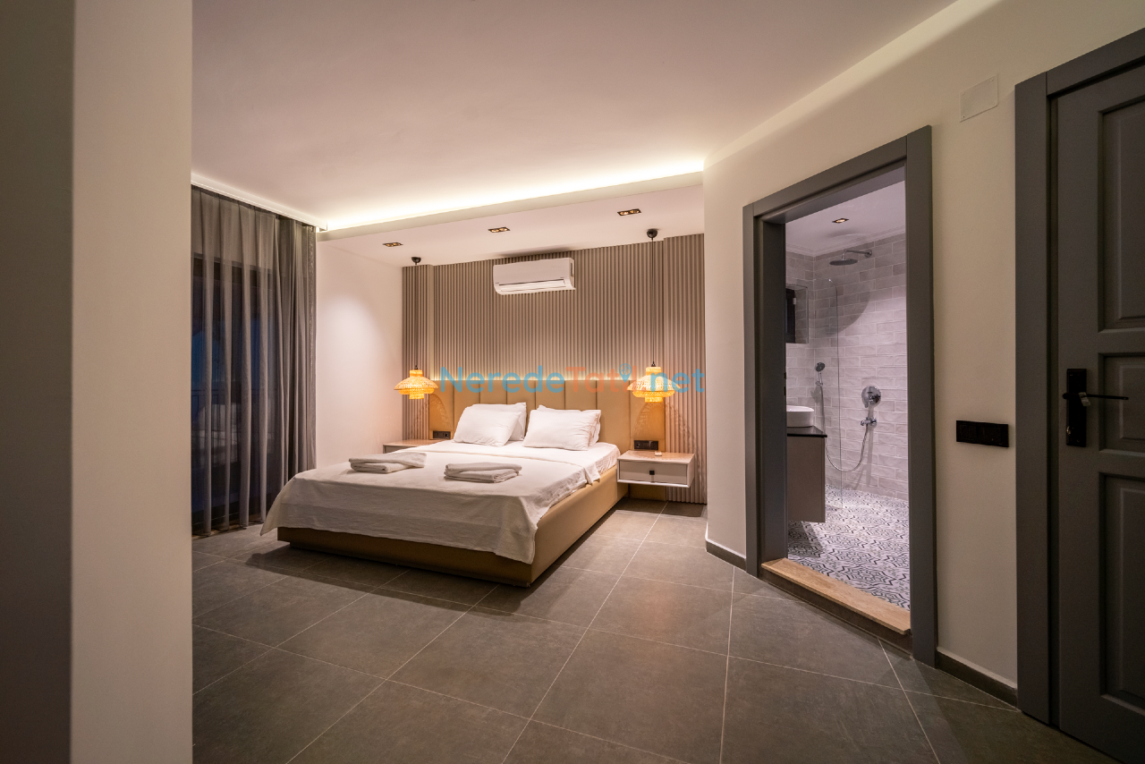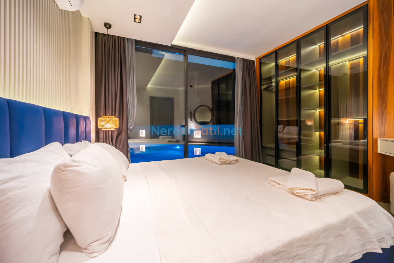Kalkan'ın eşsiz doğasında konumlanmış bu lüks villa, konfor ve rahatlığı bir arada sunmaktadır. Toplamda 9 kişilik kapasitesi olan villa, dört yatak odası ve dört banyo ile misafirlerine geniş ve ferah bir konaklama imkanı sunar. Her odada bulunan çift kişilik yataklar ve ek bir tek kişilik yatak, tüm konuklar için rahat bir uyku deneyimi sağlar.