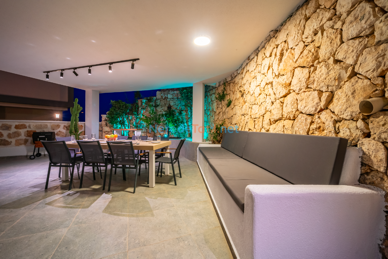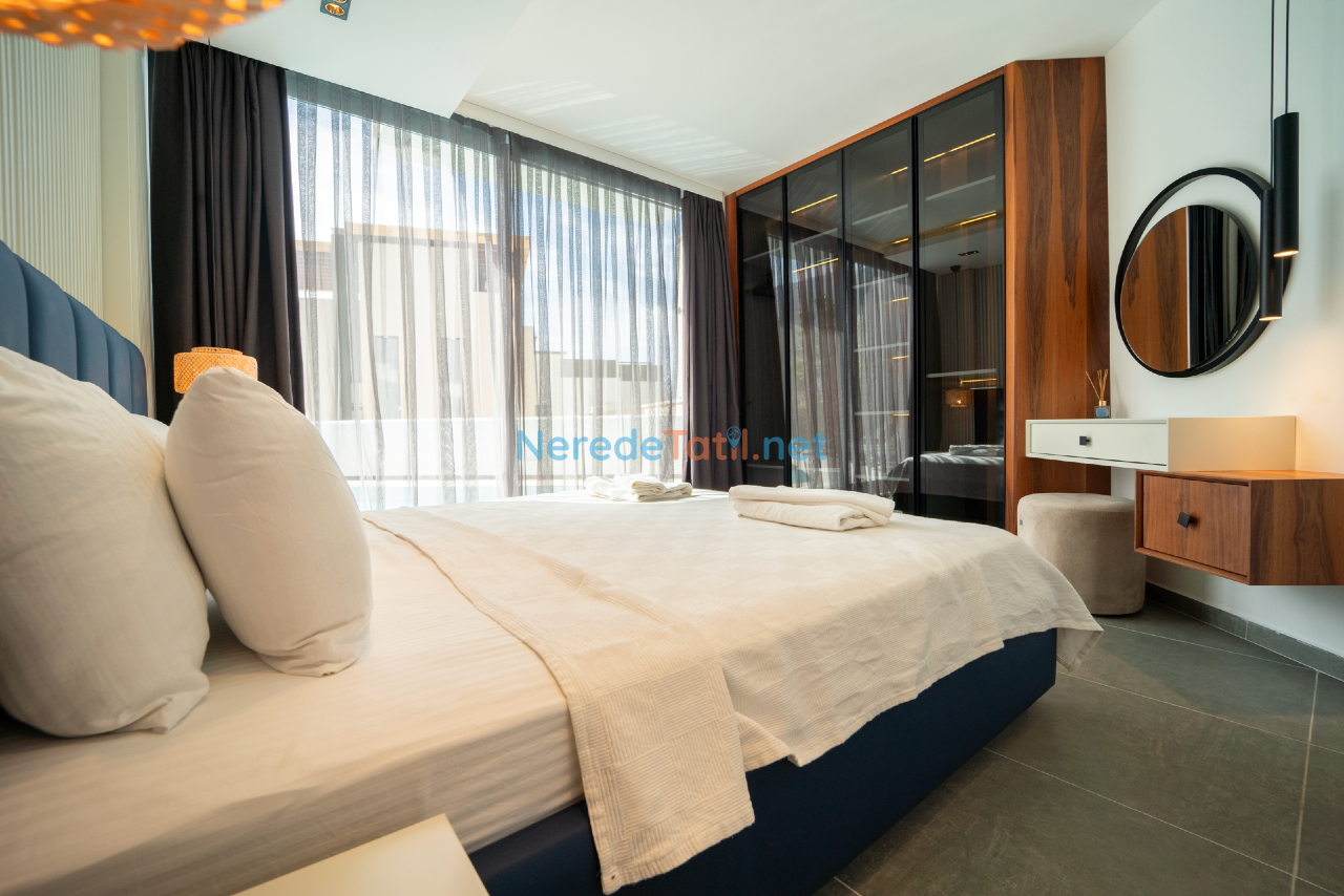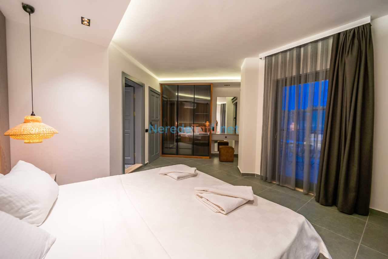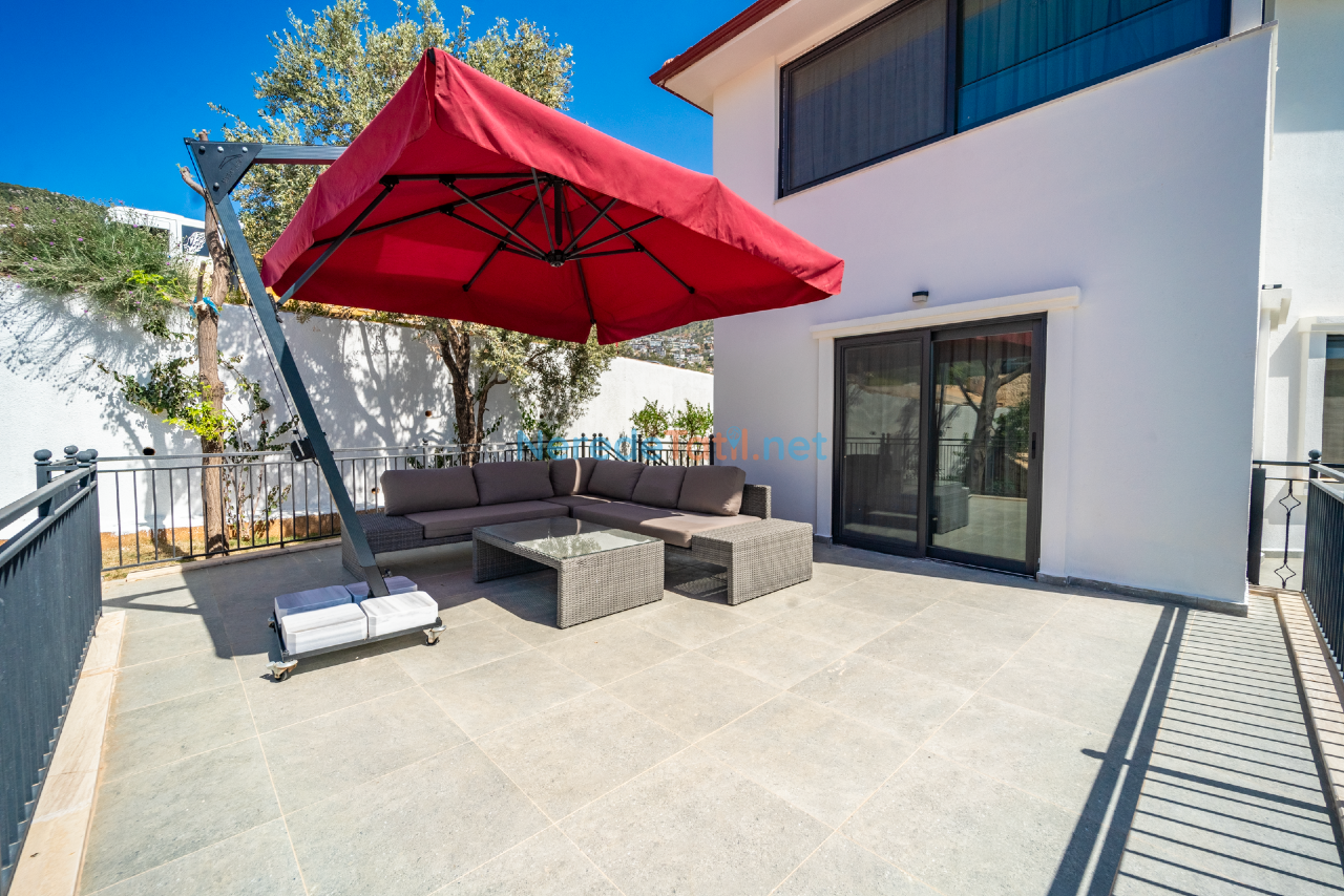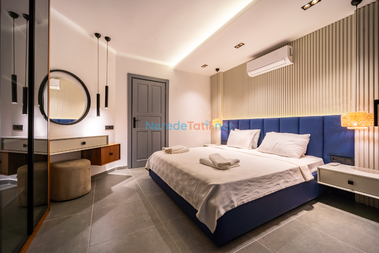 Kalkan'ın eşsiz doğasında konumlanmış bu lüks villa, konfor ve rahatlığı bir arada sunmaktadır. Toplamda 9 kişilik kapasitesi olan villa, dört yatak odası ve dört banyo ile misafirlerine geniş ve ferah bir konaklama imkanı sunar. Her odada bulunan çift kişilik yataklar ve ek bir tek kişilik yatak, tüm konuklar için rahat bir uyku deneyimi sağlar.
