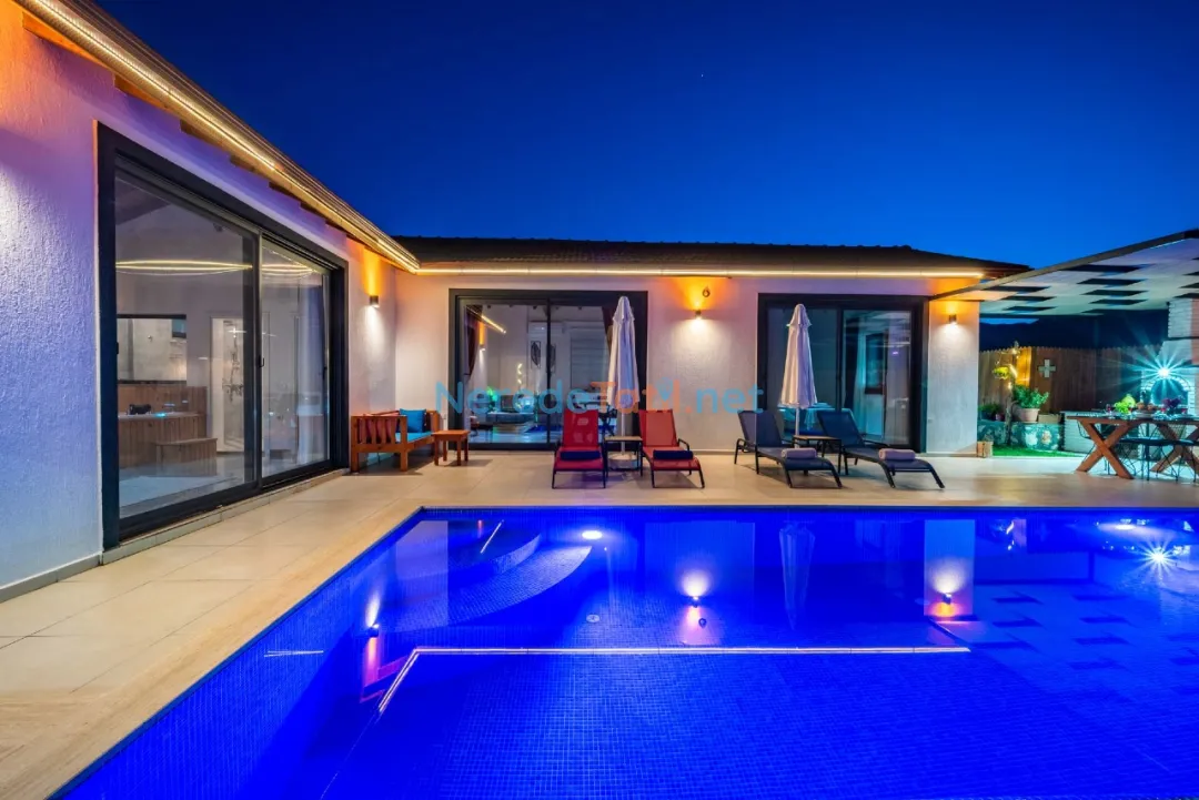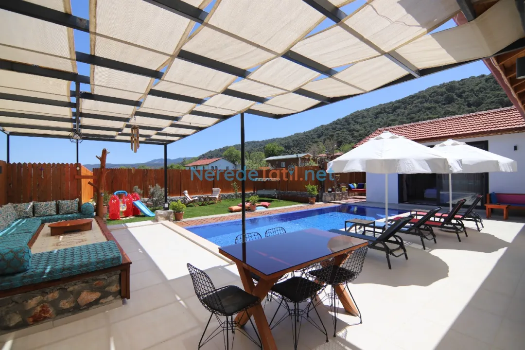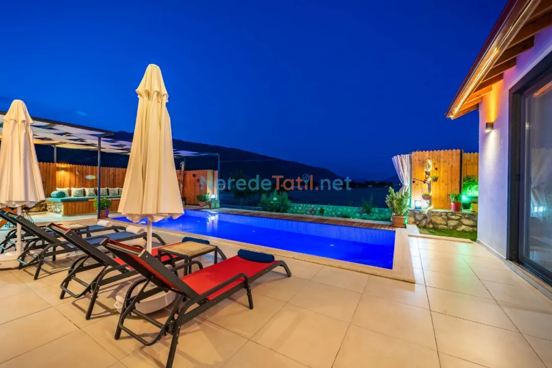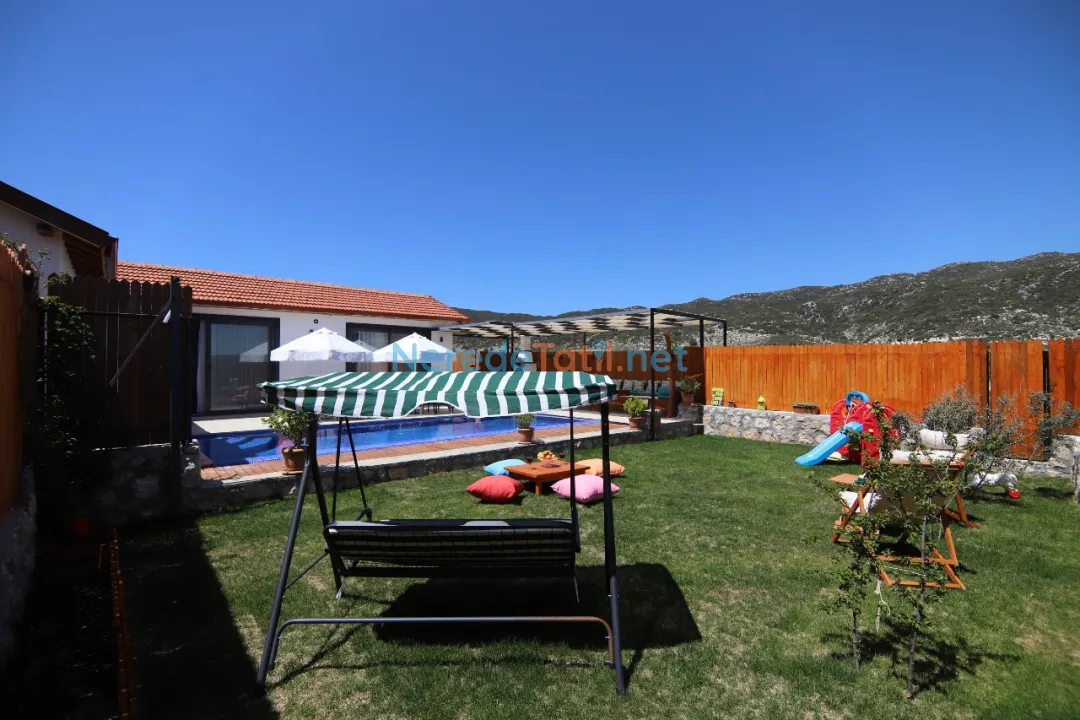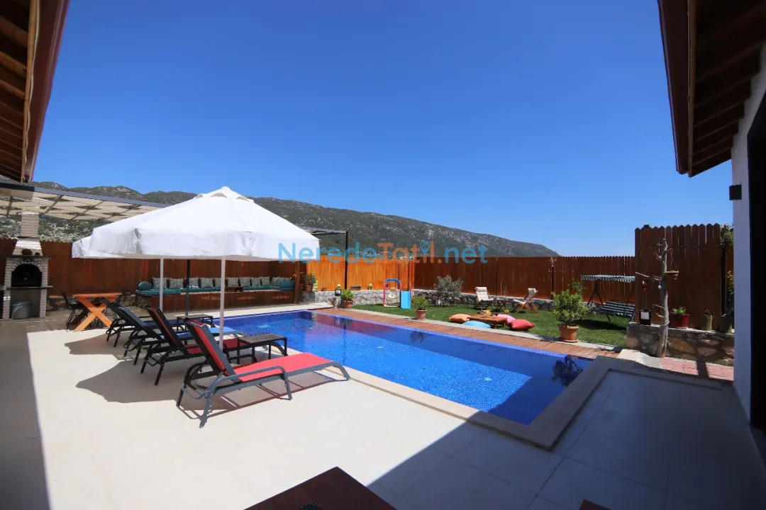 Konuklar, genişliği 4 metre ve uzunluğu 8 metre olan, derinliği ise 1.55 metre olan özel yüzme havuzunun keyfini çıkarabilir. Havuz, dışarıdan tamamen korunaklı olup, mahremiyet arayan misafirler için idealdir. Villanın bahçesinde BBQ - Mangal alanı ve çocuklar için oyun alanı bulunmaktadır.