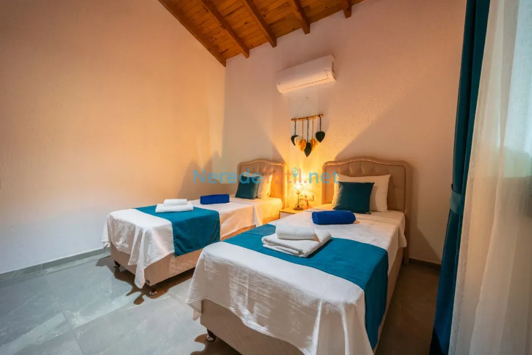 Sarıbelen'de yer alan bu villa, özel havuz ve doğa manzarası sunarak huzurlu bir tatil kaçamağı arayanlar için ideal bir seçenek sunuyor. Villada iki yatak odası ve iki banyo bulunmakta olup, toplamda dört kişilik konaklama kapasitesine sahiptir. Ebeveyn odasında çift kişilik yatak ve diğer odada iki tek kişilik yatak yer almaktadır.