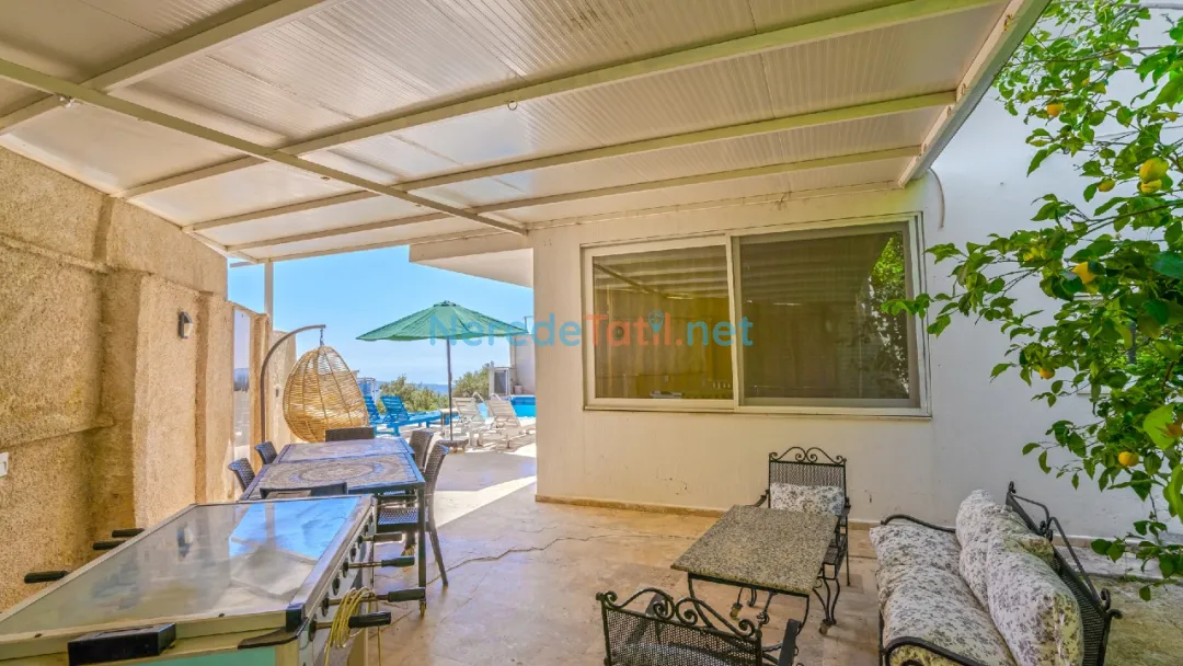 Deniz manzarası ile huzur bulacağınız bu villada, jakuzi sayesinde tatilinizin keyfini çıkarabilirsiniz. Ayrıca, mangal yapma imkanı sunan BBQ alanı, langırt ve oyun alanı gibi eğlenceli aktivitelerle tatilinizi renklendirebilirsiniz.