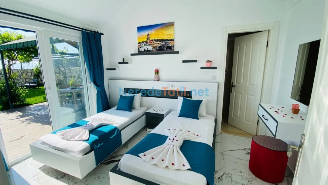 Üzümlü'nün eşsiz doğasında yer alan bu lüks villa, 4 kişilik kapasitesi ile huzurlu bir tatil fırsatı sunuyor. Villada toplamda iki yatak odası ve konforlu bir şekilde döşenmiş iki banyo bulunuyor. Çift kişilik yatak ve tek kişilik yatak seçenekleri sayesinde farklı ihtiyaçlara uygun konaklama imkanı sağlanıyor.