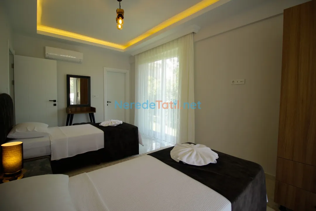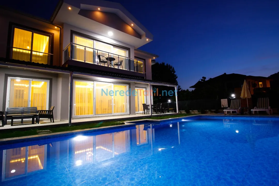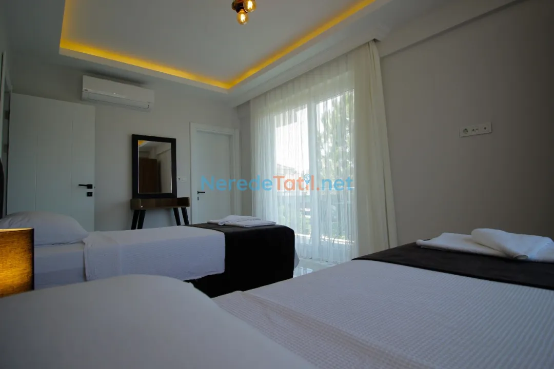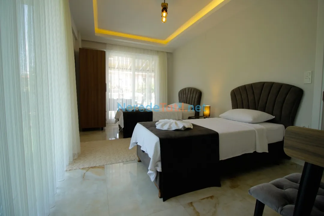 Dalyan'ın eşsiz doğasında yer alan villamız, lüks ve konforu bir arada sunuyor. Villa, 4 yatak odası ve 4 banyosu ile toplamda 8 kişilik konaklama kapasitesine sahiptir. Ayrıca, iki adet çift kişilik ve dört adet tek kişilik yatak mevcuttur, bu da konuklarımıza rahat bir uyku deneyimi sunar. Küçük misafirlerimiz için bir bebek yatağı da bulunmaktadır.
