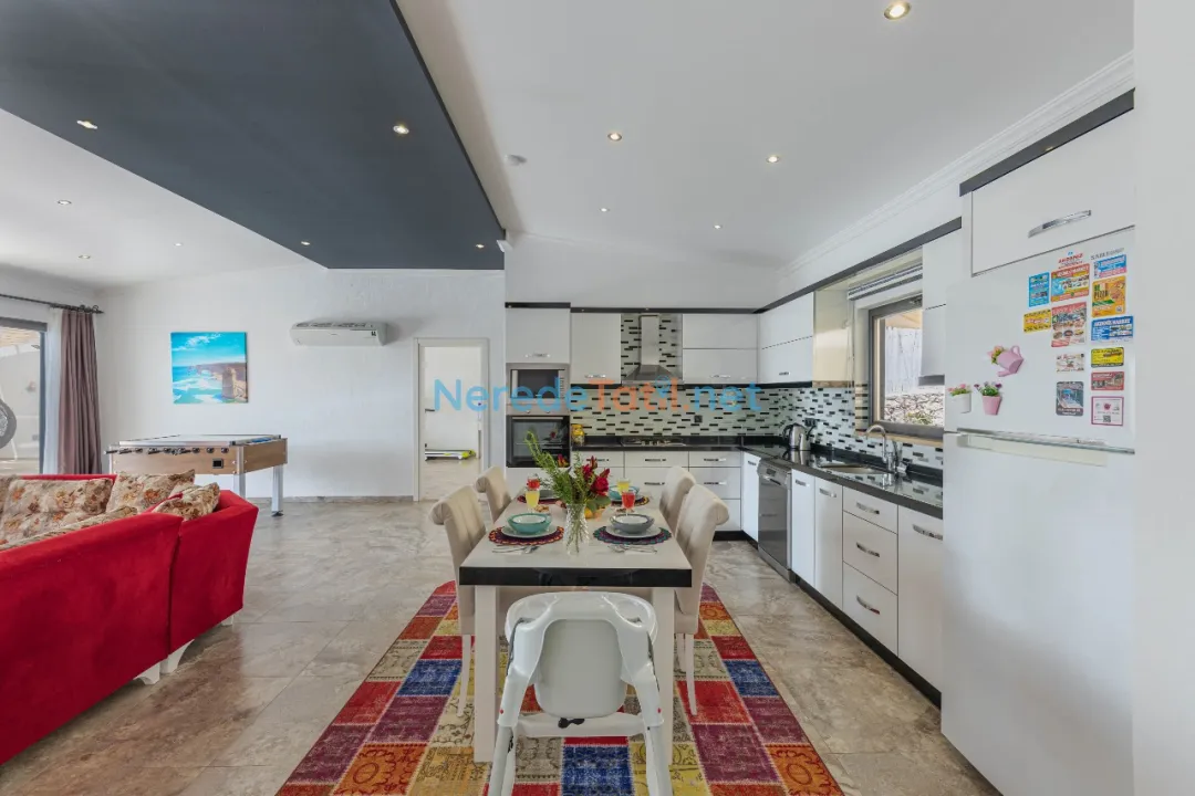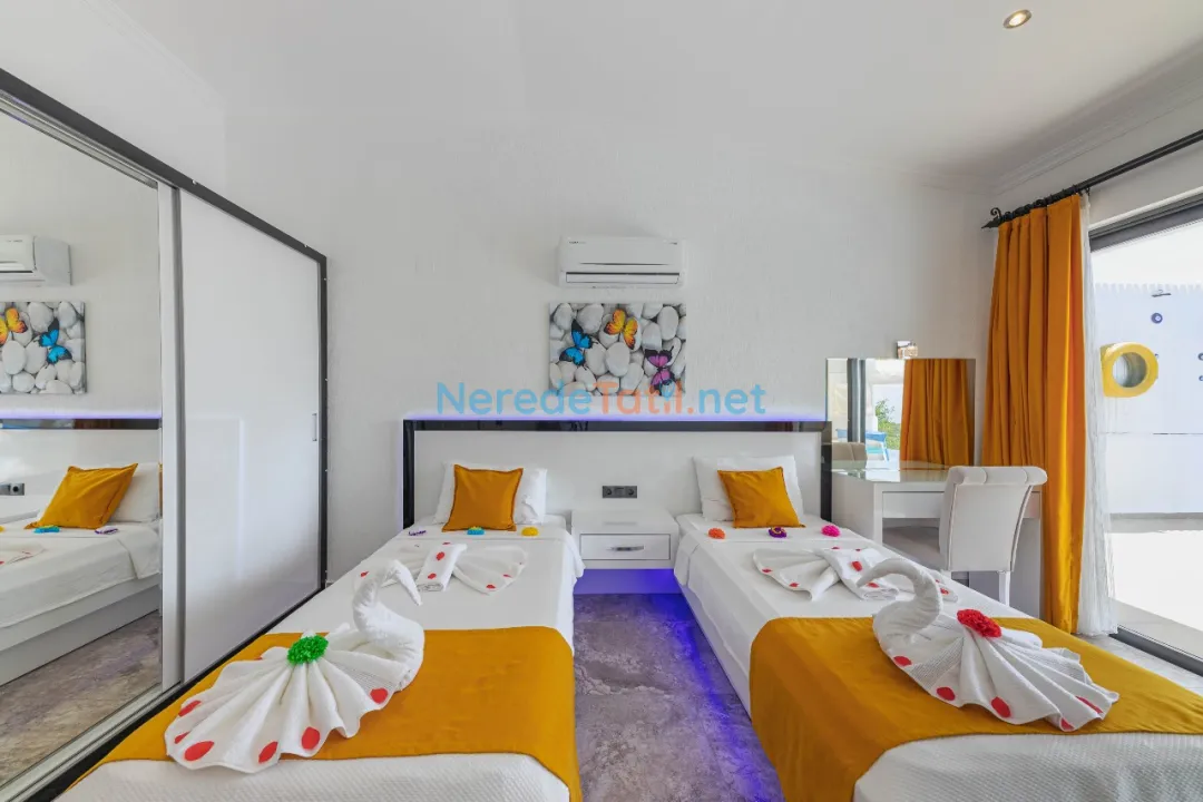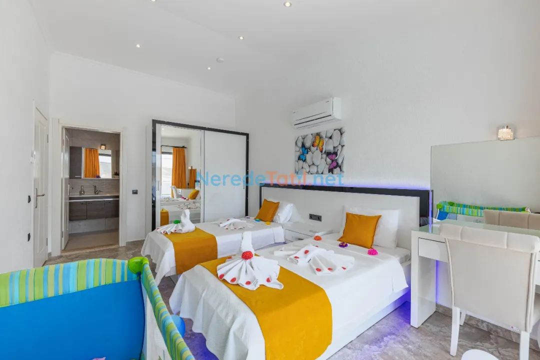 Bu villa, çiftler ve aileler için idealdir ve toplamda 2 yatak odasında 4 kişiye kadar konaklama imkanı sunar. Bir çift kişilik yatak ve iki tek kişilik yatak, konforlu bir uyku deneyimi sunarken, bebekli aileler için de bebek yatağı mevcuttur. Villanın iki banyosu, tüm konukların rahatça kullanabileceği şekilde düzenlenmiştir.