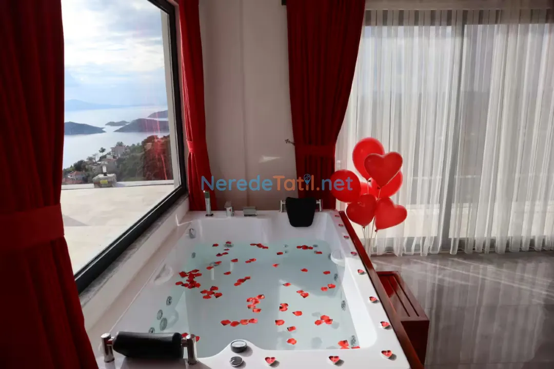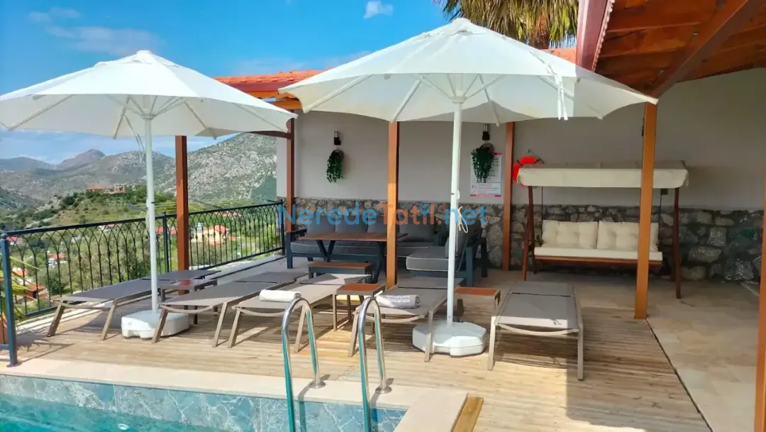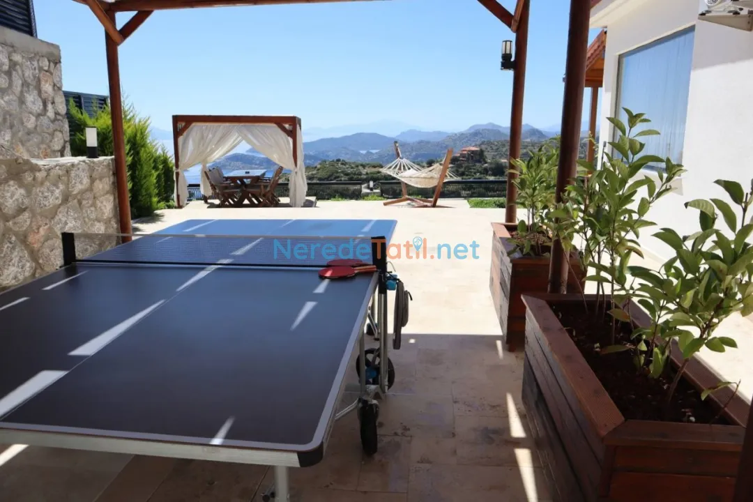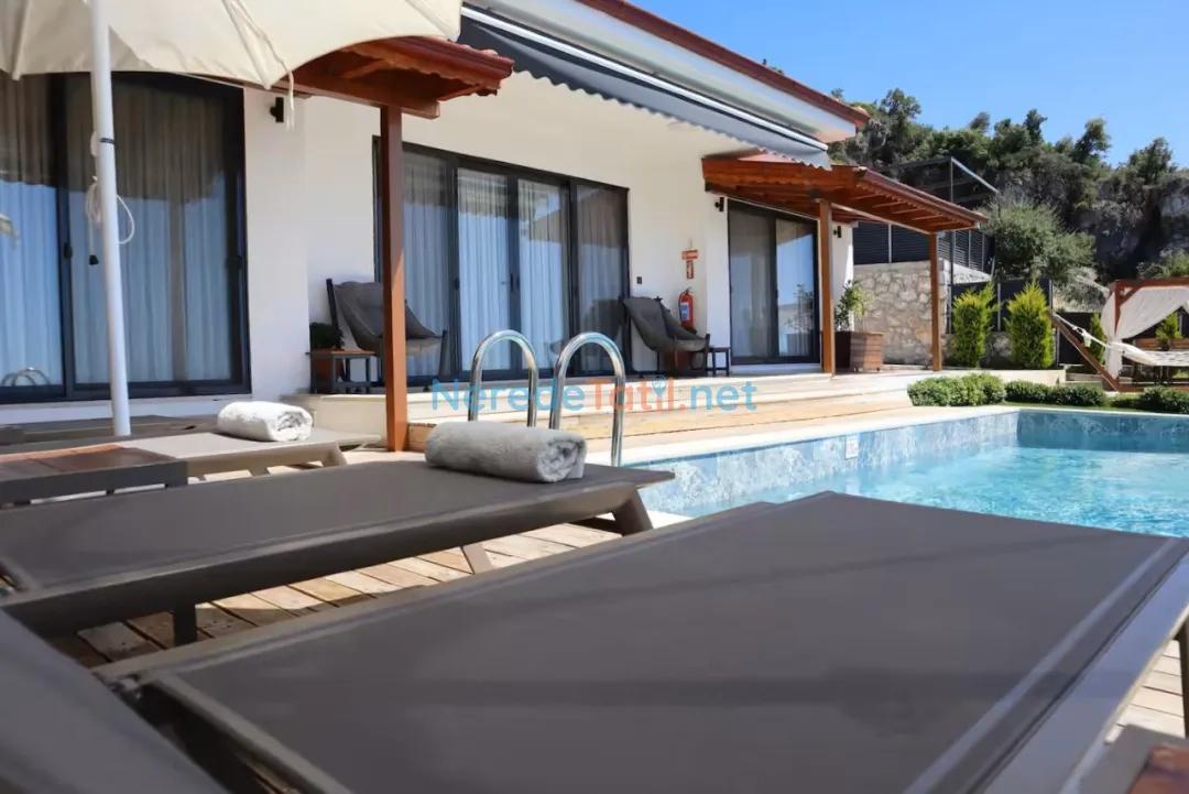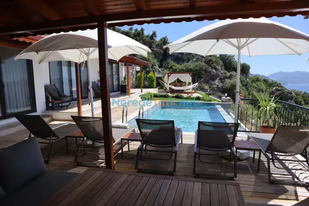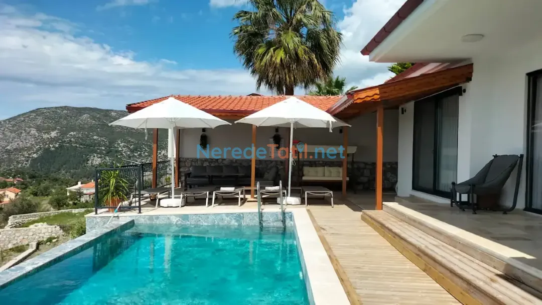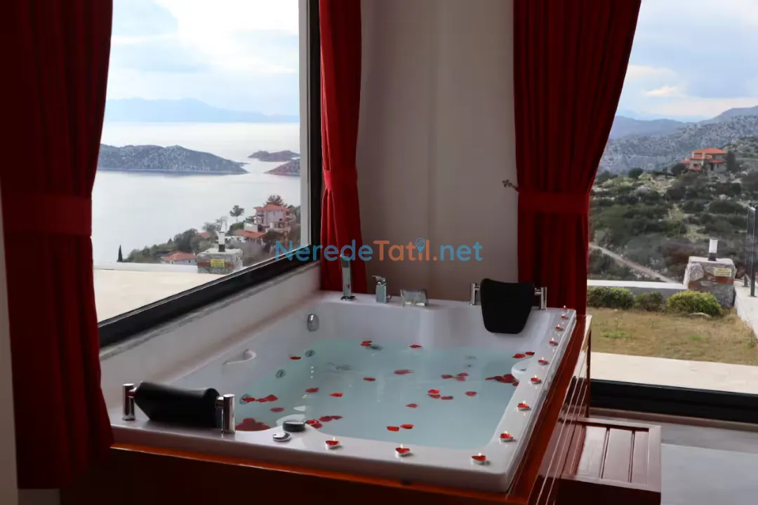 Söğüt'ün eşsiz doğasında konumlanmış bu lüks villa, deniz manzarasıyla huzur dolu bir tatil geçirmeniz için ideal. Villa, özel havuzu ve korunaklı yapısıyla mahremiyetinize önem veriyor. Havuzun boyutları 3.5 metre genişliğinde, 8 metre uzunluğunda ve 1.5 metre derinliğindedir. Jakuzi keyfi ile rahatlayabilir, masa tenisi oynayarak eğlenceli vakit geçirebilirsiniz.