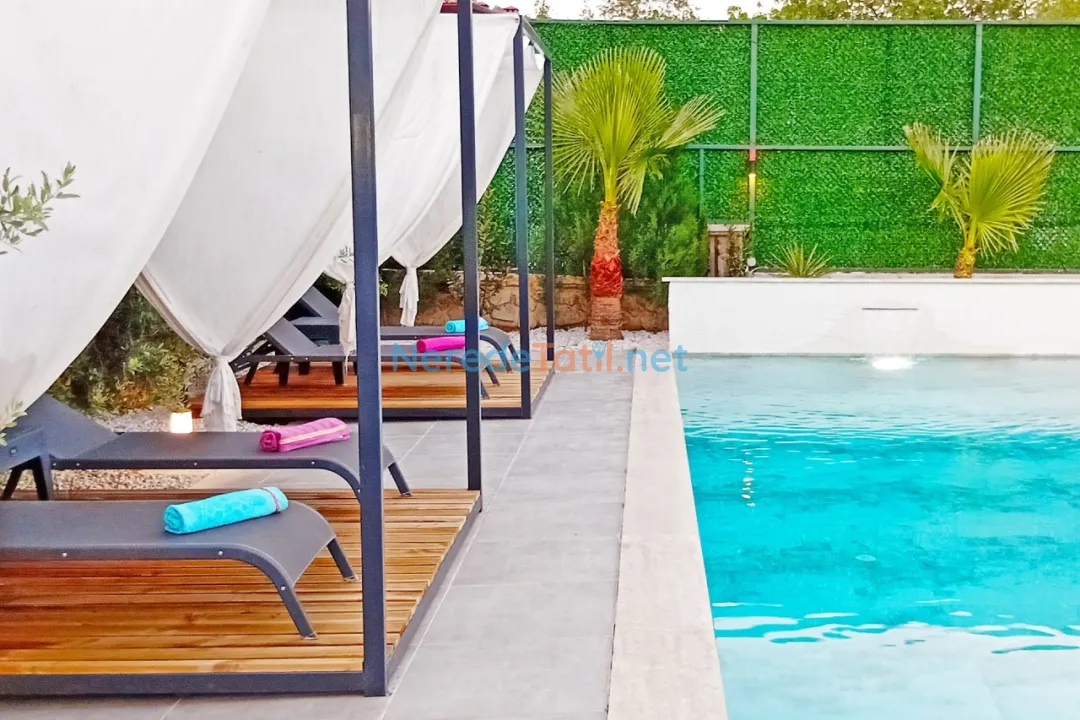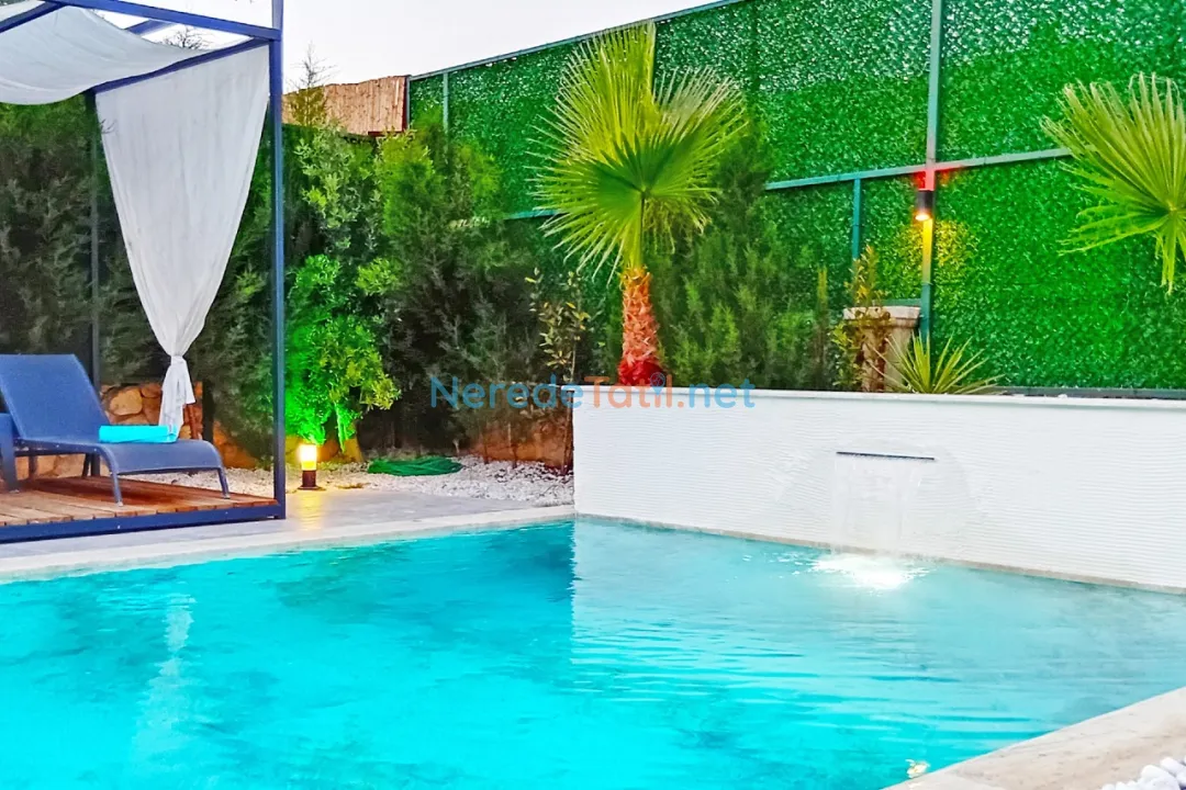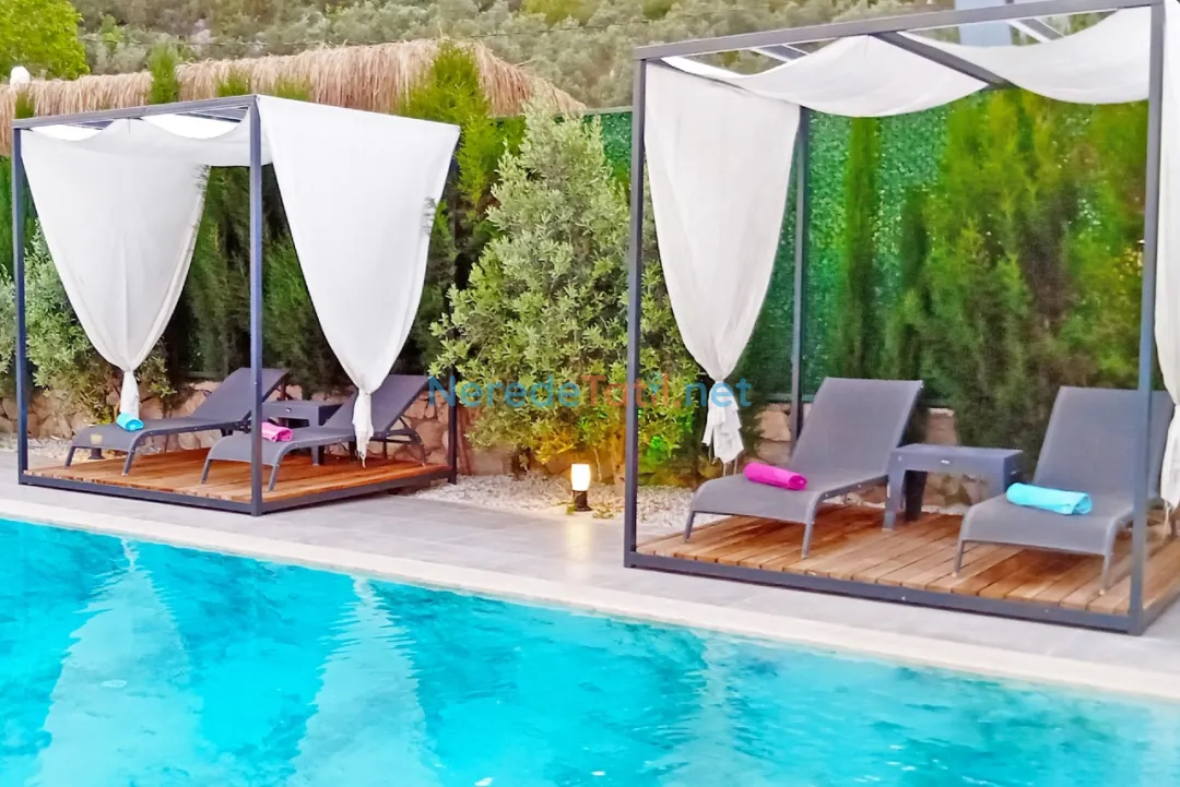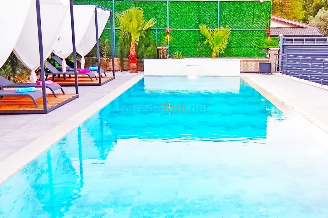 Villanın en dikkat çekici özelliklerinden biri özel yüzme havuzudur. Havuz, 4 metre genişliğinde, 14 metre uzunluğunda ve 1.6 metre derinliğindedir. Havuzun korunaklı yapısı, misafirlerin gözlerden uzak bir şekilde serinlemesine olanak tanır. Çocuk havuzu bulunmamakla birlikte, geniş bahçesi ve doğa manzarası ile aileler için huzurlu bir ortam sağlar.
