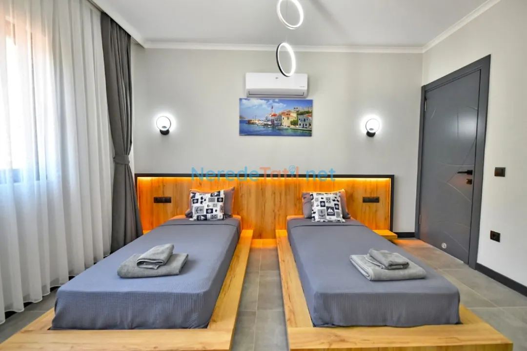 Kayaköy'ün büyüleyici doğasında yer alan bu villa, 8 kişilik konaklama kapasitesi ile tatilcilerine konforlu bir deneyim sunuyor. Villada 4 yatak odası ve 4 banyo bulunuyor. İki adet çift kişilik yatak ve dört adet tek kişilik yatak, konforlu bir uyku deneyimi için hazır durumda. Ayrıca bebekli aileler için 1 adet bebek yatağı da mevcut.