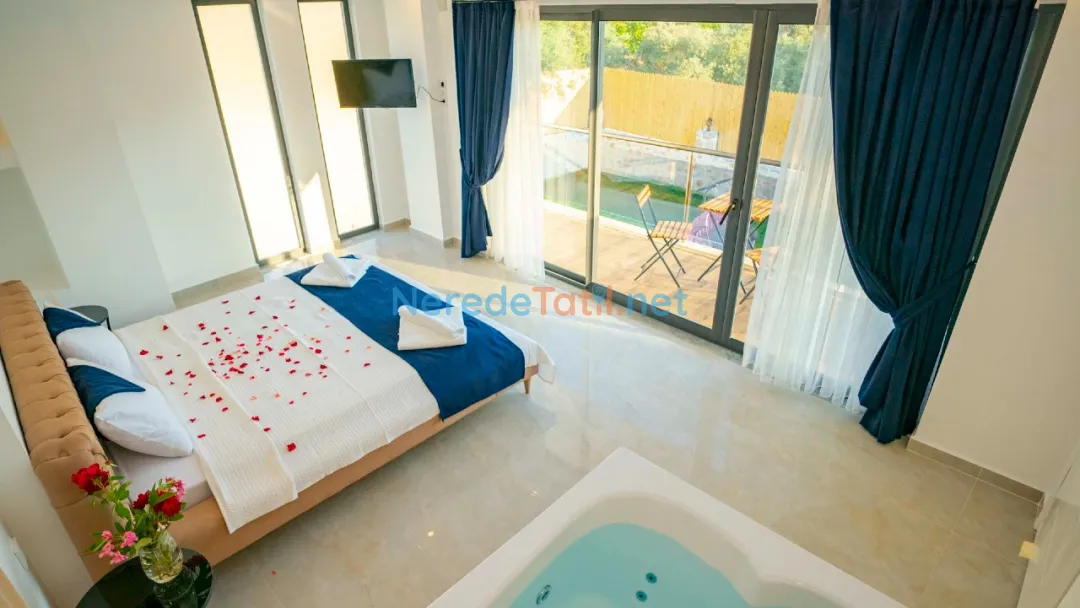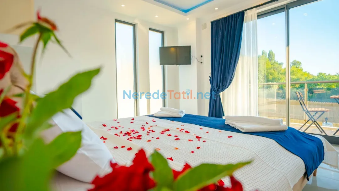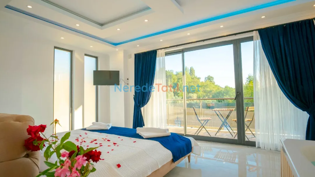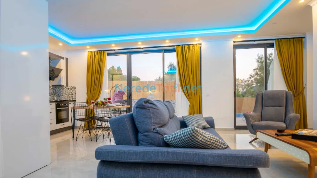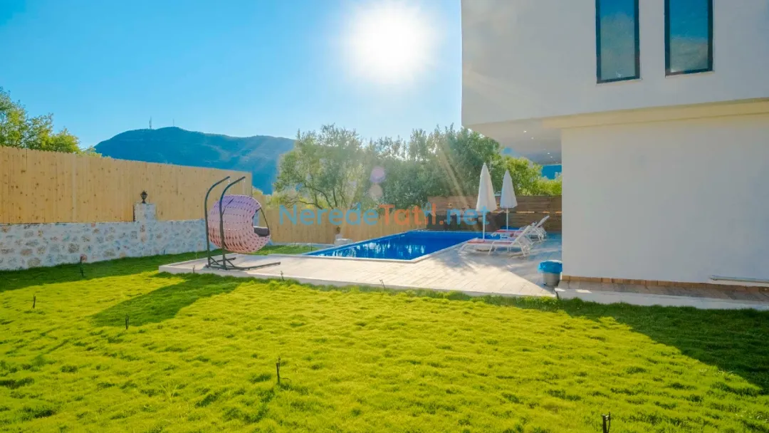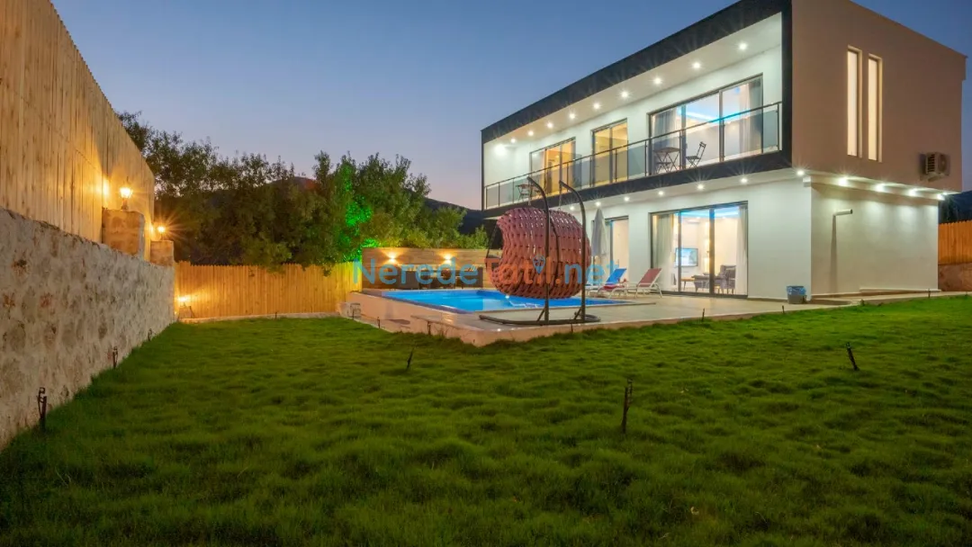 Sarıbelen'in huzur dolu atmosferinde yer alan bu villa, özel havuz ve bahçeli yapısıyla misafirlerine eşsiz bir konfor sunuyor. Isıtmalı havuz özelliği sayesinde dört mevsim tatil yapma imkanı sağlayan bu villa, balayı çiftleri için de özel bir tercih olabilir.
