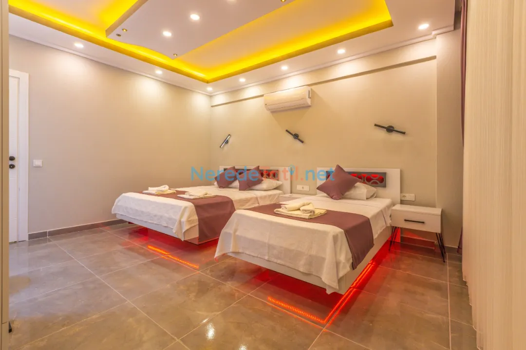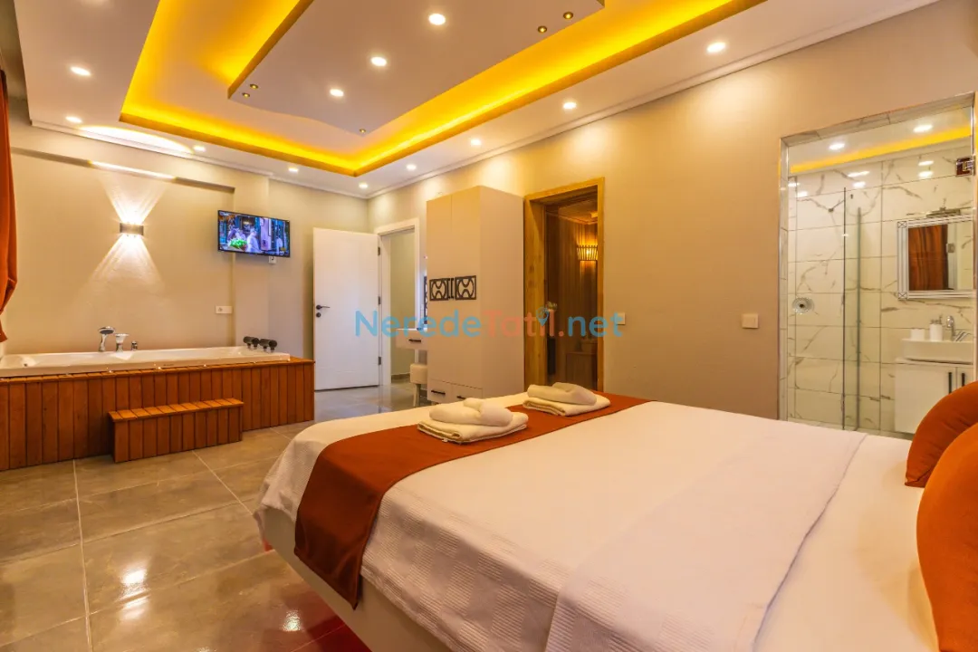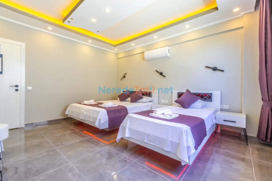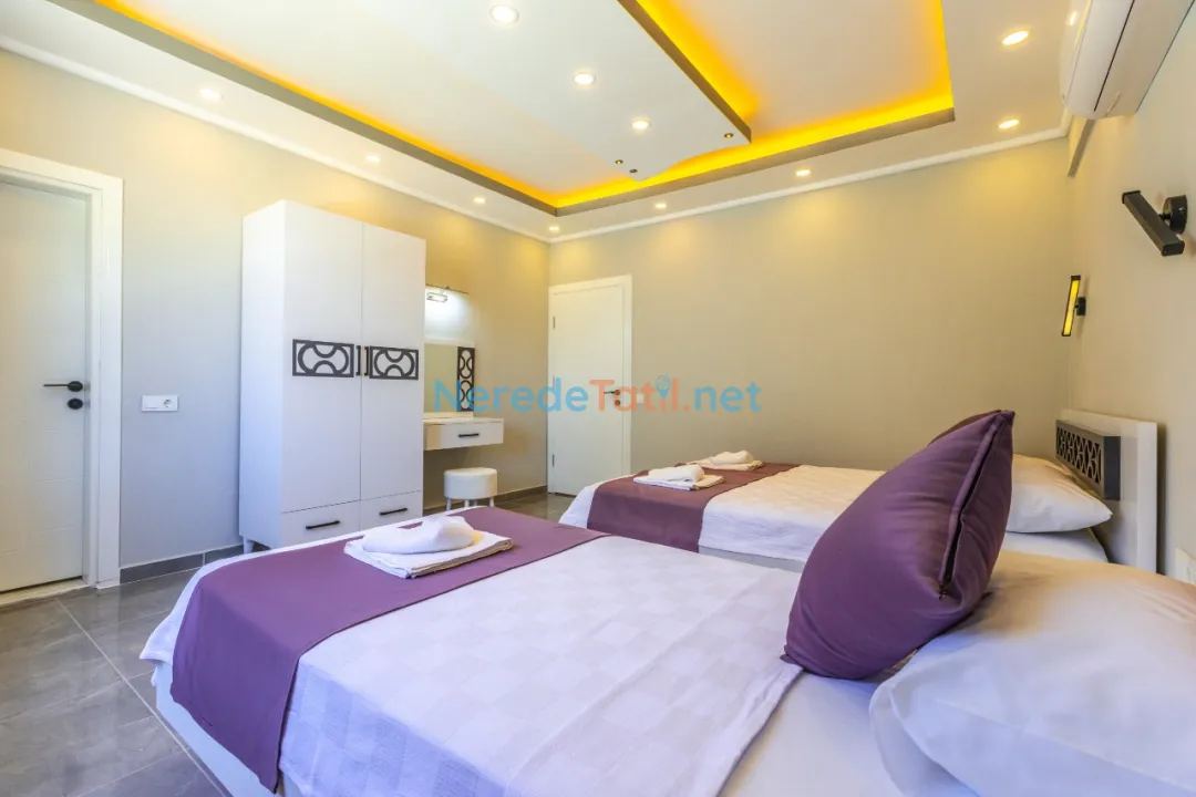Villada iki yatak odası ve iki banyo bulunmaktadır. Yatak odalarında bir adet çift kişilik yatak ve üç adet tek kişilik yatak mevcuttur, toplamda 5 kişilik bir kapasite sunmaktadır. Tatilinizi rahatlatıcı hale getirmek için villada jakuzi, sauna, ütü ve saç kurutma makinesi gibi olanaklar da bulunmaktadır.