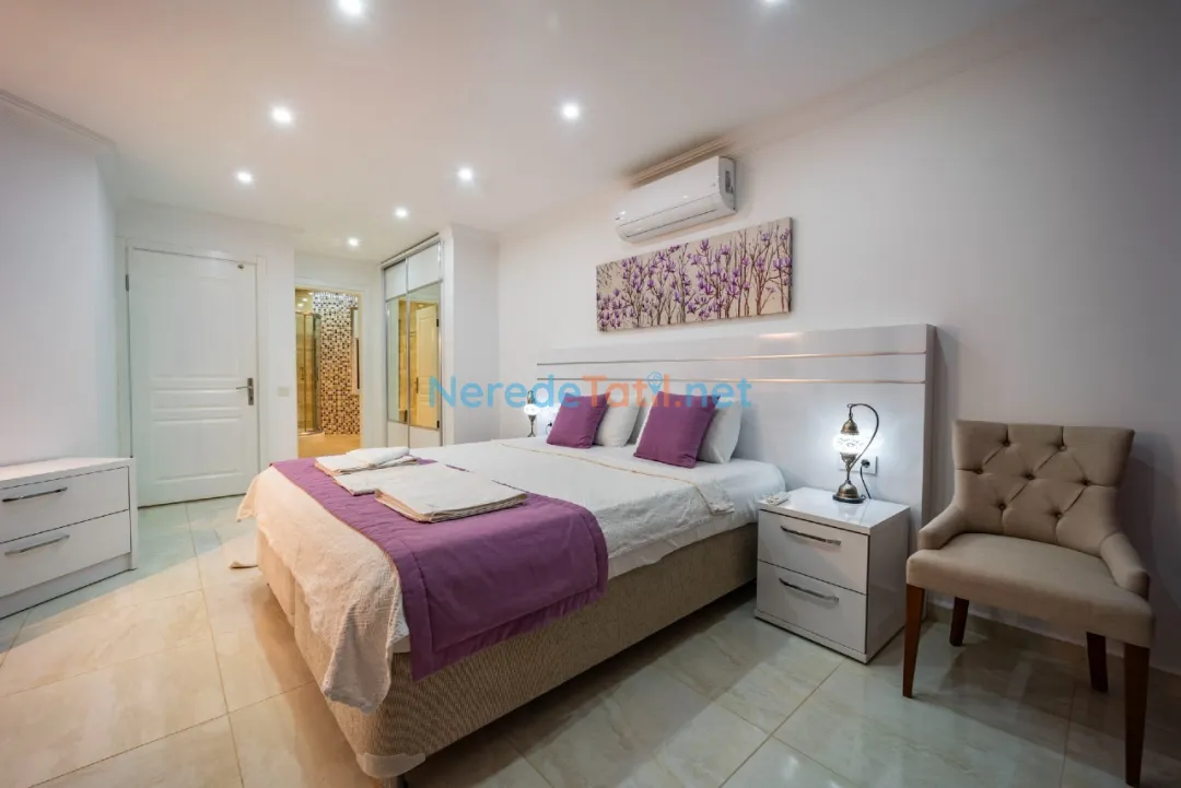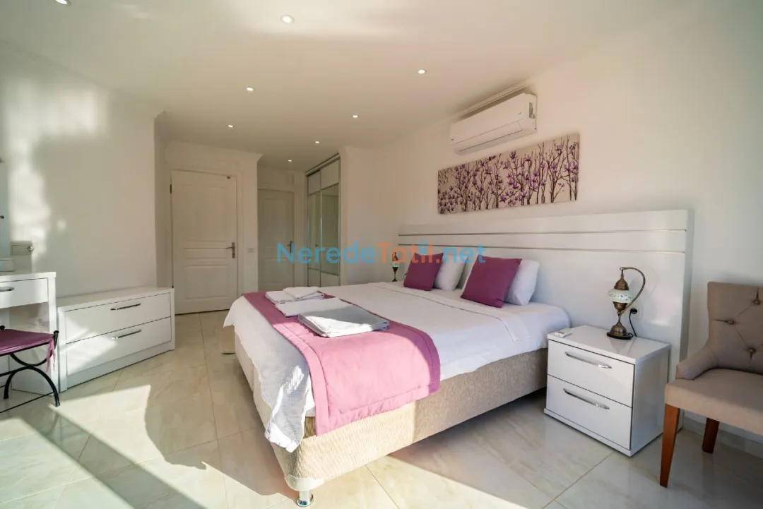 Toplamda 6 kişilik kapasiteye sahip bu villada, 3 adet çift kişilik yatak bulunduran 3 yatak odası mevcuttur. Her yatak odasına bağlı olarak konforlu bir 3 banyo bulunmaktadır, bu da her misafire rahat bir alan sunar.