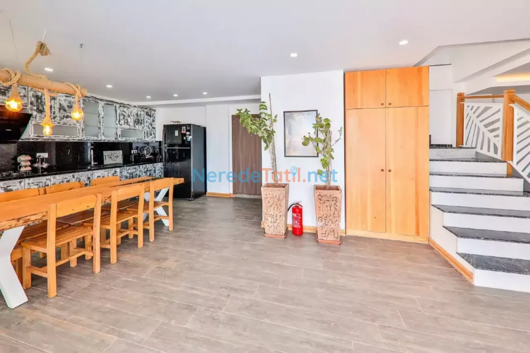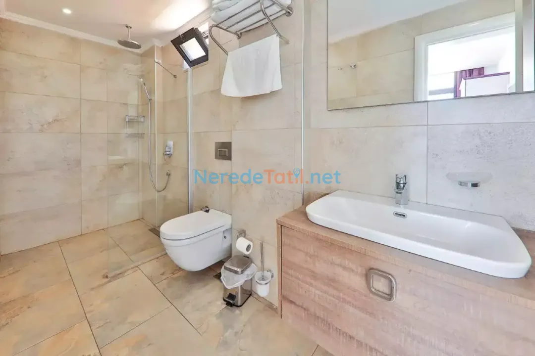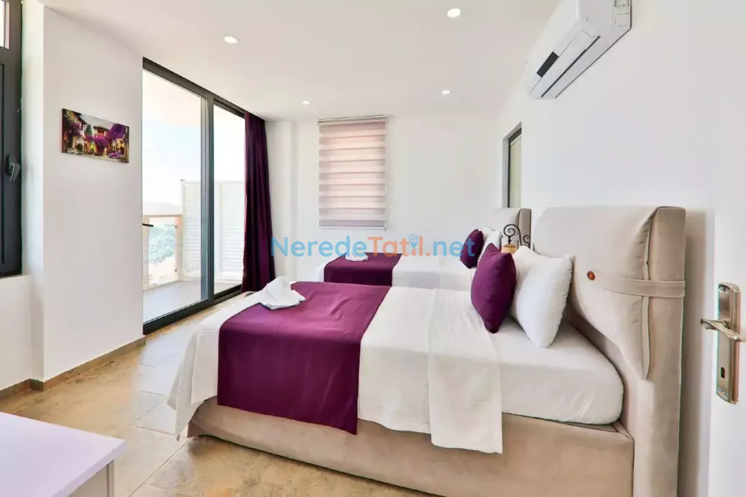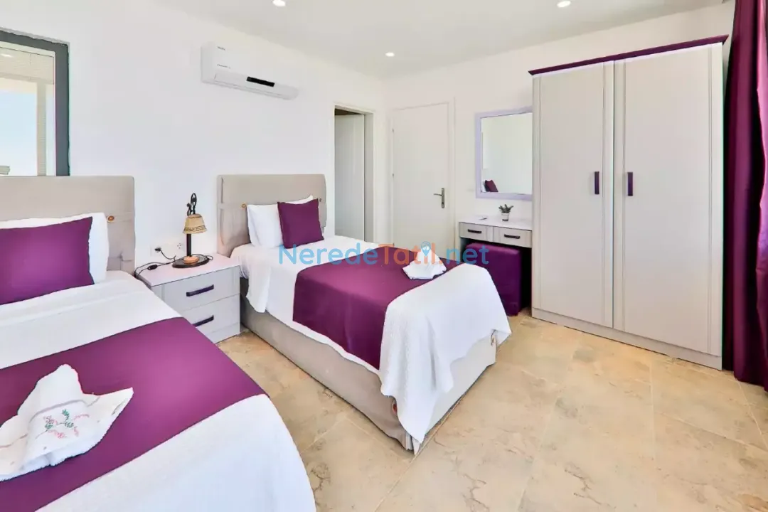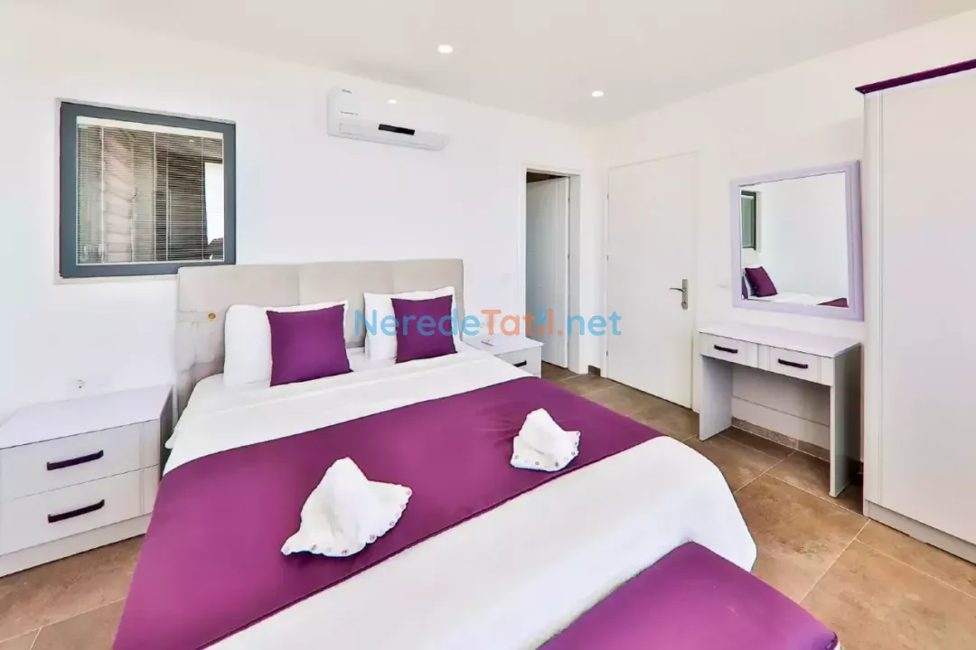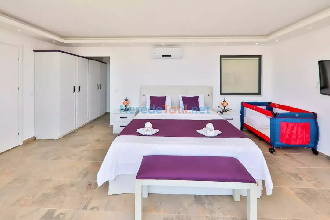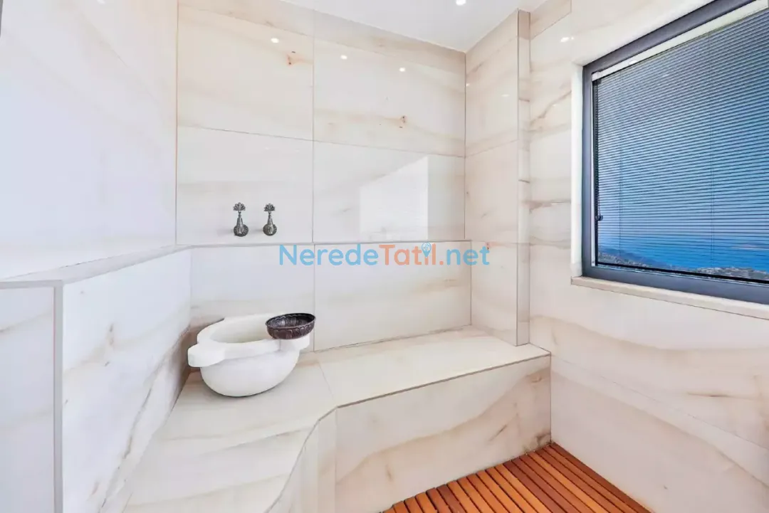 Villanın geniş kapasiteli, ferah iç mekanında 3 yatak odası ve 3 banyo bulunmaktadır. Çift kişilik iki yatak ve iki tek kişilik yatak, toplamda 6 kişilik kapasite sunar. Jakuzili banyo keyfi, tatilinize ekstra bir lüks katarken, Türk hamamı ise geleneksel bir rahatlama imkanı sağlar.