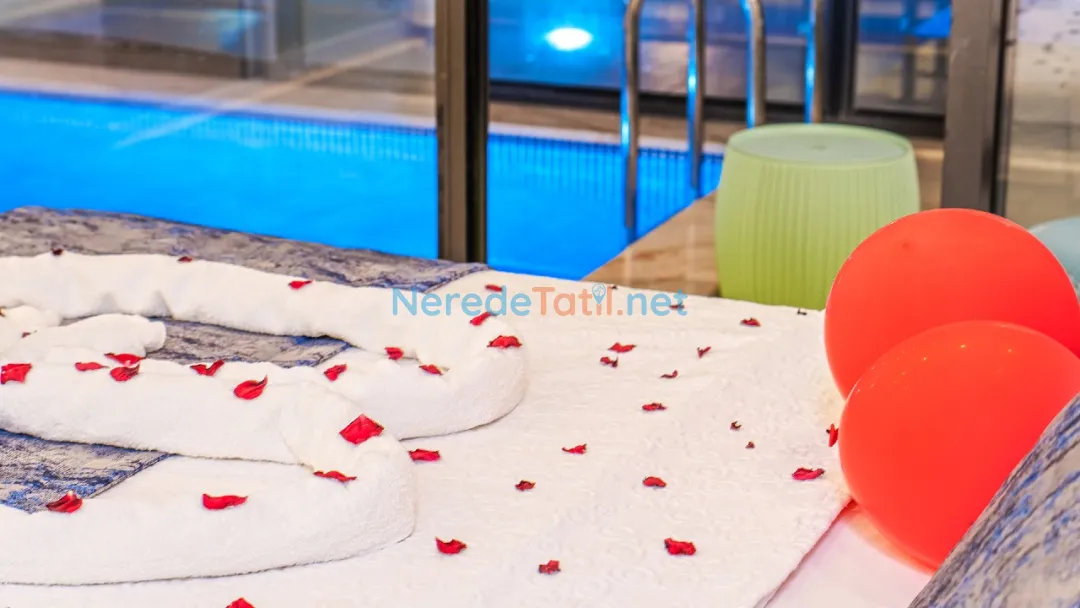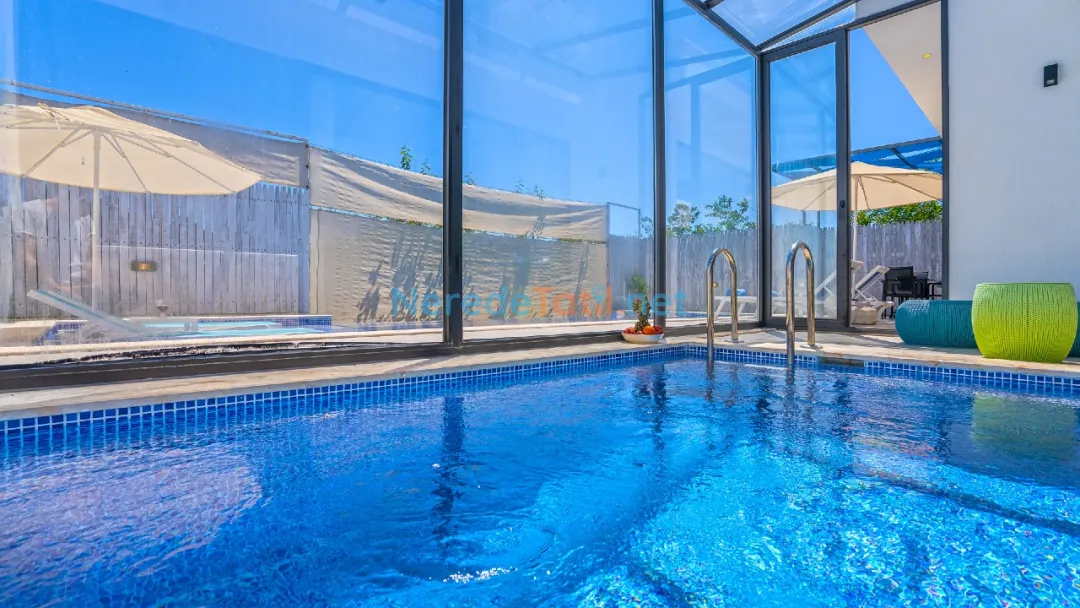 Soğuk havalarda da konforunuz düşünülerek tasarlanmış olan ısıtmalı kapalı havuz, keyifli anlar geçirmenizi sağlıyor. Kapalı havuz 4x4 metre boyutlarındadır ve sadece 60 cm derinliğe sahip olduğu için rahatça kullanılabilir.