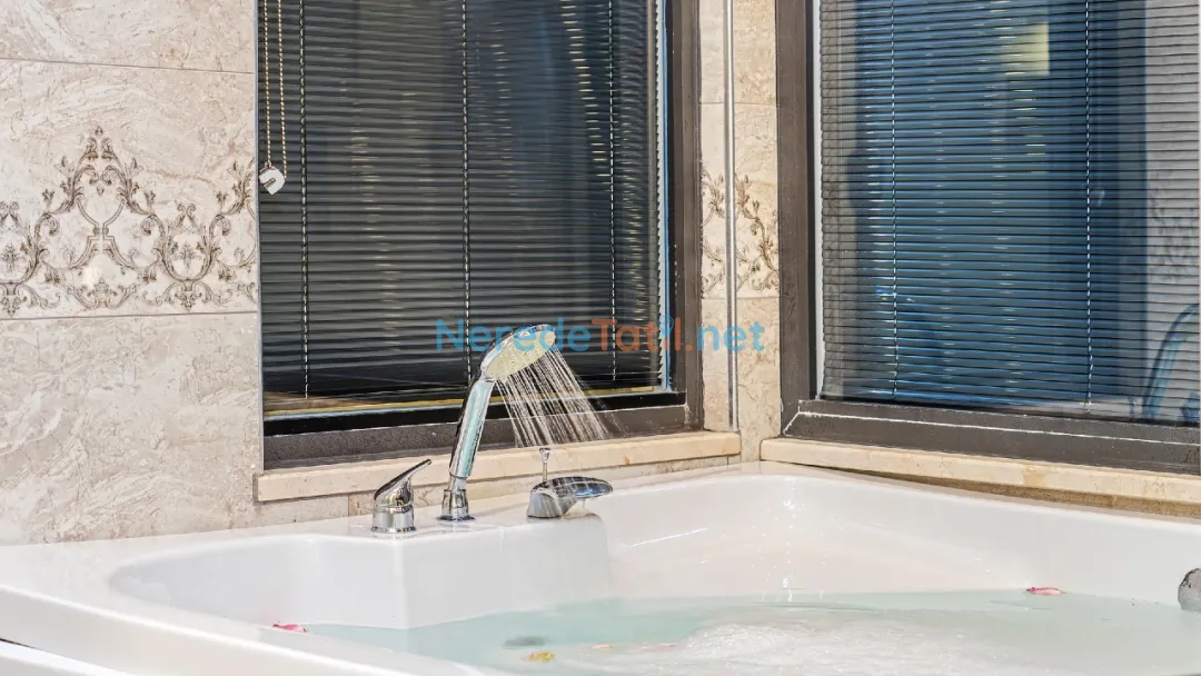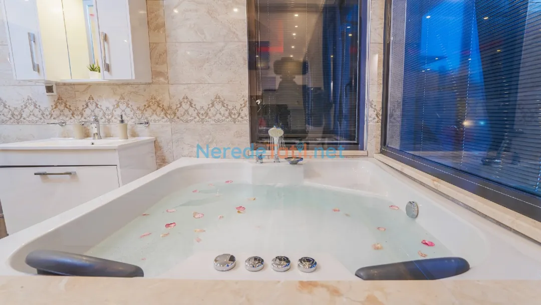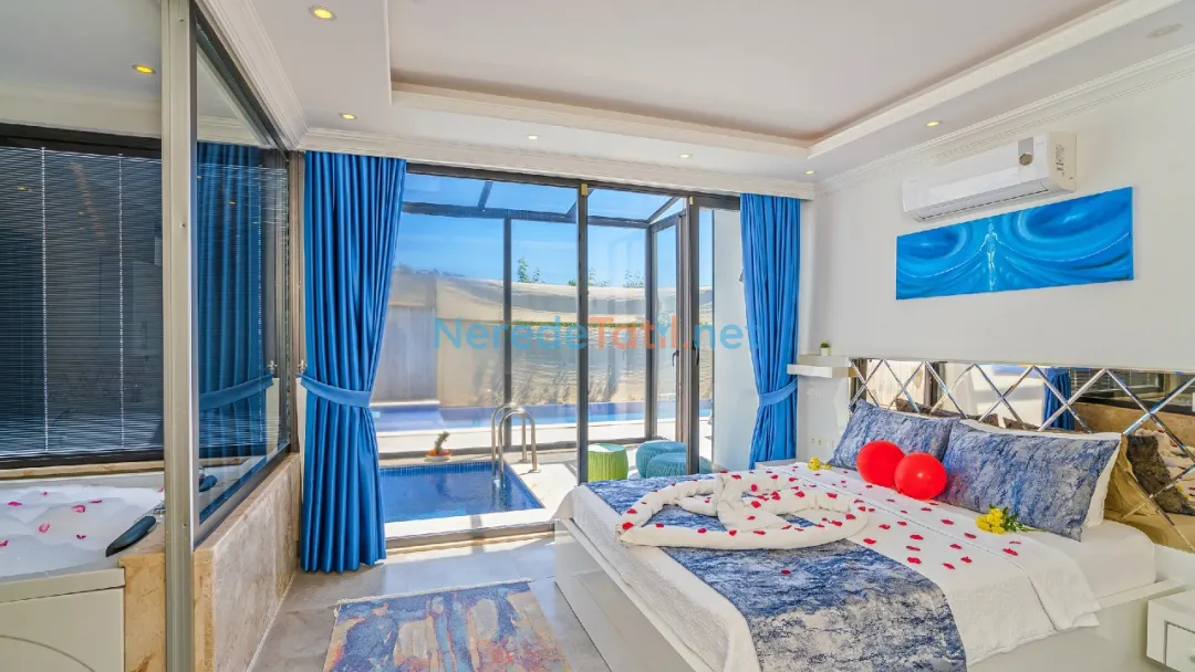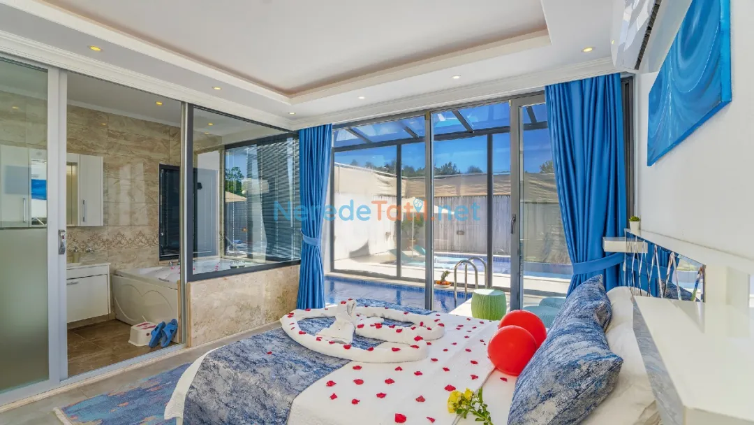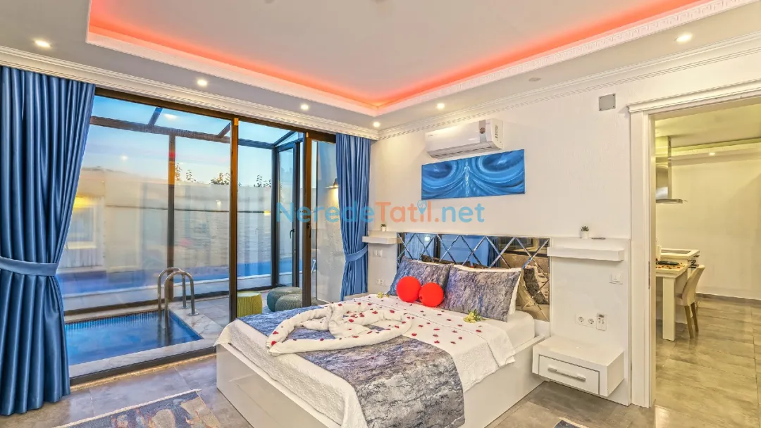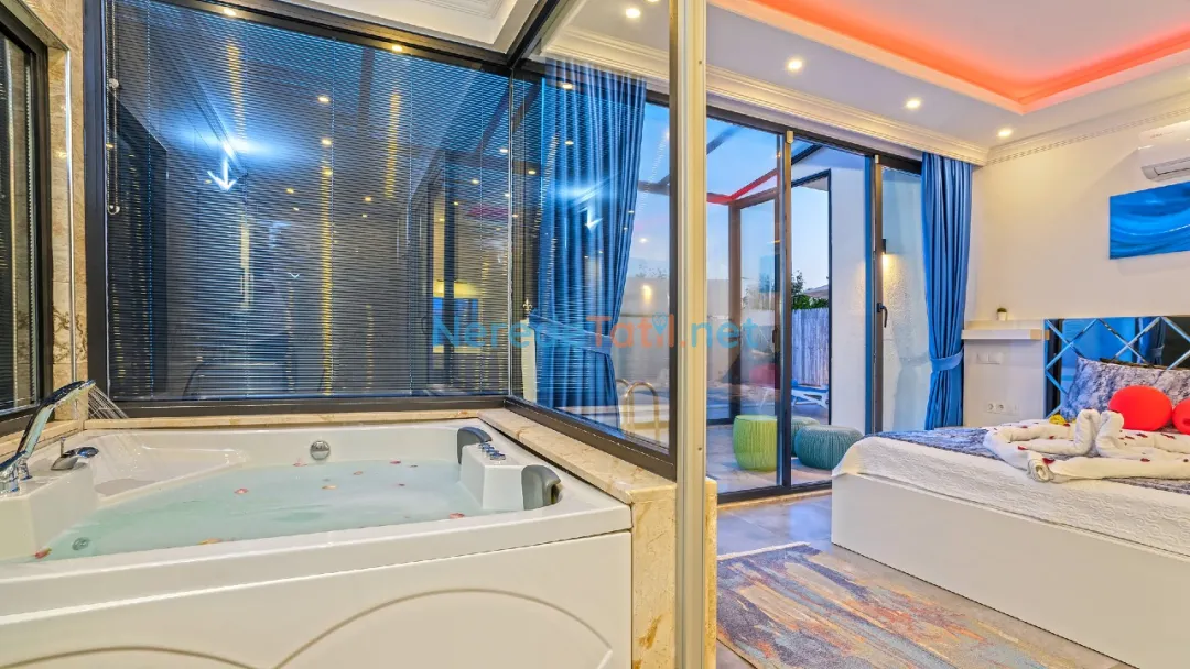Villanın iç kısmında jakuzi ve modern olanaklarla donatılmış bir yatak odası bulunmaktadır. 2 kişilik kapasitesiyle, rahat ve huzurlu bir konaklama deneyimi sunan bu villa, doğa manzaralı pencereleri ile günün her anında huzur vaat ediyor.