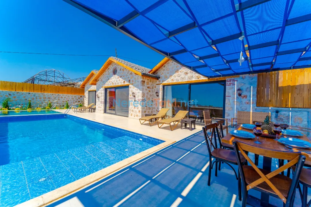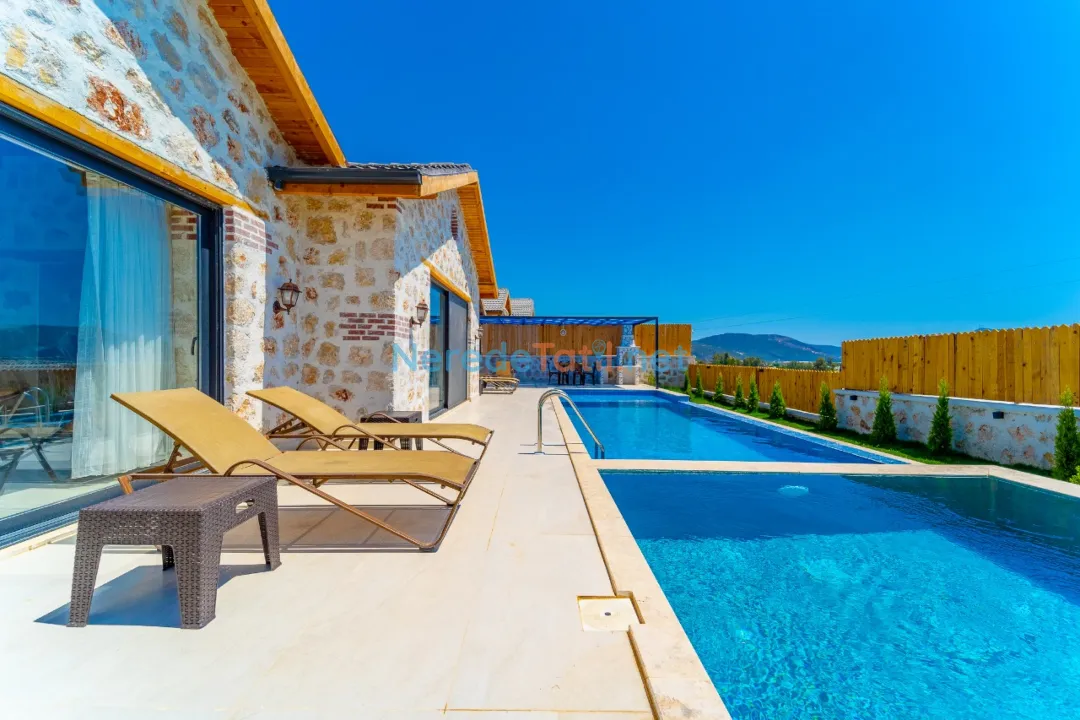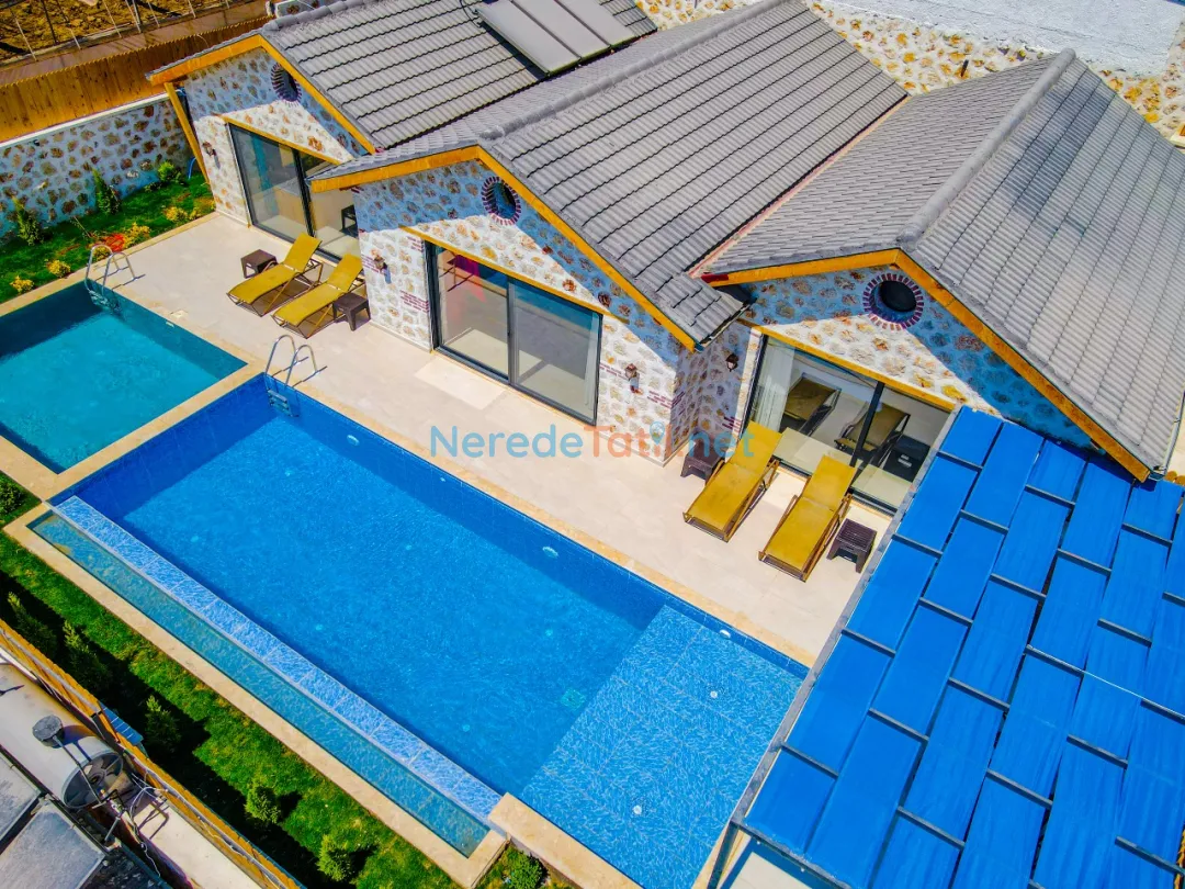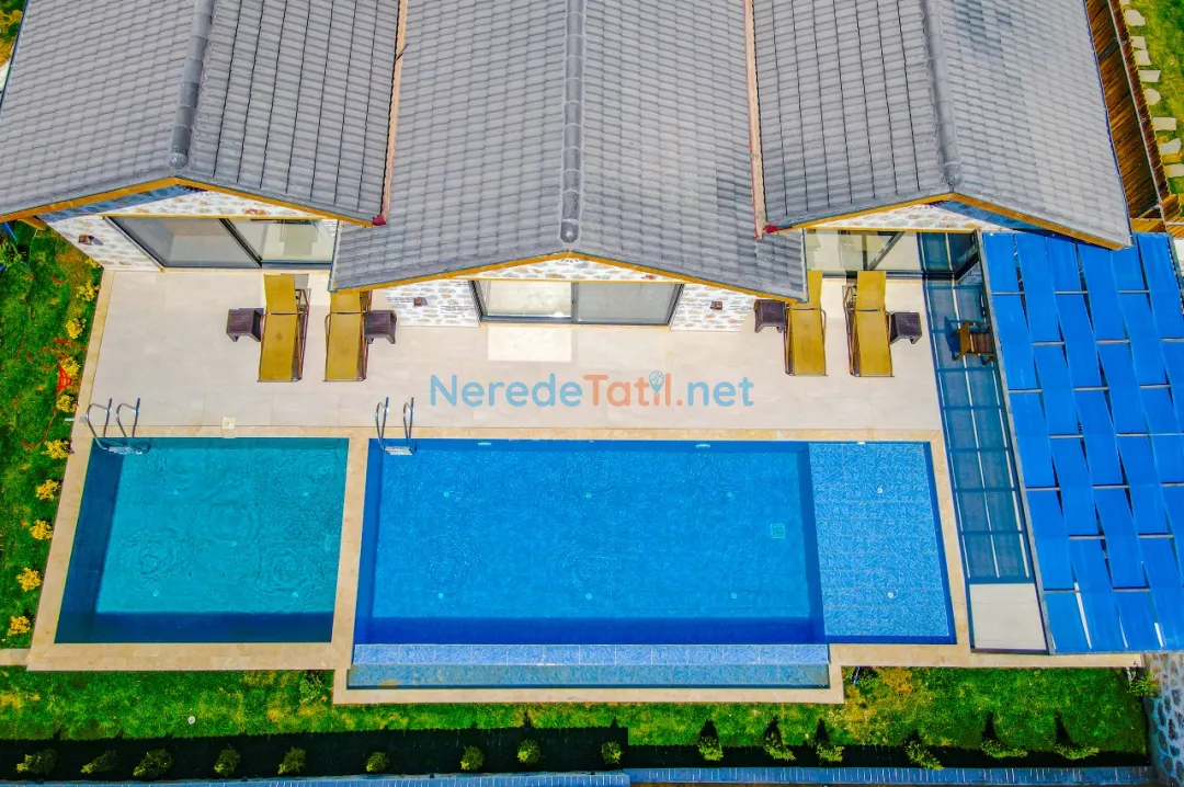 Villanın özel yüzme havuzu, 4x8 metre boyutları ve 1.5 metre derinliği ile tatil keyfinizi ikiye katlıyor. Havuz, korunaklı yapısı sayesinde gözlerden uzak, rahat bir yüzme deneyimi sunar. Havuz kenarında, doğanın sesleri eşliğinde güneşlenebilir veya BBQ - mangal keyfi yapabilirsiniz.