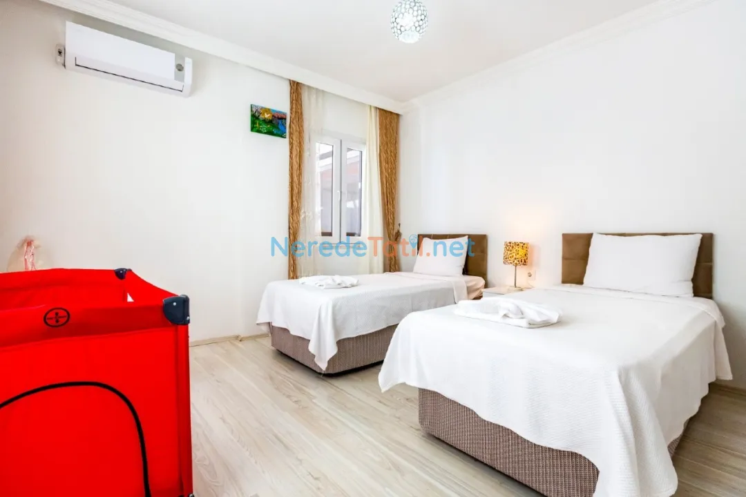 Kördere'nin büyüleyici doğasında yer alan bu lüks villa, sizlere huzur dolu bir tatil deneyimi sunuyor. Üç yatak odalı ve üç banyolu villa, toplamda 6 kişilik konaklama kapasitesine sahiptir. İki çift kişilik ve iki tek kişilik yatak ile rahat bir uyku deneyimi sağlanmaktadır. Ayrıca, bebekli misafirler için bir bebek yatağı da bulunmaktadır.