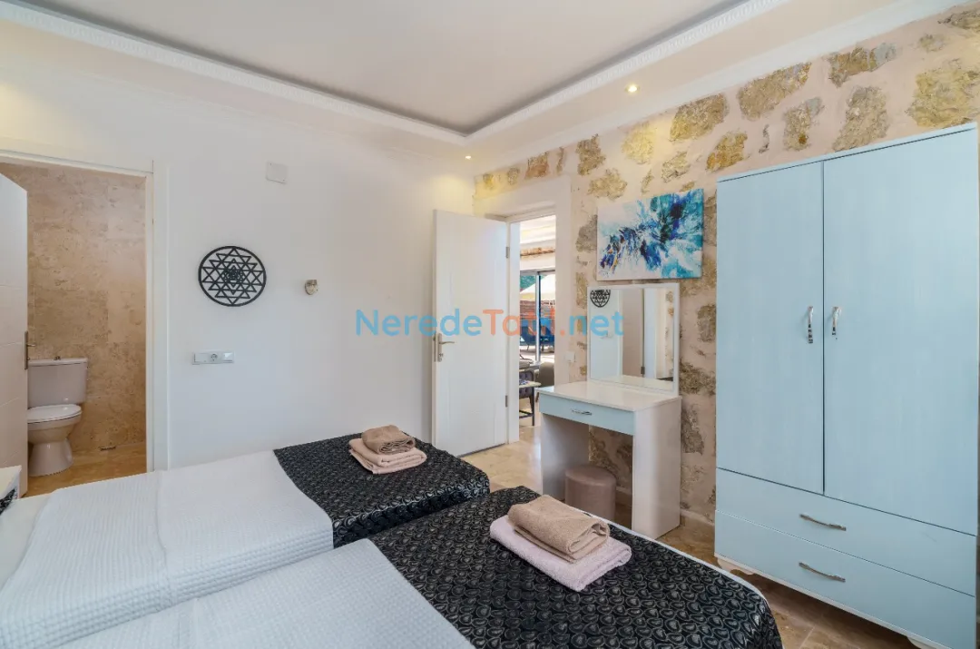 Villada bulunan özel havuz, sıcak yaz günlerinde serinleme imkanı sunarken, çevresindeki yemyeşil bahçe doğayla iç içe bir tatil deneyimi sağlar. Geniş ve rahat yatak odaları, tam donanımlı mutfak ve ferah oturma alanı sayesinde konforlu bir konaklama imkanı sunulmaktadır.