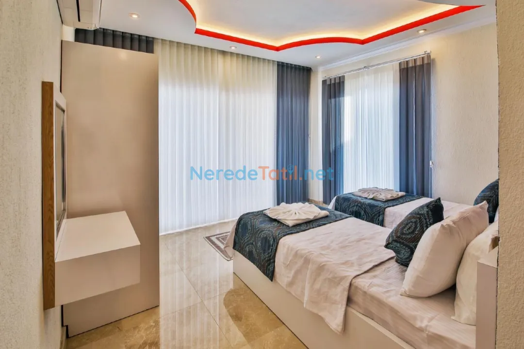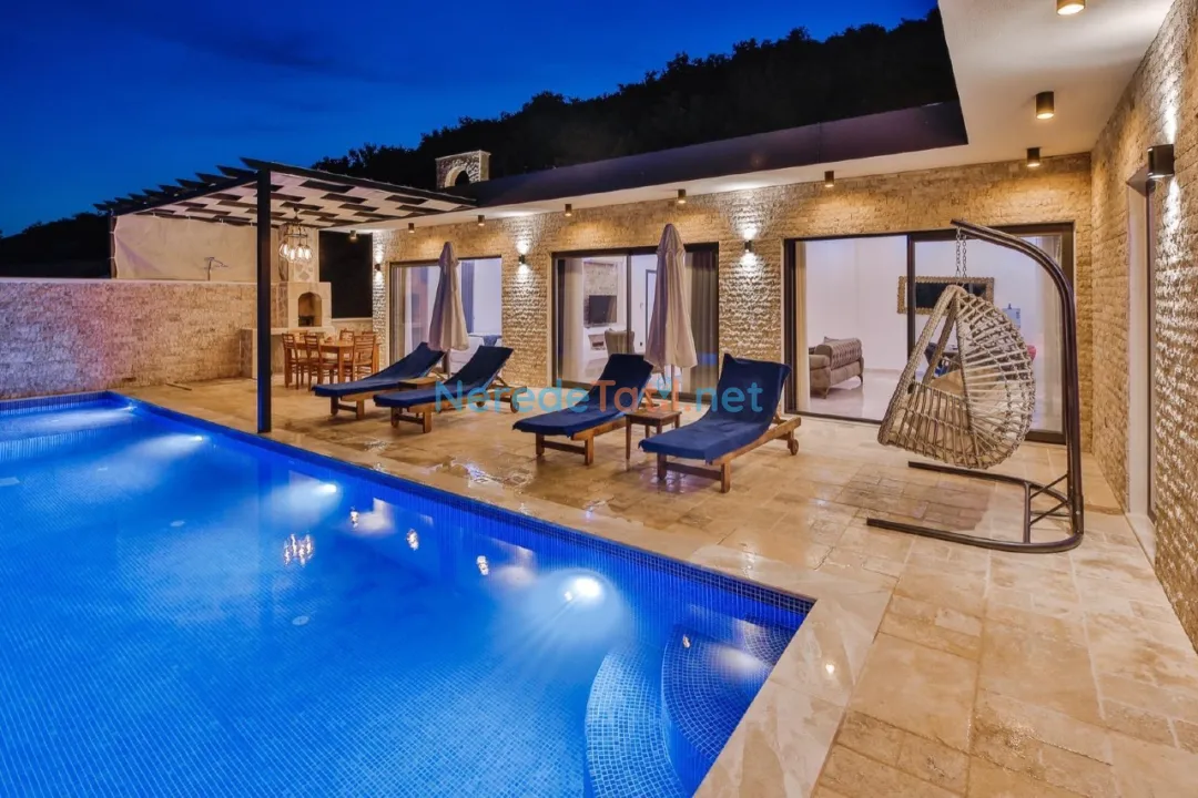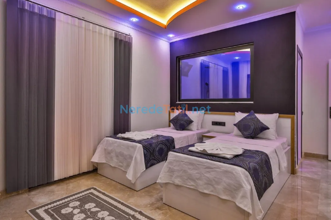 İslamlar köyünün eşsiz doğasında yer alan bu lüks villa, özel havuz ve deniz manzarası ile konuklarına unutulmaz bir tatil deneyimi sunuyor. Villada iki yatak odası ve iki banyo bulunmakta olup, 4 kişi kapasitelidir. Bir çift kişilik ve iki tek kişilik yatak ile konforlu bir konaklama sağlanmaktadır.