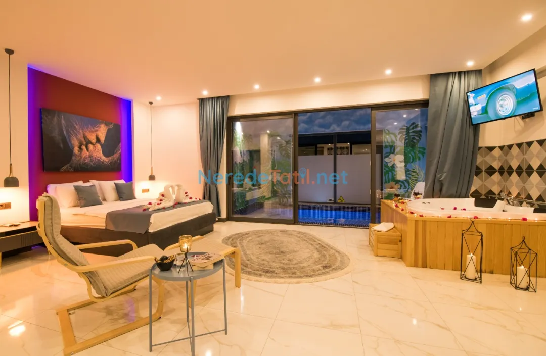 Villa, iki yatak odası ve iki banyosu ile 4 kişilik konaklama kapasitesine sahiptir. Ana yatak odasında çift kişilik yatak, diğer odada ise iki tek kişilik yatak bulunmaktadır. Villada ayrıca jakuzi ve sauna gibi lüks olanaklar da mevcuttur.