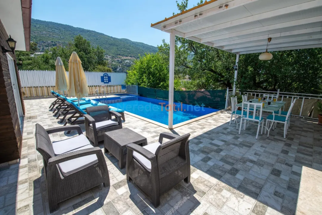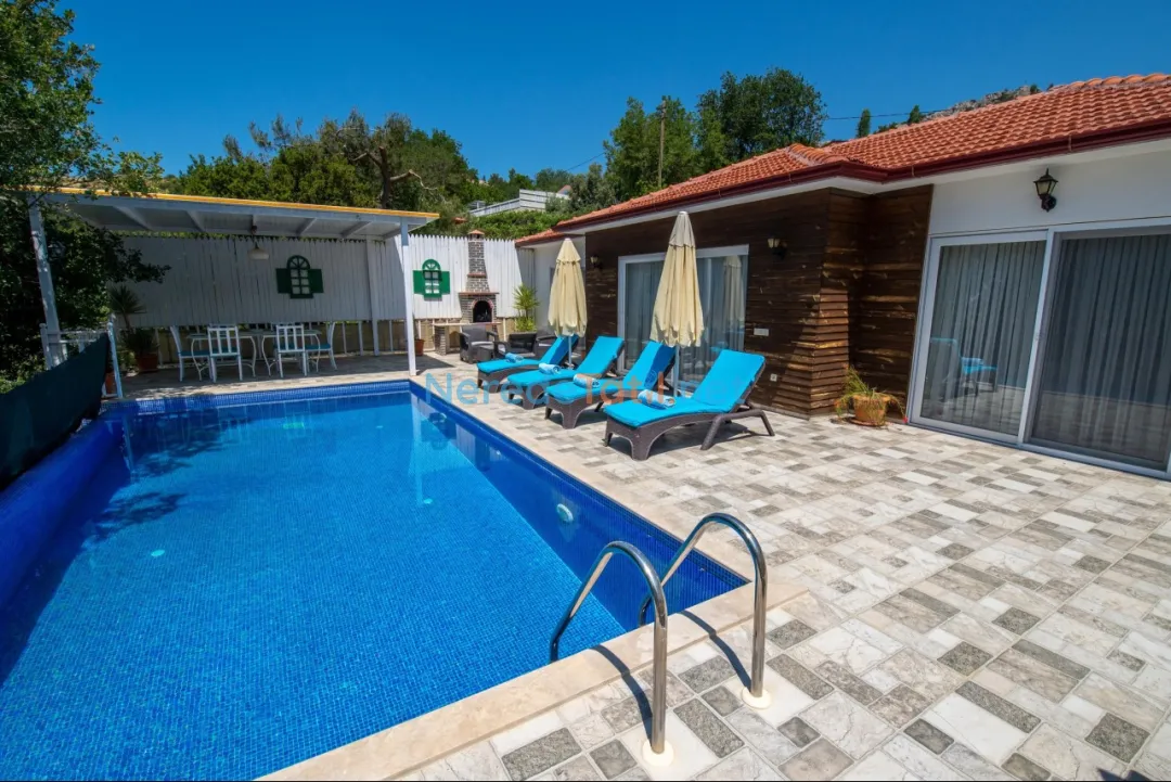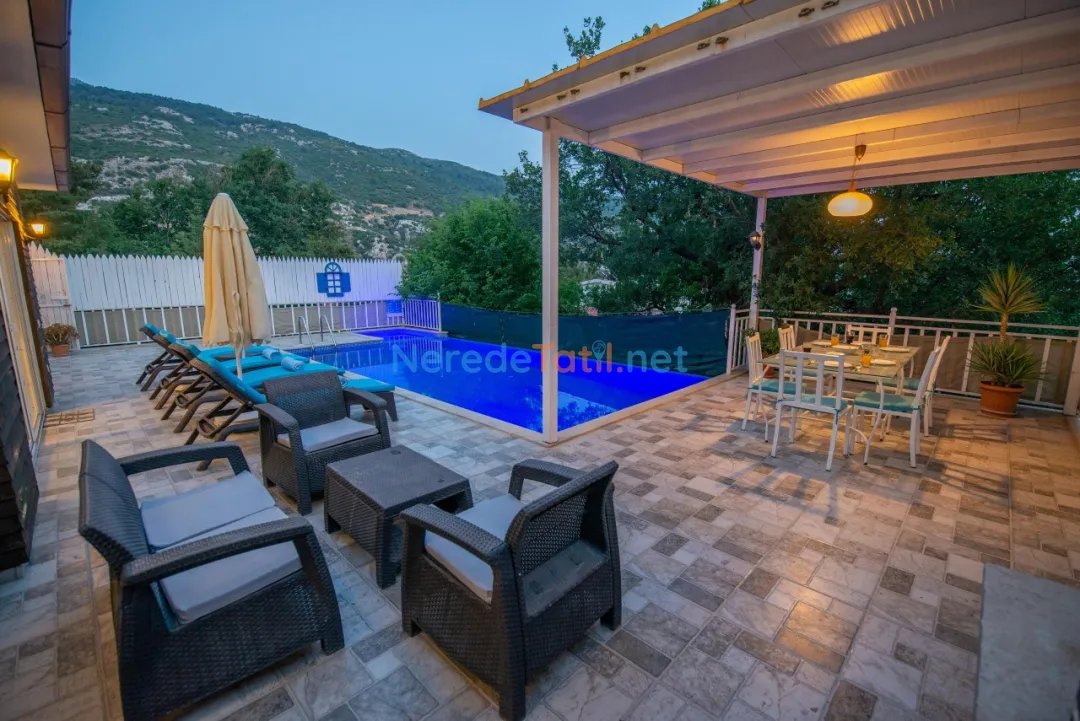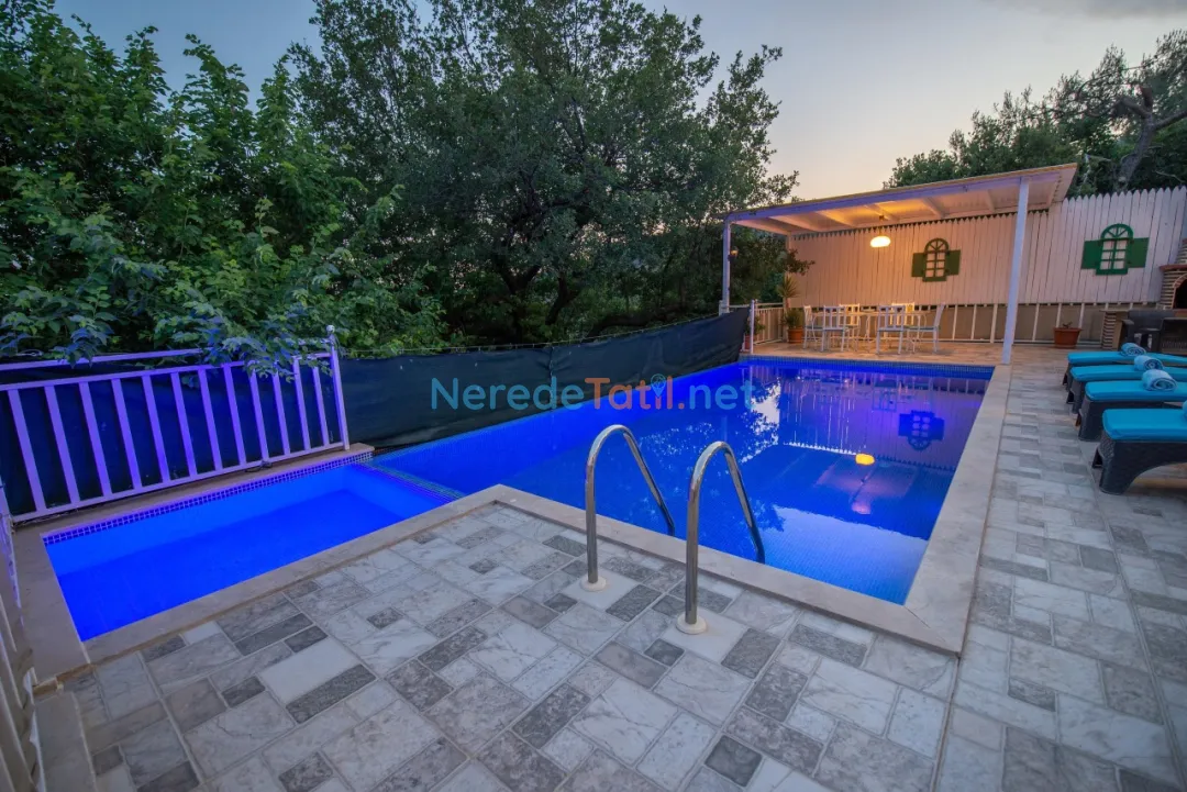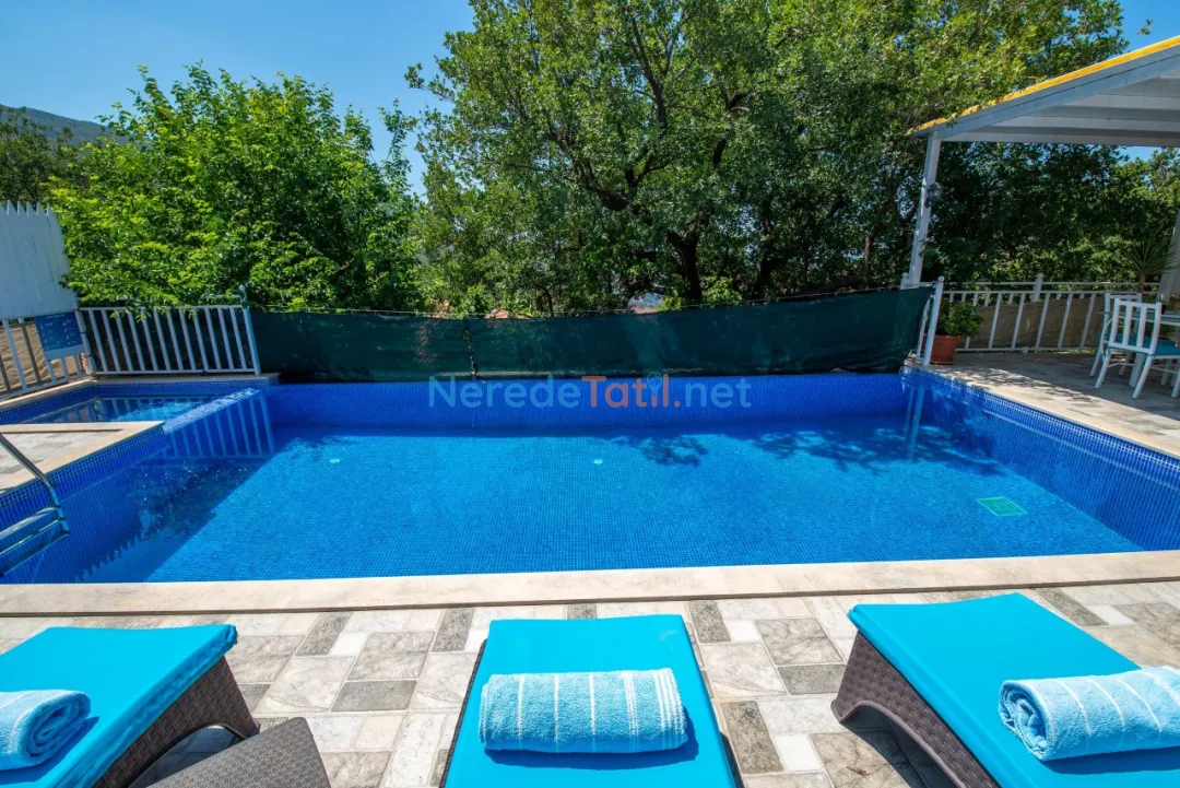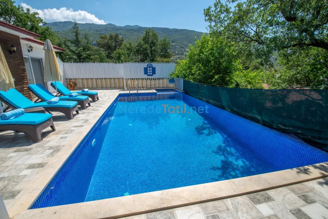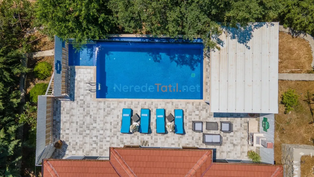 Villanın geniş ve korunaklı özel havuzu, 4 metre eninde, 8 metre boyunda ve 1.55 metre derinliğe sahiptir. Çocuklar için ise 2x2 metre ölçülerinde ve 60 cm derinliğinde bir çocuk havuzu mevcuttur. Havuz etrafındaki doğa manzarası eşliğinde barbekü keyfi yapabilir, tamamen izole bir ortamda dinlenebilirsiniz.