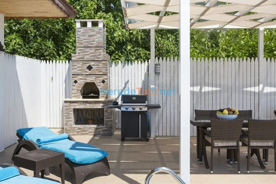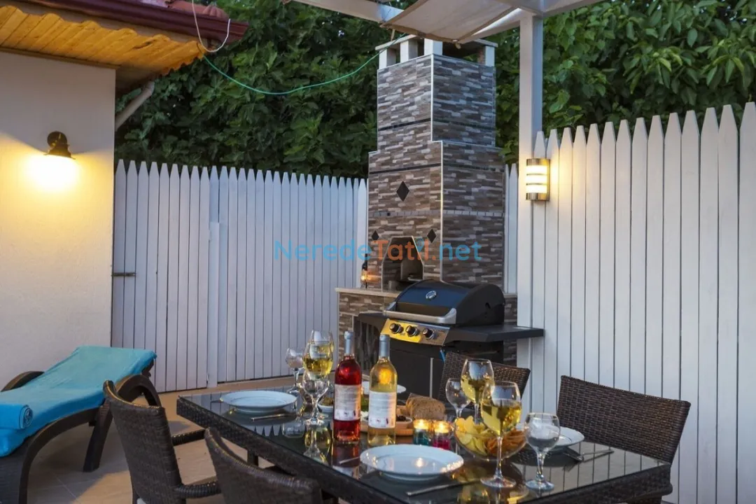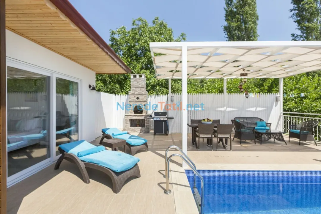 Villanın en dikkat çeken özelliklerinden biri, özel yüzme havuzudur. Havuzun boyu 8 metre, eni 4 metre ve derinliği 1.5 metredir, bu da konuklara serinletici bir yüzme keyfi yaşama imkanı sunar. Geniş bahçesinde, doğanın tadını çıkarabileceğiniz keyifli vakit geçirebilirsiniz.