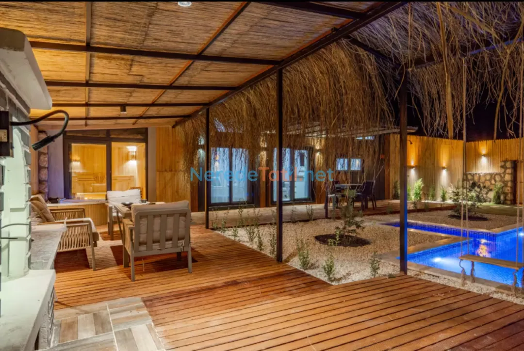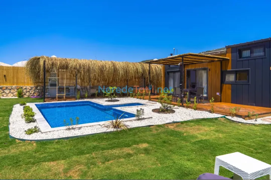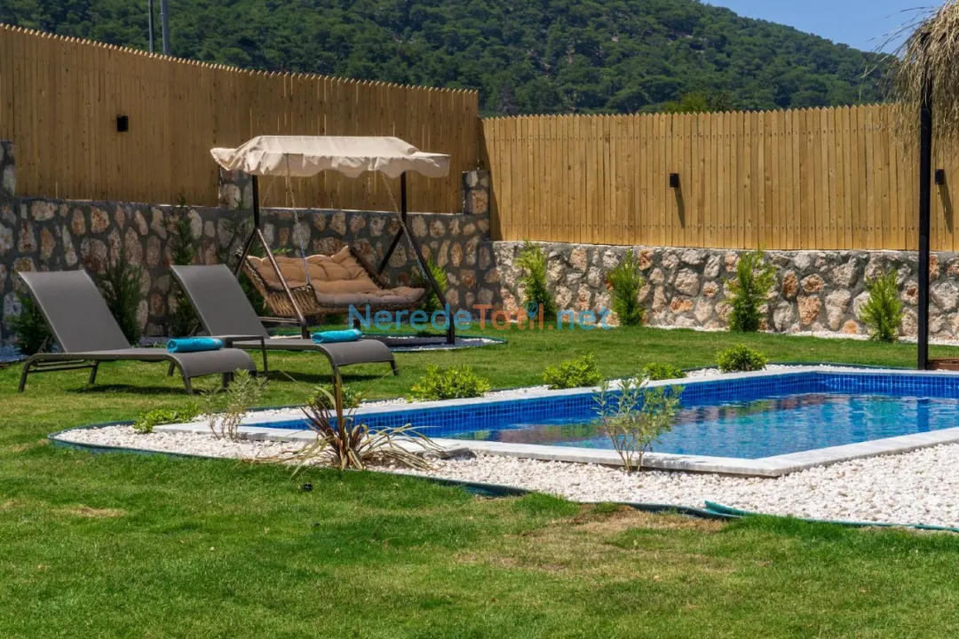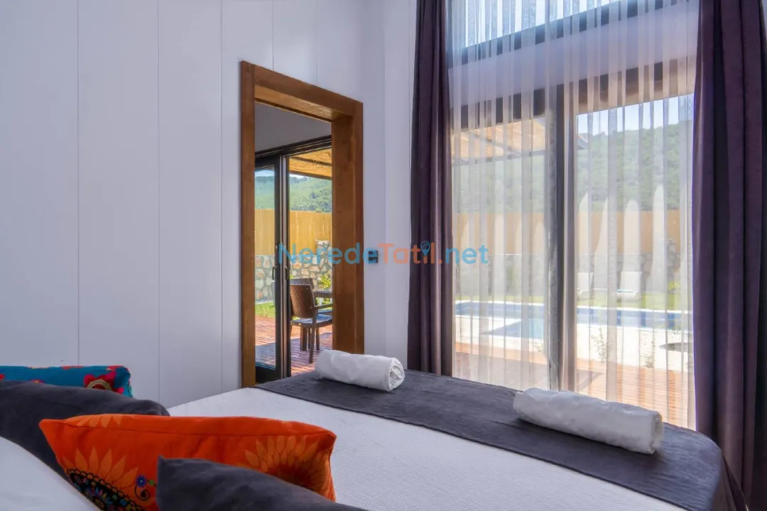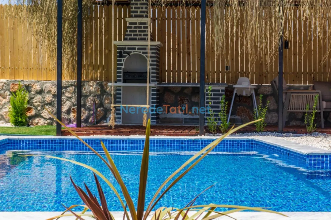 Villada iki geniş yatak odası ve iki banyo bulunmaktadır. Her iki yatak odasında da konforlu çift kişilik yataklar yer alır. Villanın 4 metre eninde, 6.5 metre boyunda ve 1.55 metre derinliğindeki havuzu, yüzme keyfini doyasıya yaşamanız için tasarlanmıştır. Çocuk havuzu olmayan villa, muhafazakar ve doğa manzaralı yapısıyla huzurlu bir tatil sunar.