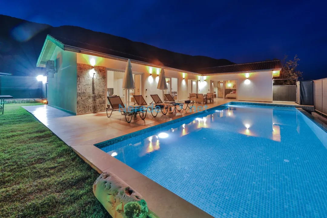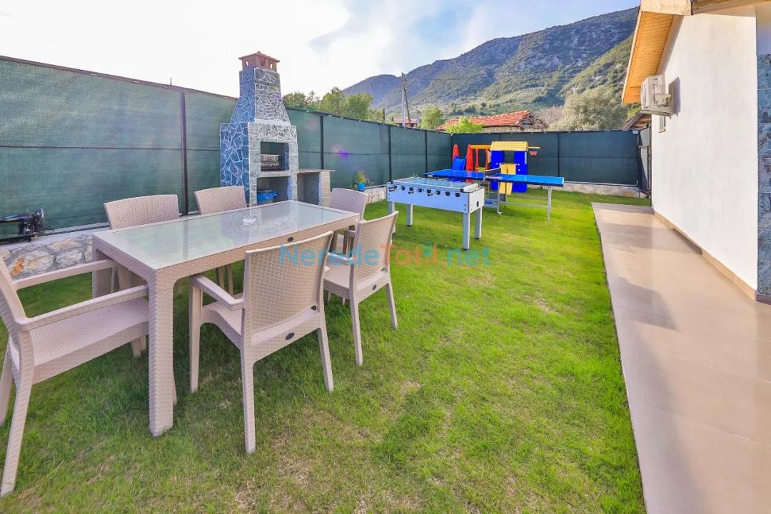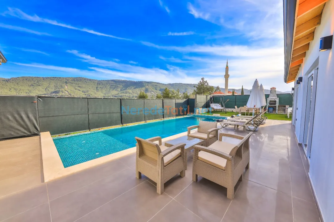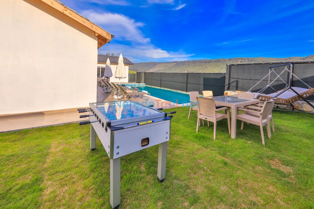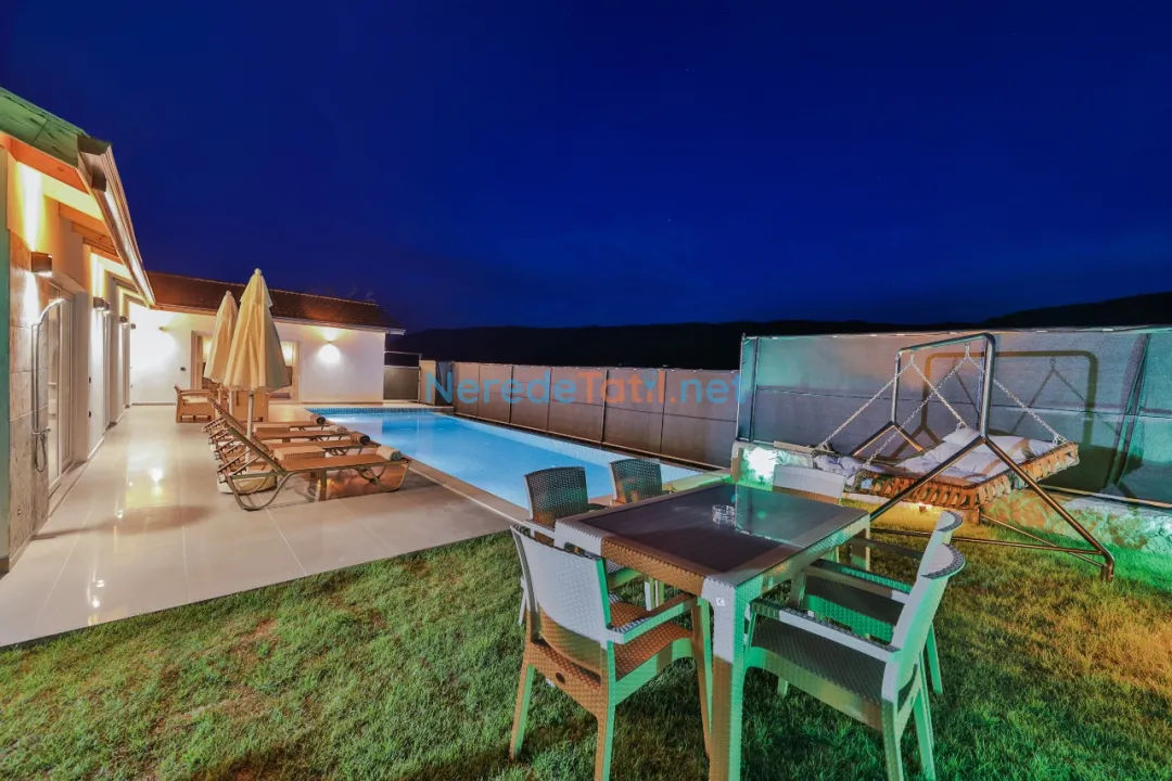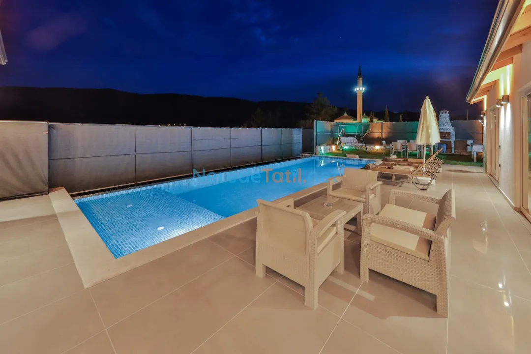 Villanın geniş ve özel yüzme havuzu, 4 metre genişliğinde ve 11 metre uzunluğundadır, derinliği ise 1.55 metre olarak tasarlanmıştır. Havuz, dış etkenlerden korunaklı yapısı sayesinde mahremiyet sunar. Bahçede BBQ - Mangal alanı, ailenizle keyifli zamanlar geçirmenize olanak tanır.