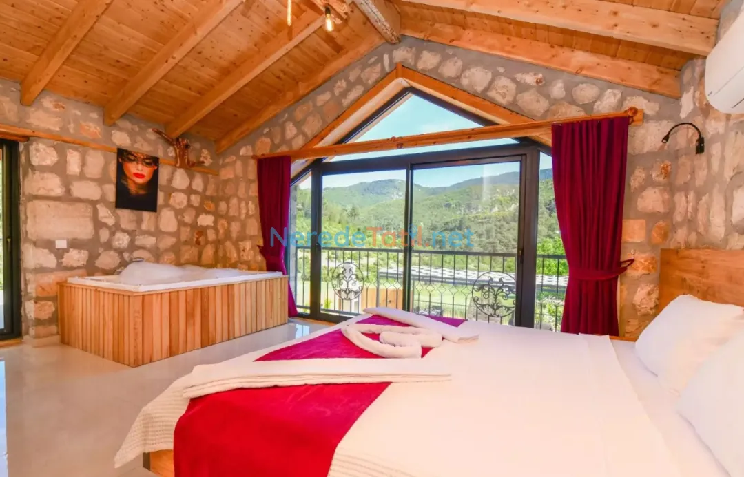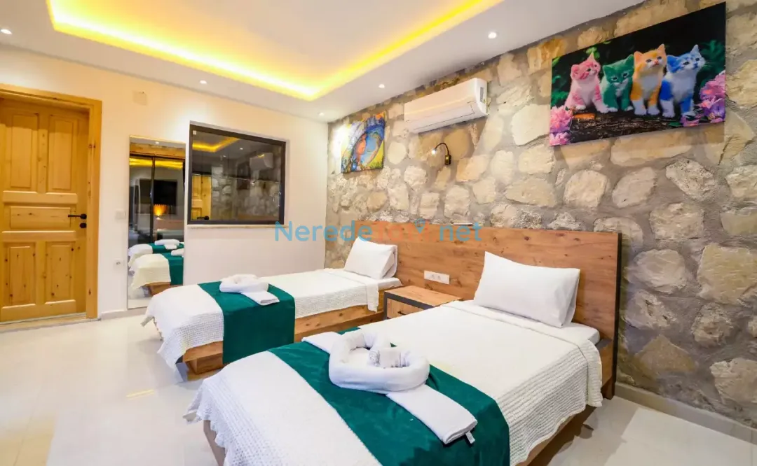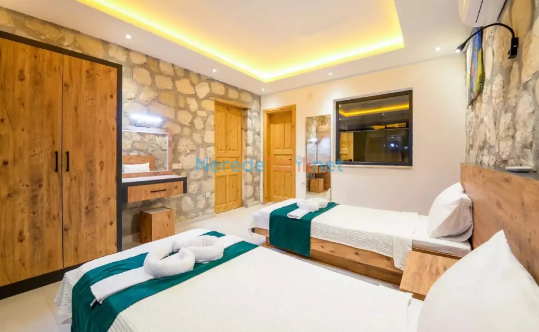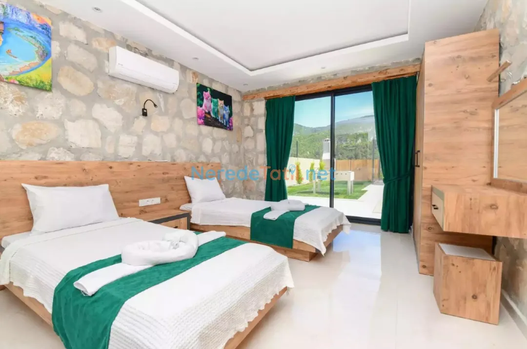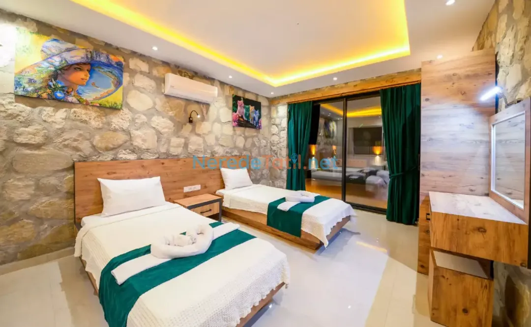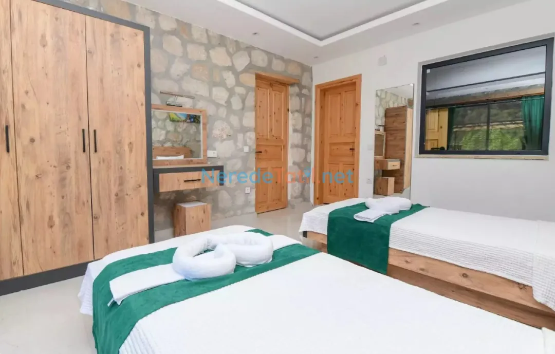 Sarıbelen'in huzur dolu atmosferinde, doğayla baş başa kalabileceğiniz bu lüks villa, tatilcilere eşsiz bir deneyim sunuyor. Toplam dört kişi kapasiteli olan bu villada, iki yatak odası ve iki banyo bulunmaktadır. Bir odada çift kişilik yatak, diğer odada ise iki tek kişilik yatak yer almakta ve konforunuz için her detay düşünülmüştür.