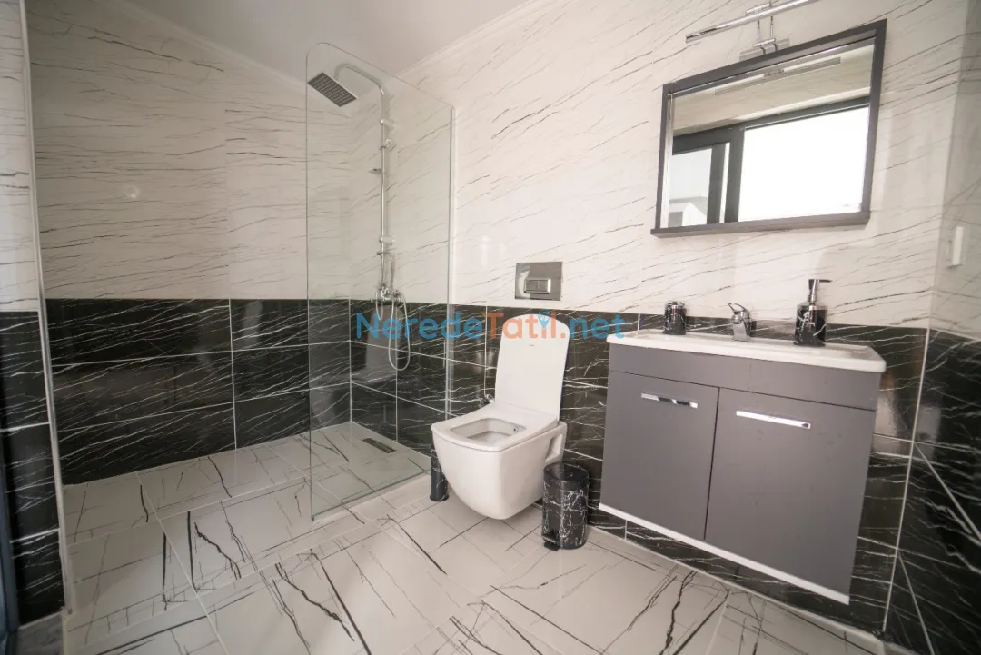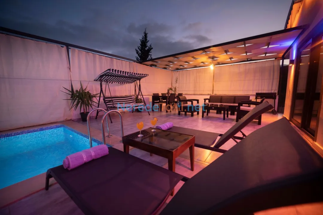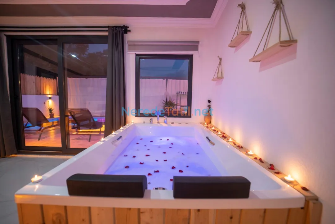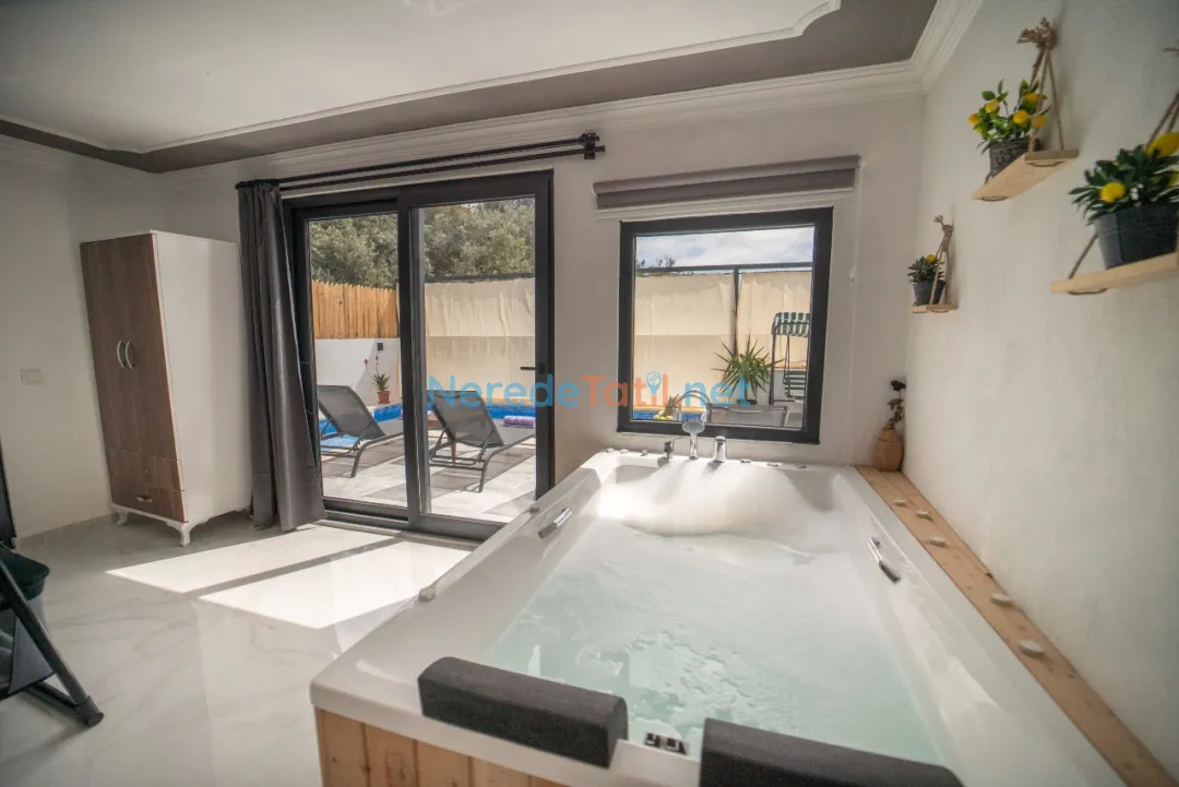 Villanın içinde yer alan jakuzi, size günün yorgunluğunu atma fırsatı sunarken, dışarıdaki 300 cm x 700 cm ölçülerindeki korunaklı özel havuz ise tatilinize serinlik katacaktır. Havuzun derinliği 150 cm olarak tasarlanmıştır, bu da güvenli bir yüzme deneyimi sağlar.
