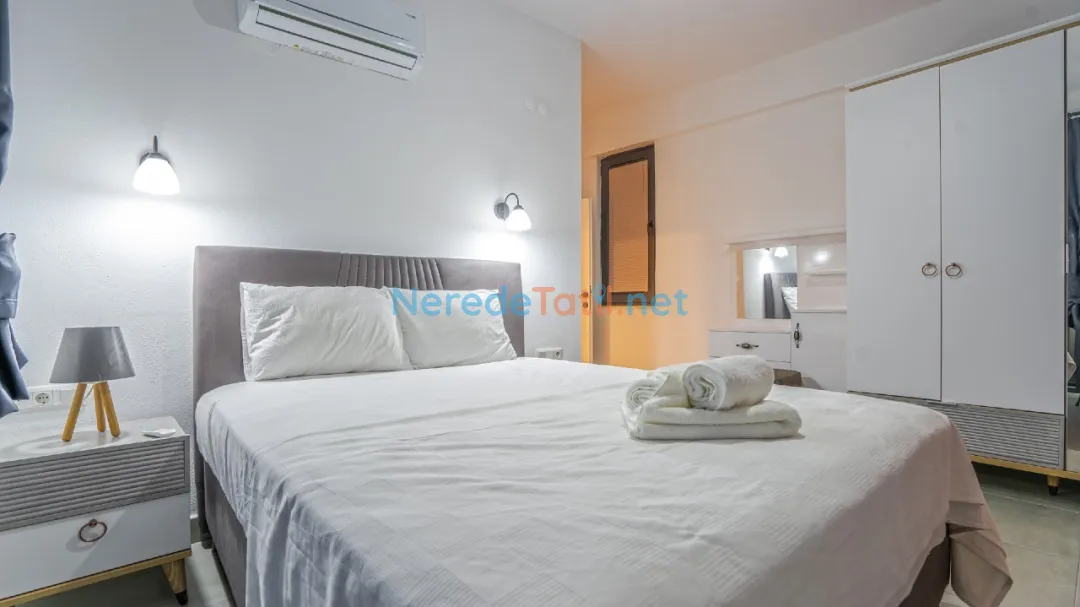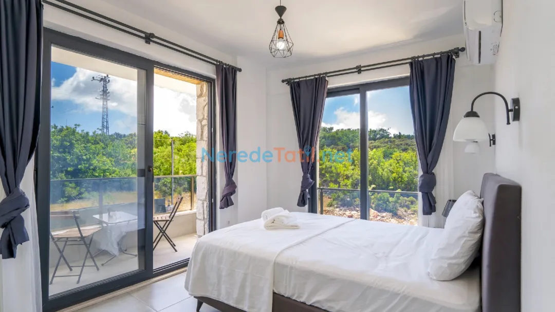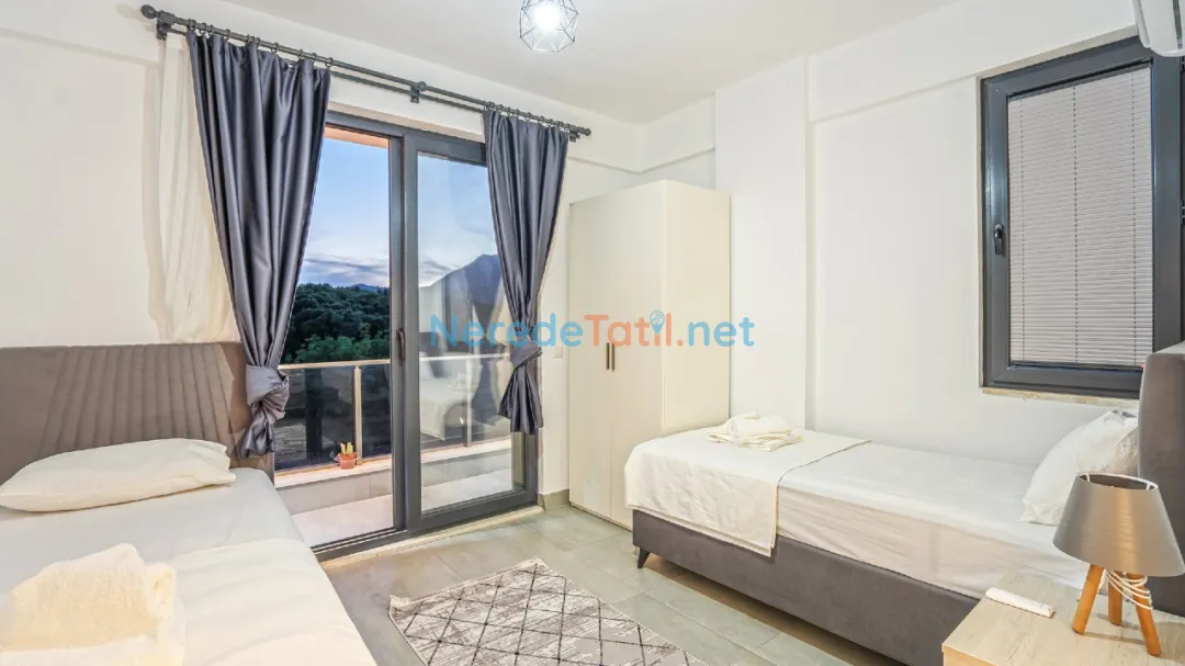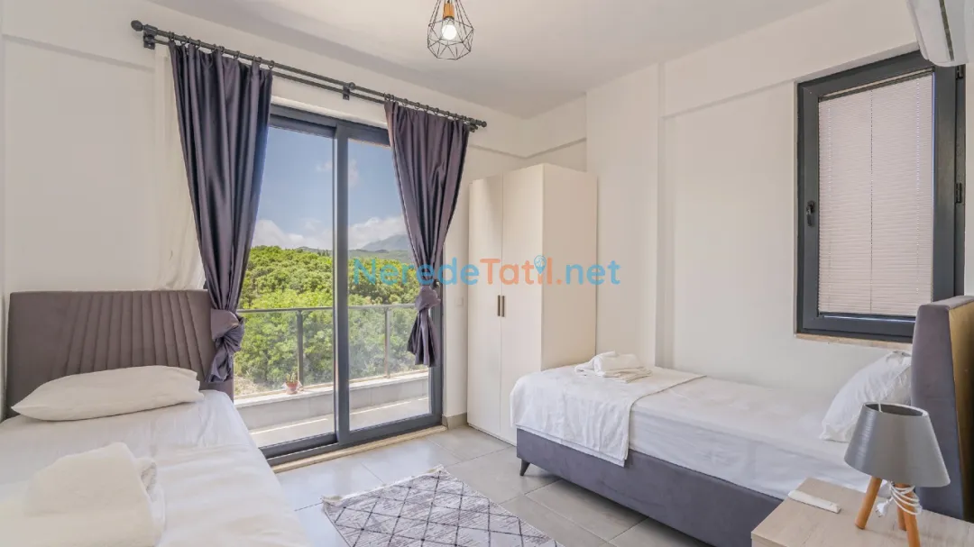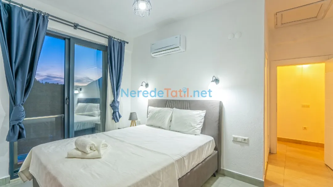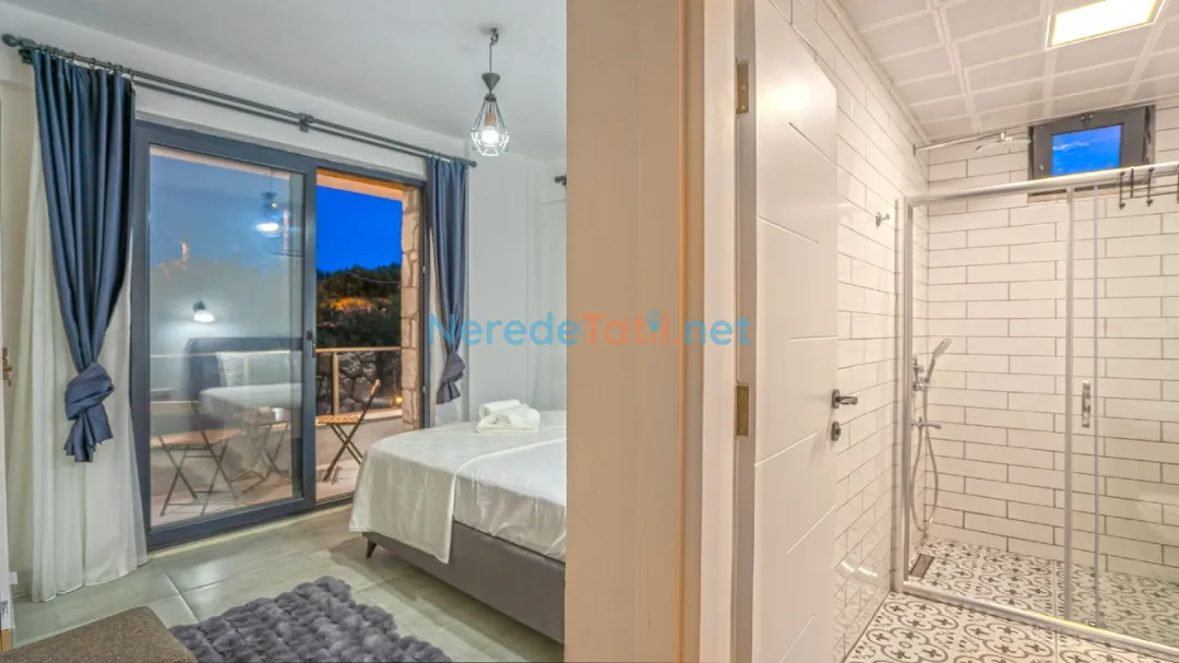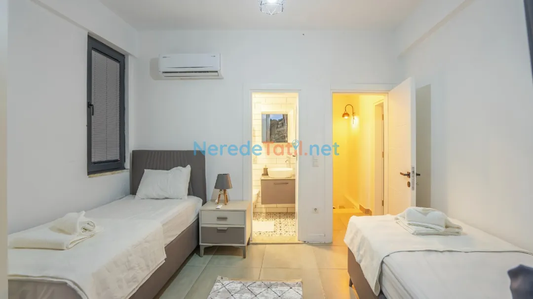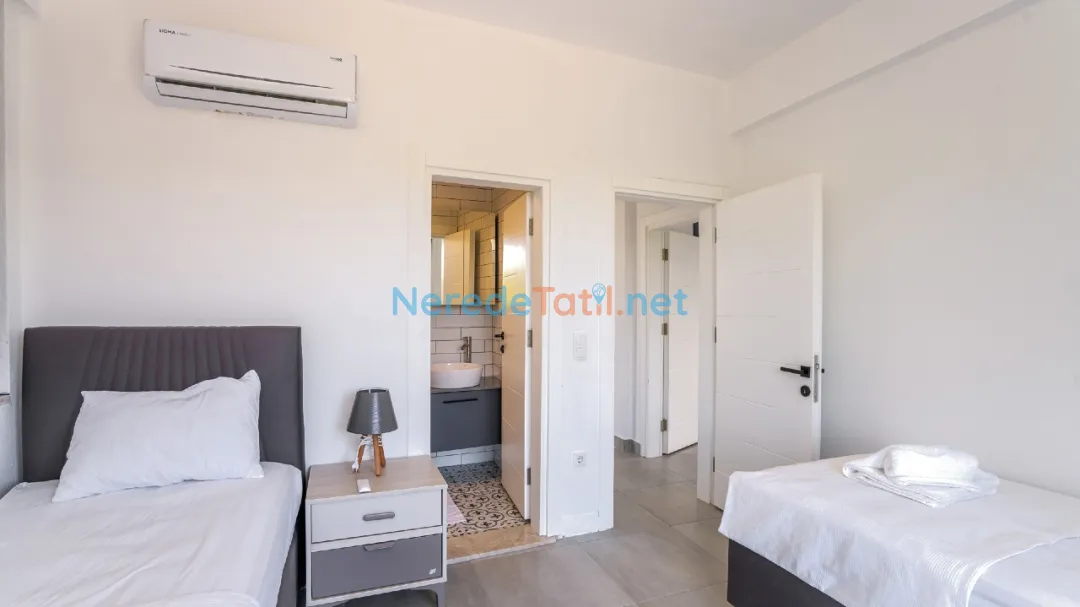 Villamızda iki yatak odası ve iki banyo bulunmakta olup dört kişiye kadar konaklama kapasitesi sunmaktadır. Yatak odalarından biri çift kişilik yatakla donatılmışken, diğer odada iki tek kişilik yatak mevcuttur. Bu konforlu tasarım, ailece veya arkadaş grubuyla tatil yapmak isteyenler için idealdir.