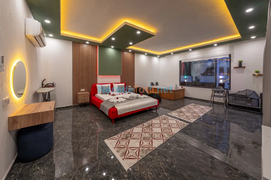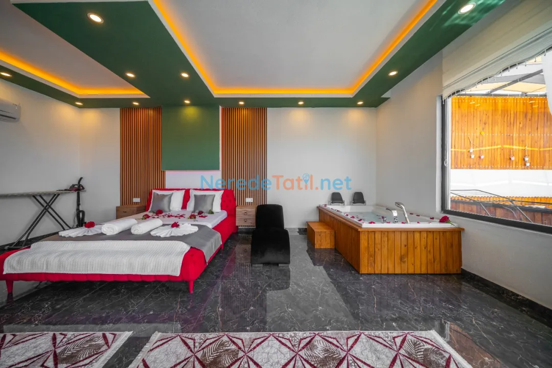 Villa, bir adet çift kişilik yatak ile donatılmıştır ve ihtiyacınız olan tüm konforu sunar. Ayrıca doğa manzaralı olması, tatilinizi huzur dolu bir atmosfere taşır. Jakuzide rahatlayabilir, masa tenisi ile eğlenceli vakit geçirebilirsiniz. Villanın BBQ alanı ise, sevdiklerinizle keyifli akşamlar geçirmenize olanak tanır.