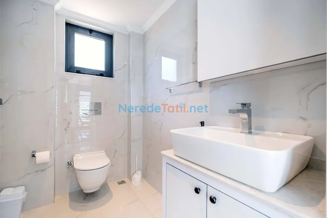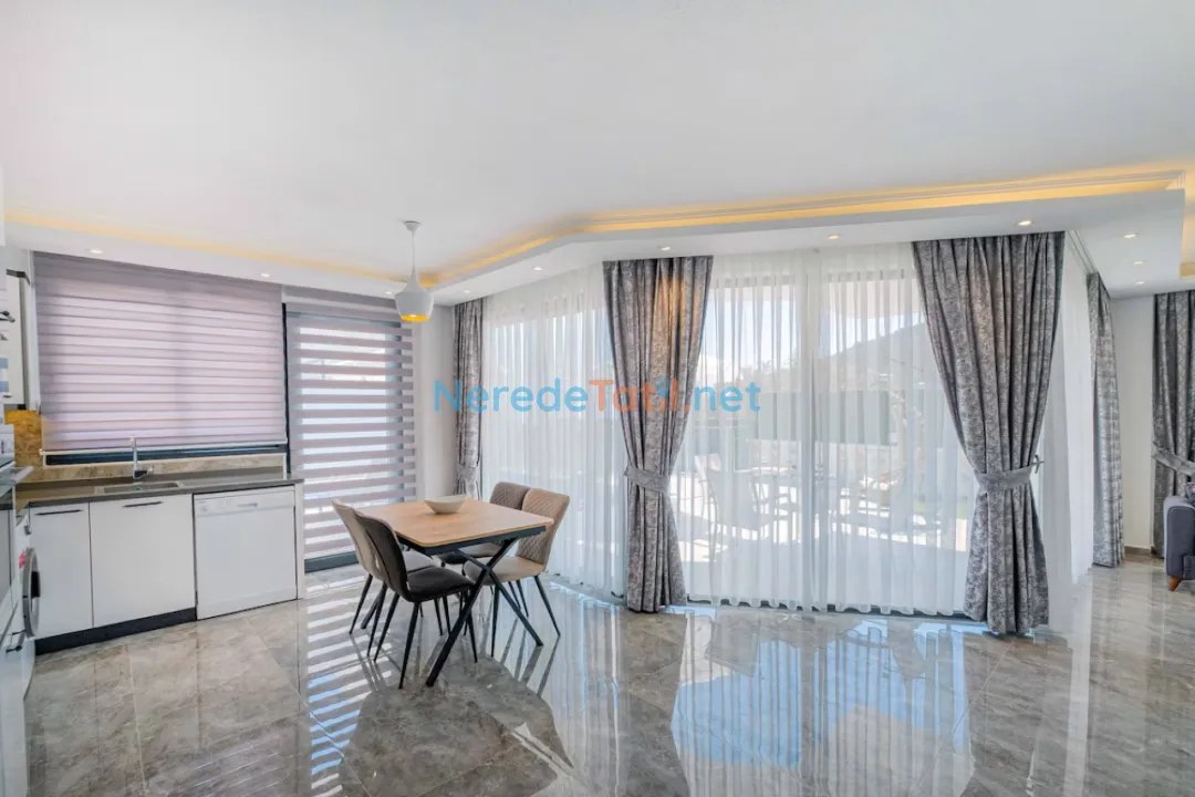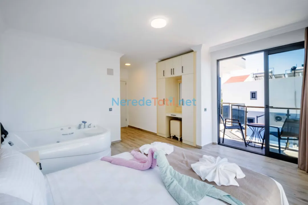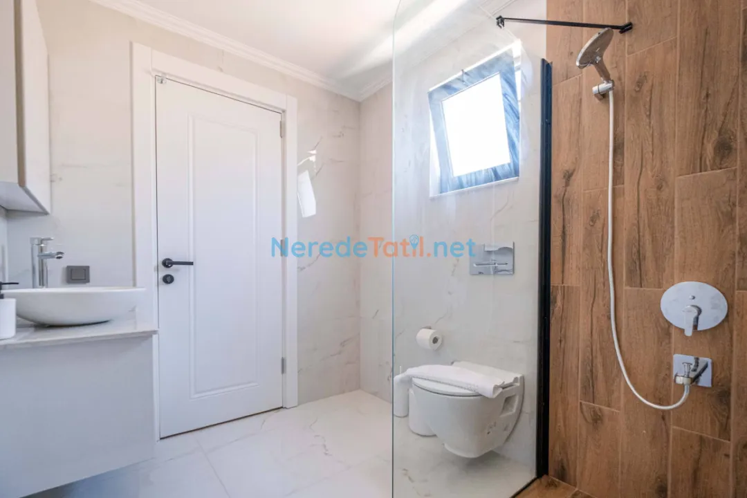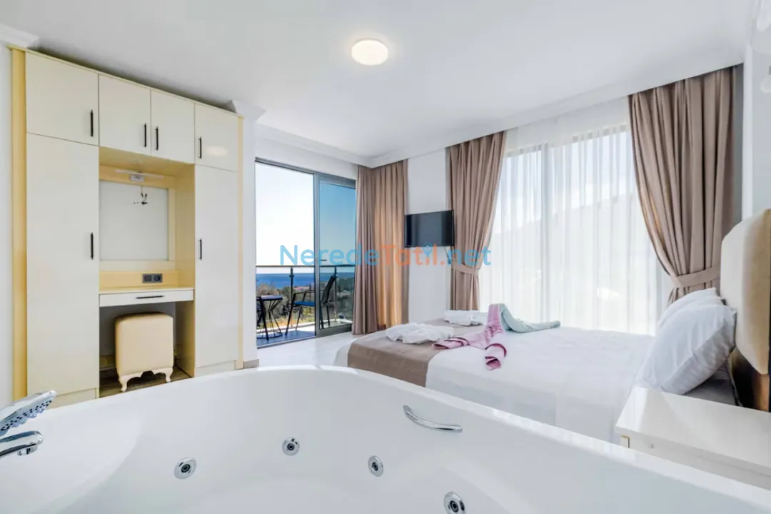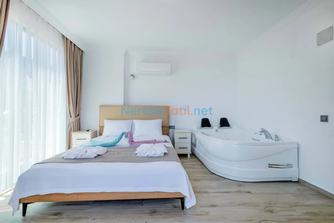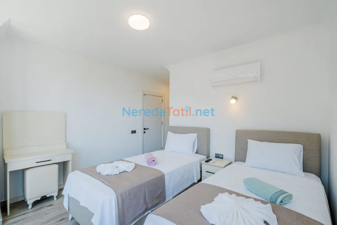 Kalkan'da konumlanmış bu lüks villa, muhteşem deniz manzarası ve ferah ortamıyla misafirlerine unutulmaz bir tatil deneyimi sunuyor. Villada iki yatak odası ve üç banyo bulunmaktadır, bu da dört kişiye kadar konforlu konaklama imkanı tanır. Odalardan biri çift kişilik yatak, diğeri ise iki tek kişilik yatak ile donatılmıştır.