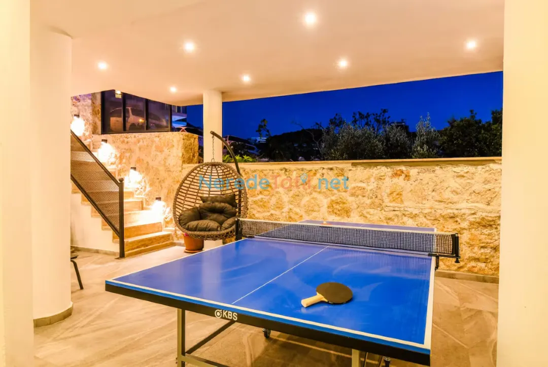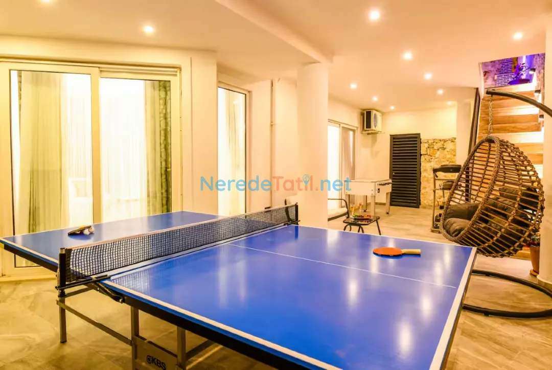 Villanın sunduğu jakuzi ve sauna olanakları, tatilinize lüks bir dokunuş katarken, hamam da rahatlamanız için mükemmel bir seçenek sunar. Ayrıca, langırt ve masa tenisi gibi aktivitelerle eğlenceli vakit geçirebilirsiniz.