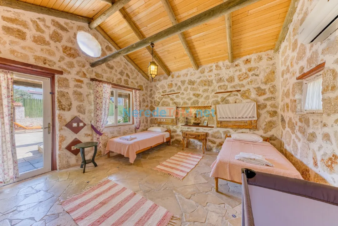 Villada 2 yatak odası ve 2 banyo bulunmaktadır. Konforunuz için bir adet çift kişilik yatak ve iki adet tek kişilik yatak mevcuttur. Ayrıca, villanın içinde jakuzi bulunmakta olup, tatiliniz boyunca rahatlamanızı sağlayacak.