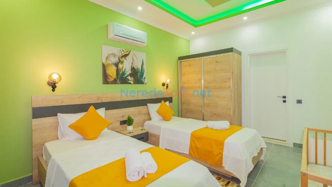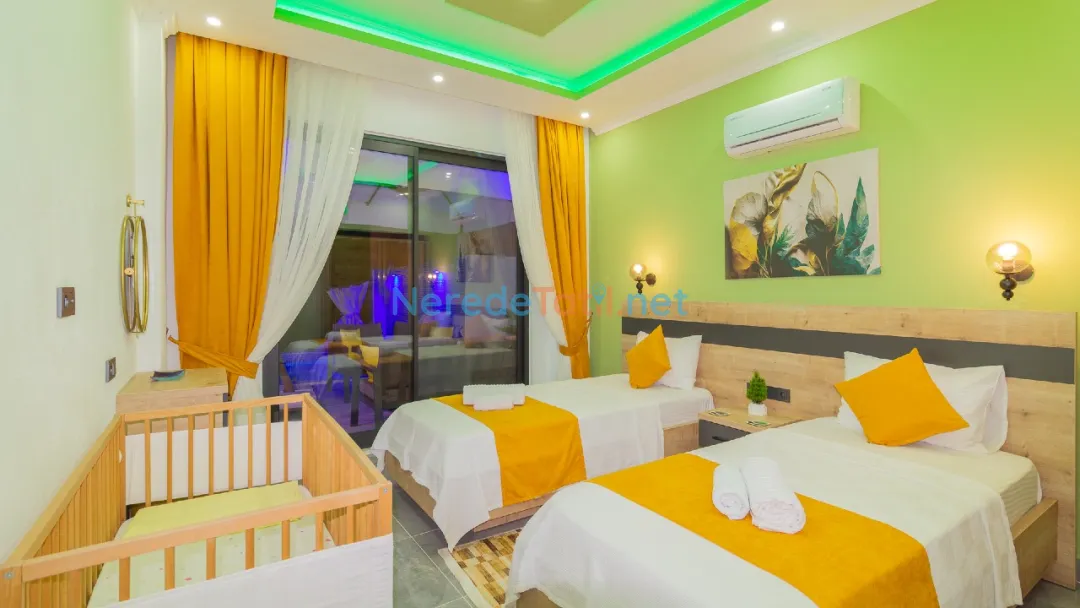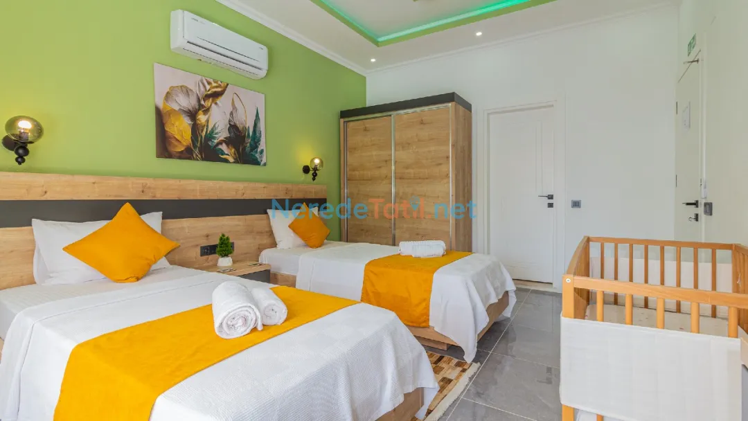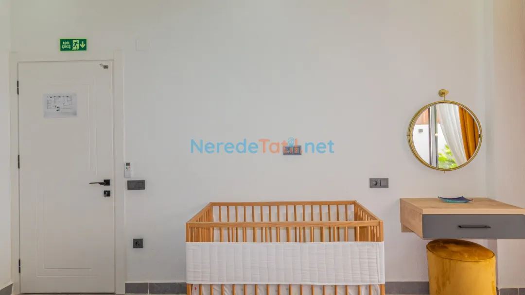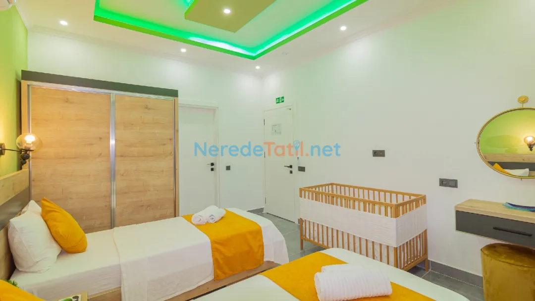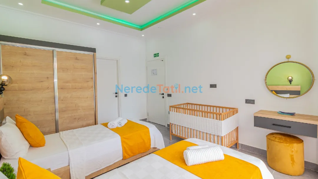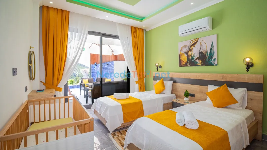 Tatilde rahatlığınız için her detay düşünülmüştür. Villada bir çift kişilik yatak ve iki tek kişilik yatak mevcuttur. Ayrıca, bebekli misafirlerimiz için bir bebek yatağı da bulunmaktadır.