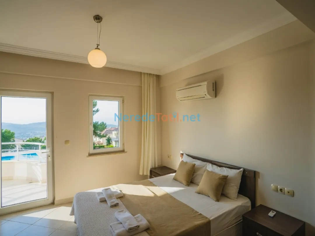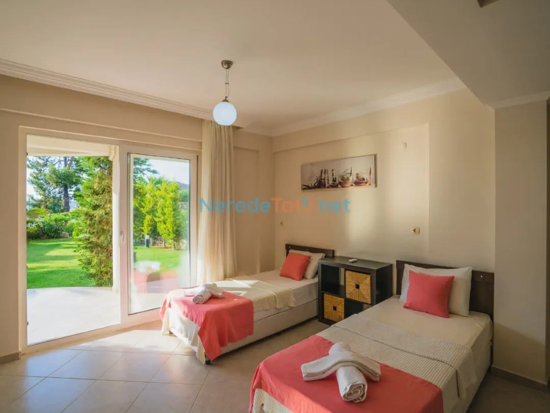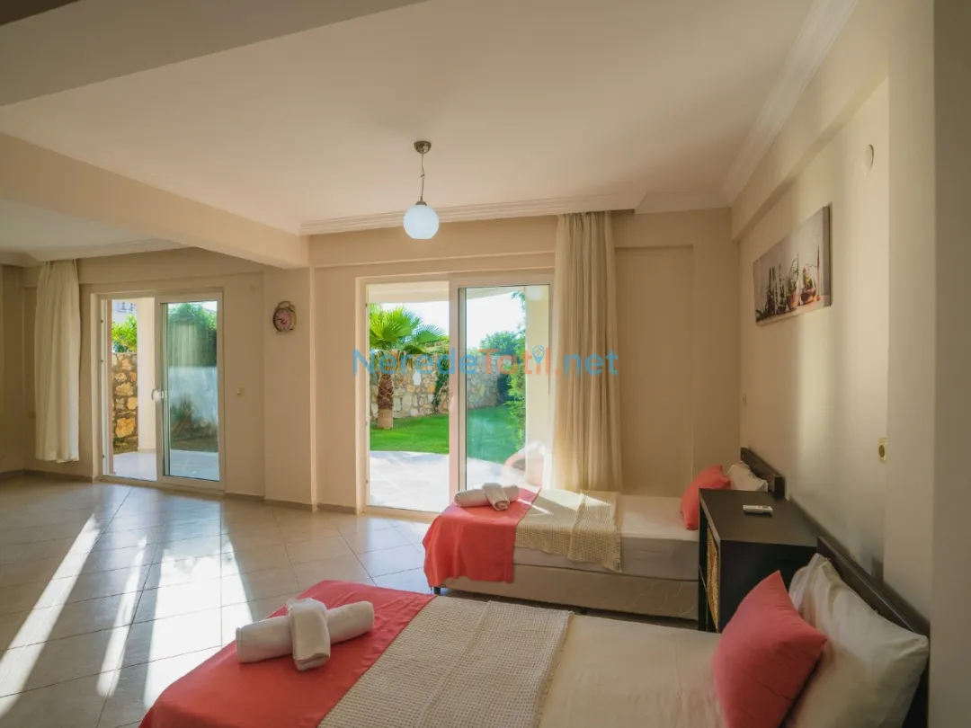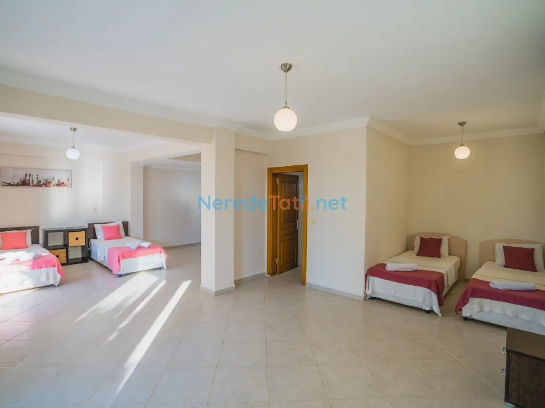 Villada iki adet çift kişilik yatak ve dört adet tek kişilik yatak yer almaktadır. Ayrıca bebekli misafirlerimiz için bir adet bebek yatağı da mevcuttur. Ortak yüzme havuzu, 4 metre genişliği, 8.5 metre boyu ve 1.5 metre derinliği ile tatilinize serinlik katar.