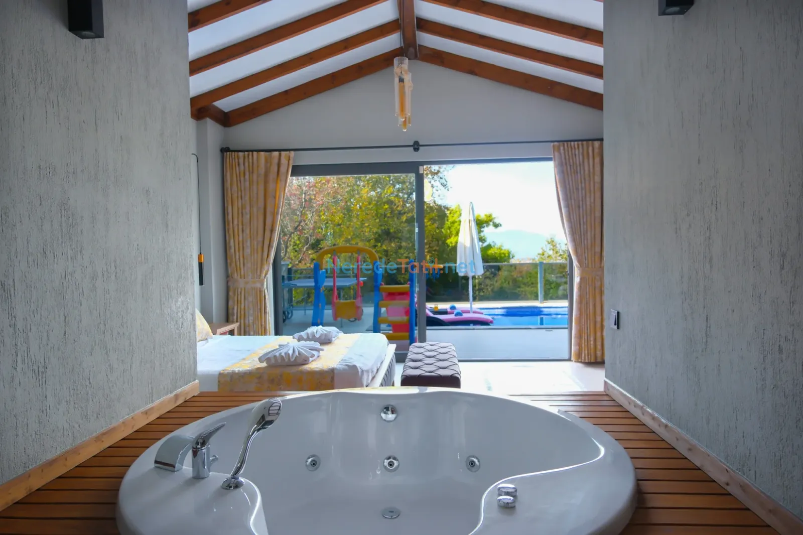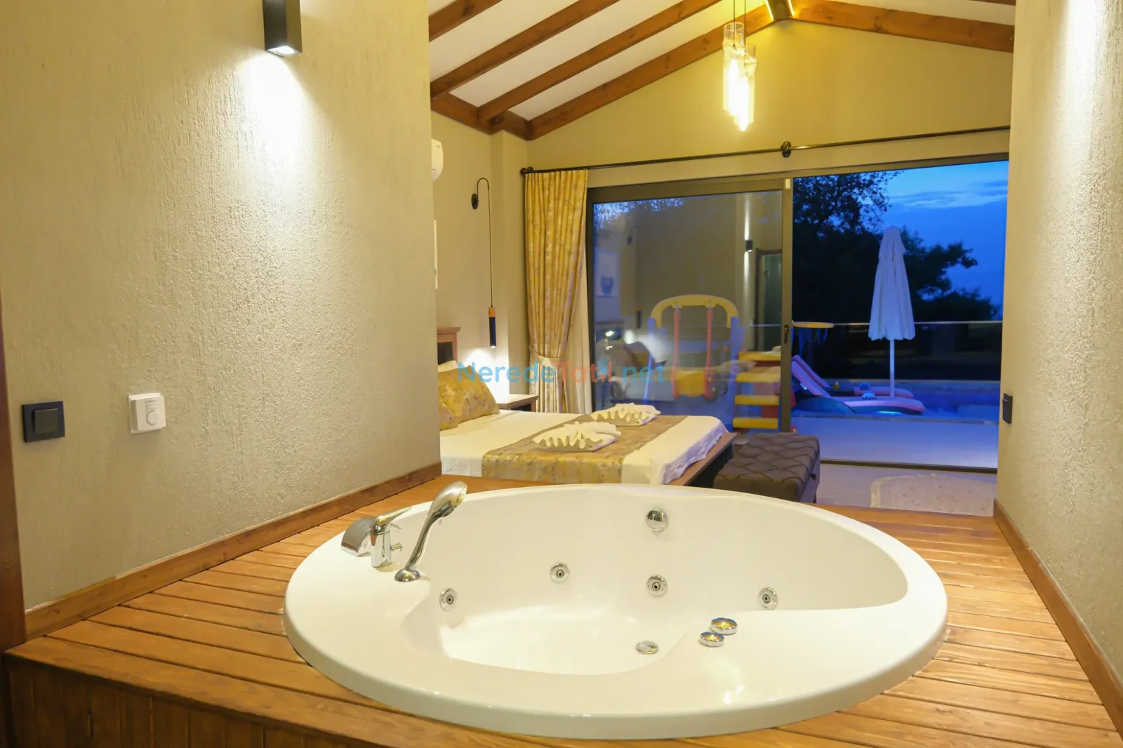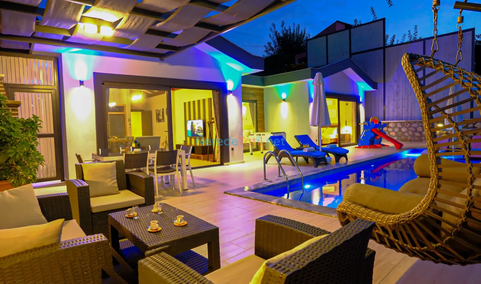 Üzümlü'nün eşsiz doğasında konumlanan bu villa, özel yüzme havuzu ile konuklarına unutulmaz bir tatil deneyimi sunuyor. Villanın havuzu 3.5 metre eninde, 7 metre boyunda ve 1.5 metre derinliğindedir. Doğanın kalbinde yer alan bu gizli cennet, 4 kişilik konaklama kapasitesi ile ideal bir tatil alanı sunmaktadır.